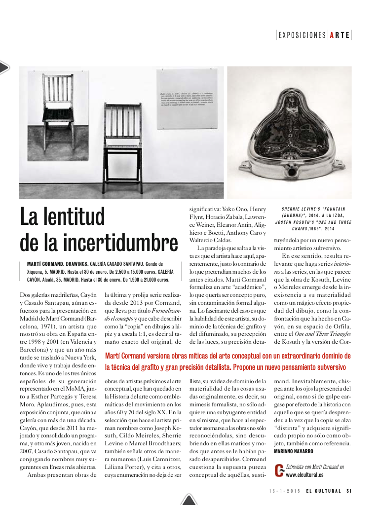 Born in Barcelona in 1970, Martí Cormand lives and works in Brooklyn, New York. Selected exhibitions include: Aldrich Contemporary Art Museum, Ridgefield, CT (2020); Gregory Allicar Museum of Art, Fort Collins, Colorado (2018); Boulder Museum of Contemporary Art, CO; Wilding Cran Gallery, Los Angeles, California (2017); Galería Cayón, Madrid (2015); Galería Casado Santapau, Madrid (2014); Josée Bienvenu Gallery, New York (2013); Portland Museum of Art, Portland, Maine (2011); Arranz-Bravo Foundation, Hospitalet de Llobregat, Barcelona; Galerie Lelong, New York (2010); Aldrich Emerging Artist Award Show, Aldrich Contemporary Art Museum, Ridgefield, CT (2007); Villa Arson, Nice (2006). Public Collections include: Museo Reina Sofia, Madrid; The Alfond Collection of Contemporary Art at Rollins College, Winter Park, FL; Jimenez-Colon Collection, Ponce, PR; Cartin Collection, Hartford, CT; Arte y Naturaleza, Madrid; Ayuntamiento de Alcobendas, Alcobendas, Spain; Caja Madrid, Madrid; Fundacio La Caixa, Barcelona; Fundacio Vila Casas, Barcelona; Honda, La Garriga, Spain; Museum of Modern Art, New York; Progressive Corporation, Mayfield Village, OH.