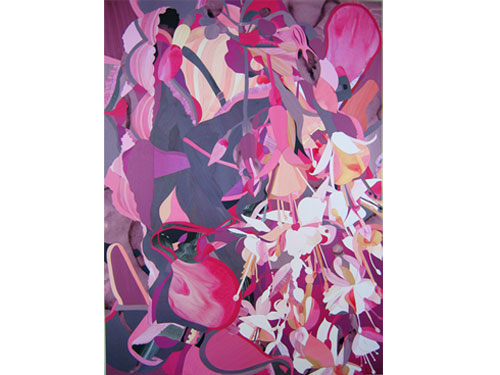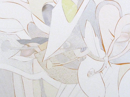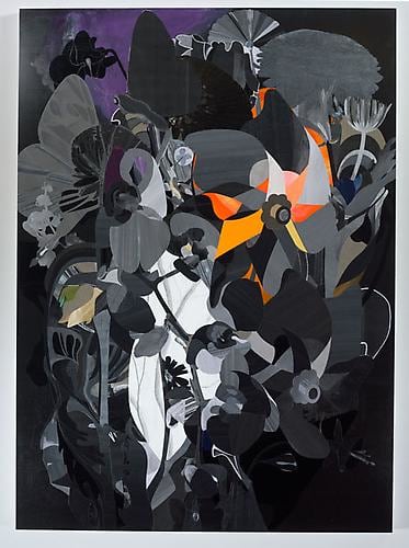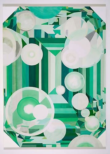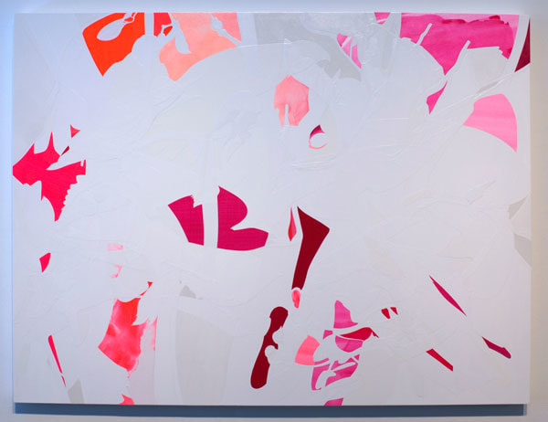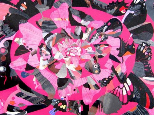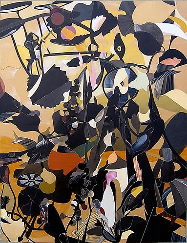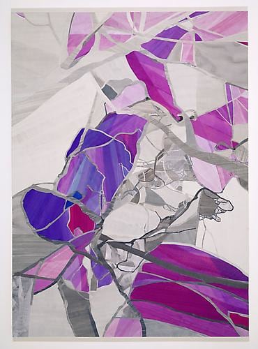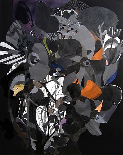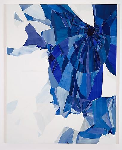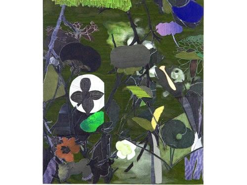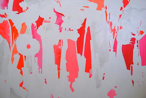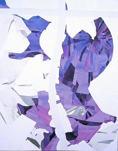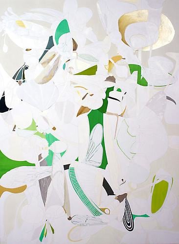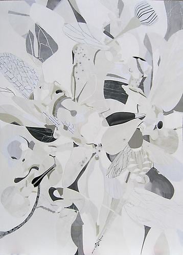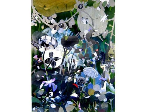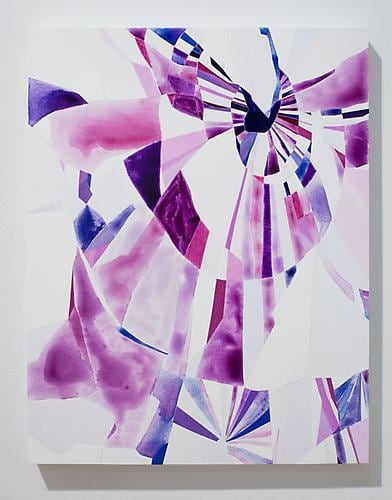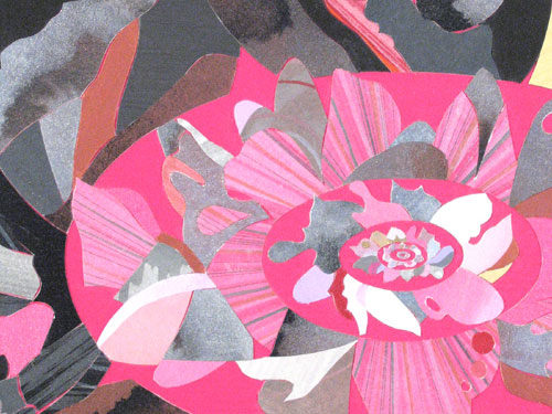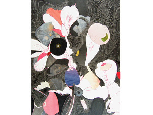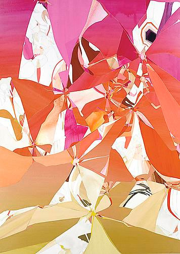 Aaron Wexler often uses the sense of a dreamscape as a way of annexing the language of abstraction and employs subtle opposites (guns and flowers, the organic and geometric) as a way of paraphrasing the language of the subconscious. His imagery is vaguely familiar and yet strangely enigmatic. While visually dexterous, Wexler’s work is also inescapably material and object-like. The collage technique is nuanced and layered, elusive and reductive. Layers are built up in order to subtract from the overall image and create voids in the landscape of the imagery. Other areas use graphic injections of colour to define positive and negative outlined shapes.
