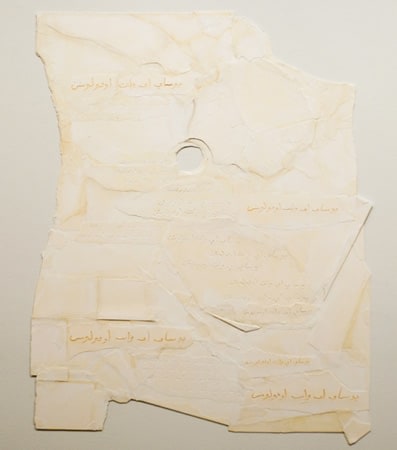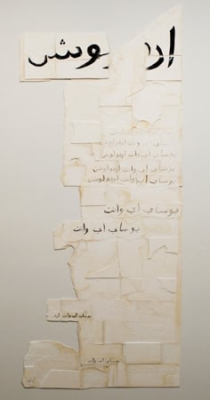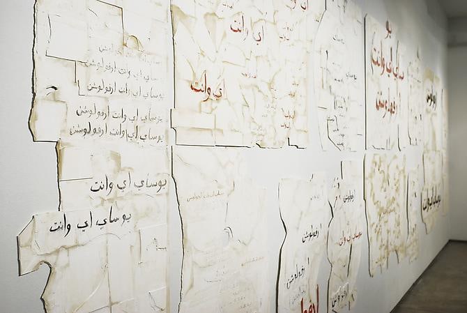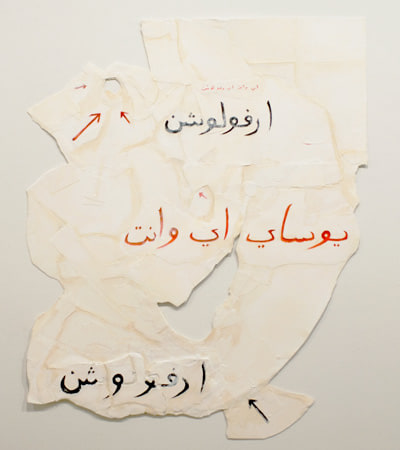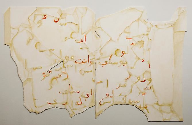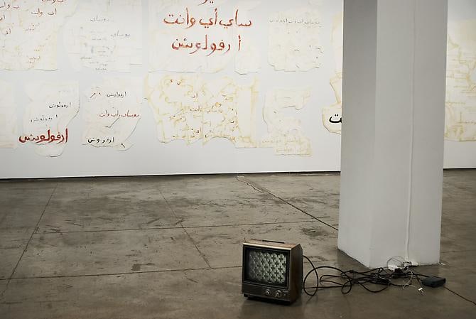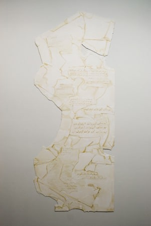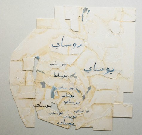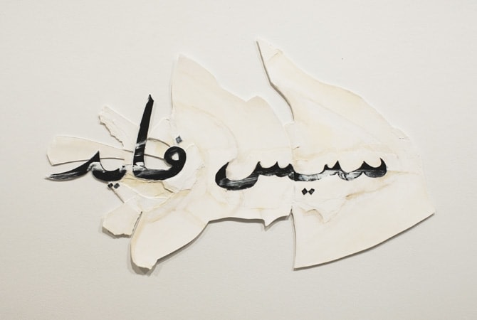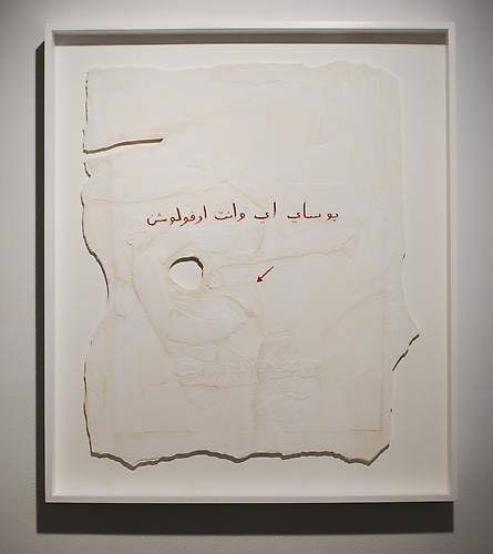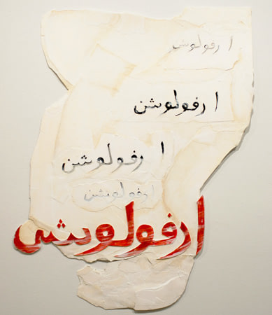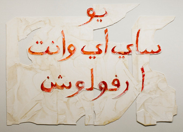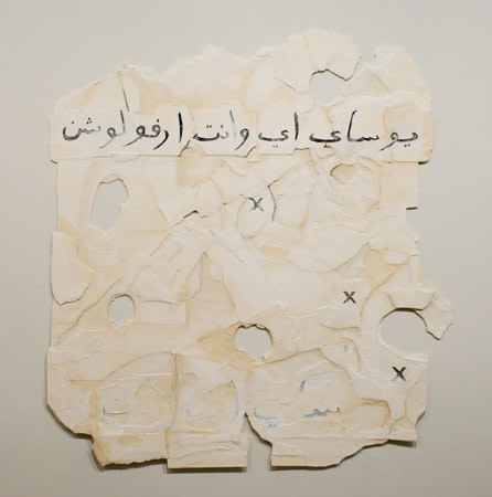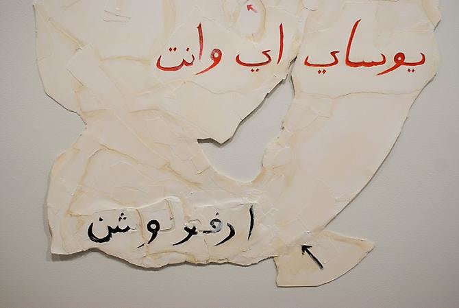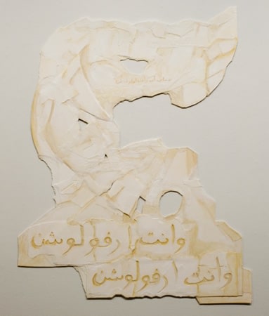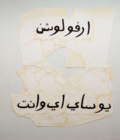 As in previous work, Daou uses English transcribed phonetically into Arabic to formalize not only her own cultural indeterminacy, but also the gap, so frequently embodied by political rhetoric, between utterance and understanding. Variously layered, cut-out, and gessoed over, the repeated mantra of the show’s title (ˈyü ˈsā ˈī ˈwȯnt ˈā ˌre-və-ˈlü-shən) is many things: the refrain from a popular song misquoted in the manner of a foreigner who has heard, but perhaps not fully understood, the lyrics; an imperative to pronounce a phrase that is then parroted incessantly in different fragmented forms (you say: “I want a revolution”); a declarative statement registering the exterior attribution of desire to a person or people, as, for instance, in the phrase, “such and such people desire to live freely” (YOU say I want a revolution [but who are you to say that?]).