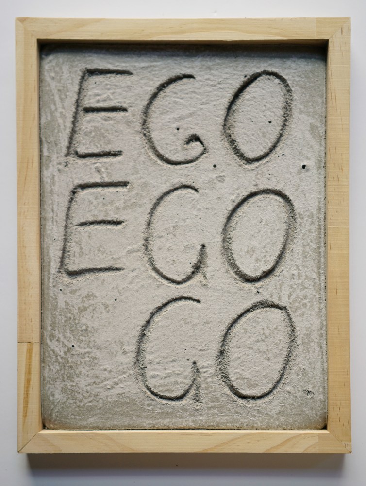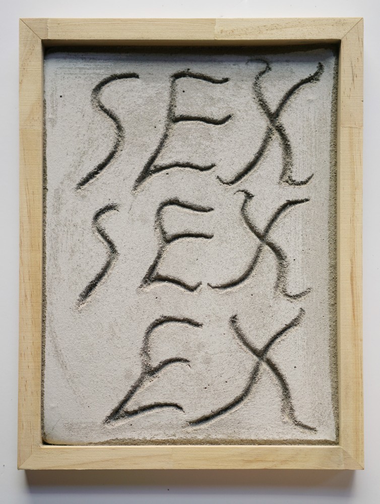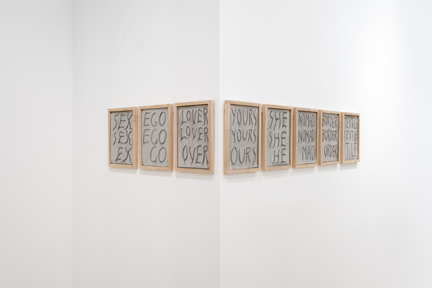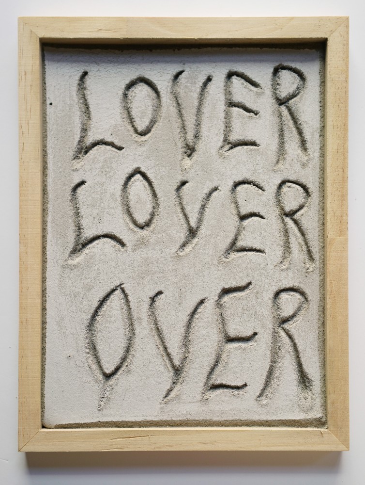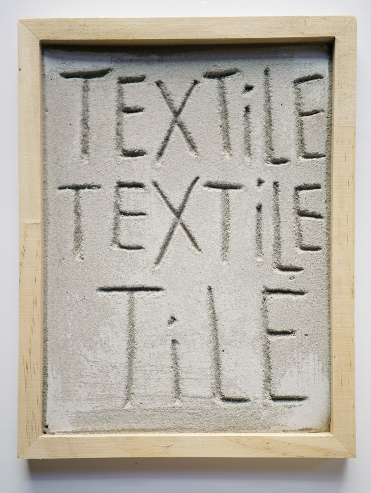 Visions, inspired by dreams, surrounding life, or drawn from the unconscious, are at the heart of Mia Enell’s paintings. She  plays with words through images, her figures of speech are free associations on canvas. Loosely Knit is a literal rendering of its title: a system of interconnected discrete units freed from instrumental utility or significance. Alina Bliumis’ text-based sculptural works, Concrete Poems, recall street wall scribbles, graffiti, and absurdist poetry. They consist of words literally inscribed on  tablets of wet concrete. Border/Order; Textile/Tile; Lover/Over: the playfulness of crossword puzzles often leads to unexpected existential interrogations.  Using ready made expressions or repetitions of a single word, Elvire Bonduelle utilizes a repertoire of images and objects with apparently joyful potential. Made of words carefully calligraphed -in her own hand-designed font- over colorful wave patterns, Bonduelle’s paintings revel in their own obviousness.