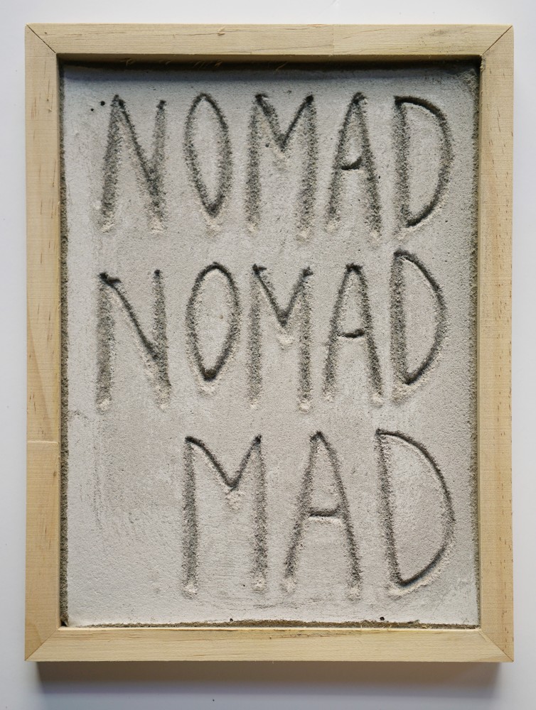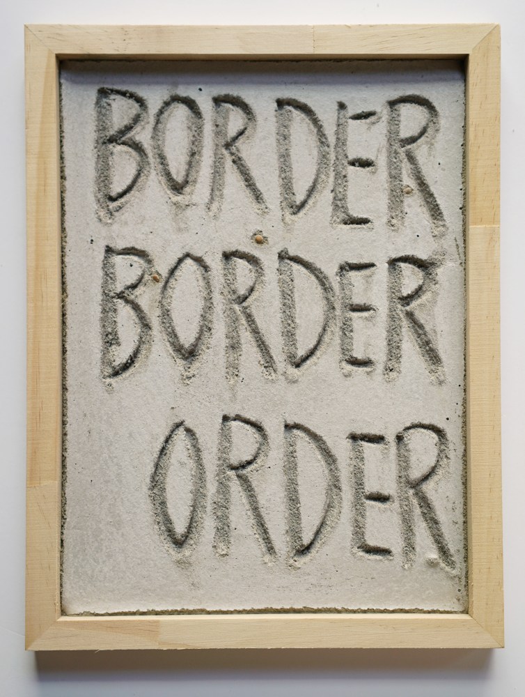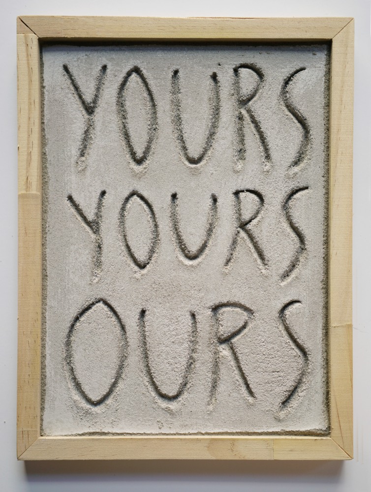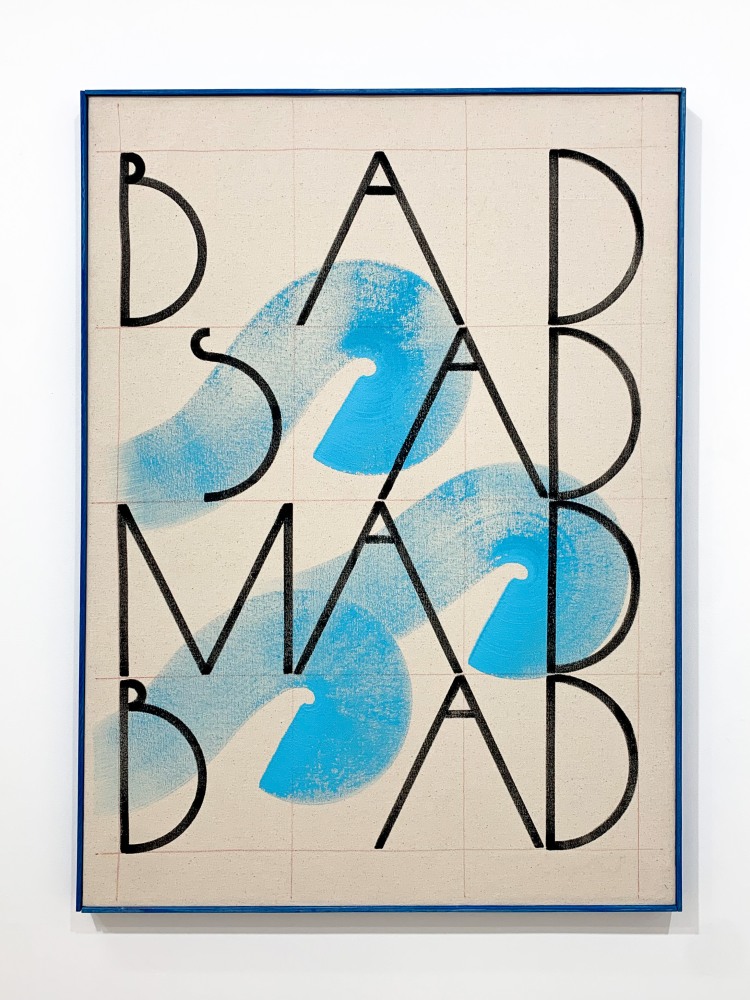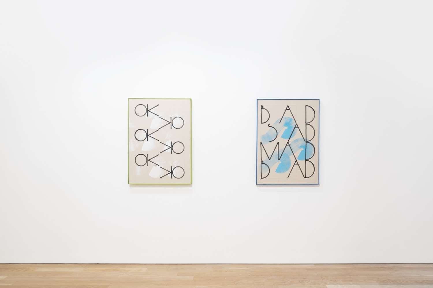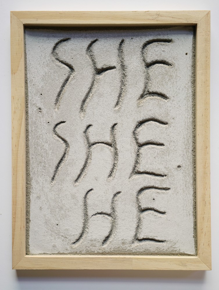 Visions, inspired by dreams, surrounding life, or drawn from the unconscious, are at the heart of Mia Enell’s paintings. She  plays with words through images, her figures of speech are free associations on canvas. Loosely Knit is a literal rendering of its title: a system of interconnected discrete units freed from instrumental utility or significance. Alina Bliumis’ text-based sculptural works, Concrete Poems, recall street wall scribbles, graffiti, and absurdist poetry. They consist of words literally inscribed on  tablets of wet concrete. Border/Order; Textile/Tile; Lover/Over: the playfulness of crossword puzzles often leads to unexpected existential interrogations.  Using ready made expressions or repetitions of a single word, Elvire Bonduelle utilizes a repertoire of images and objects with apparently joyful potential. Made of words carefully calligraphed -in her own hand-designed font- over colorful wave patterns, Bonduelle’s paintings revel in their own obviousness.