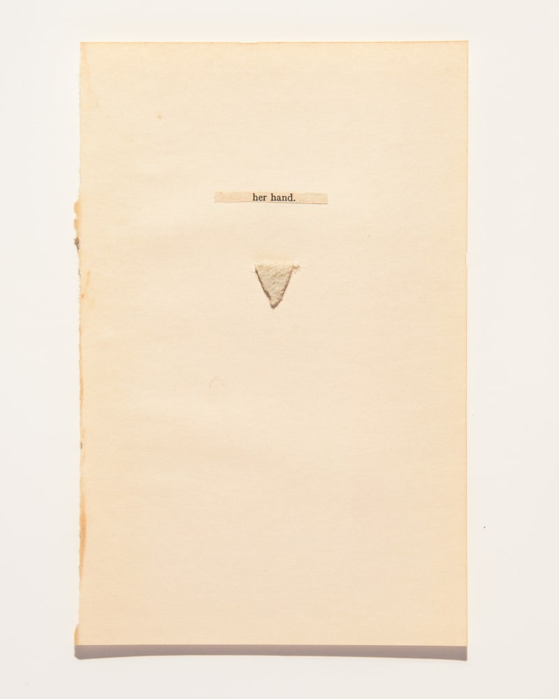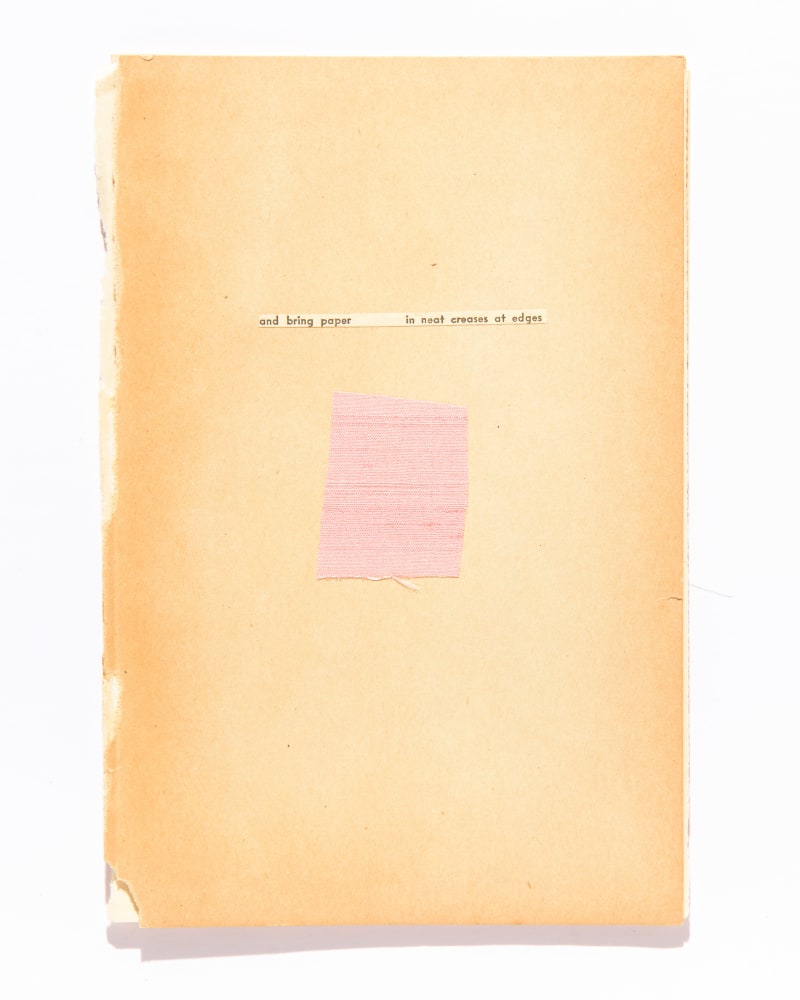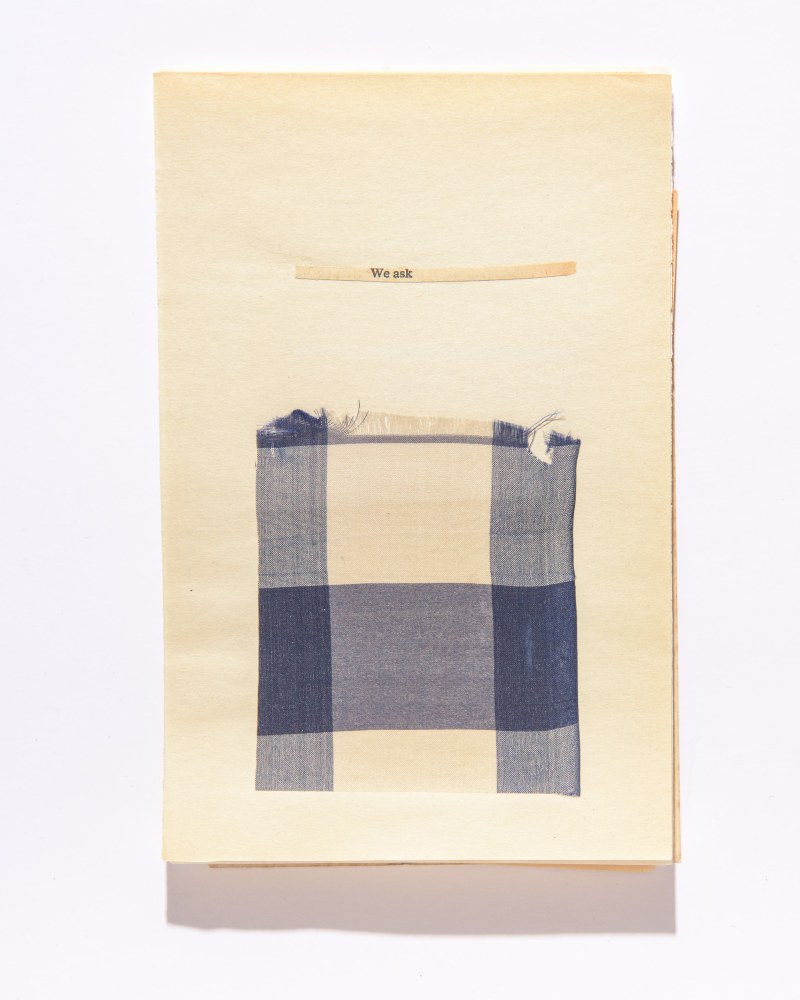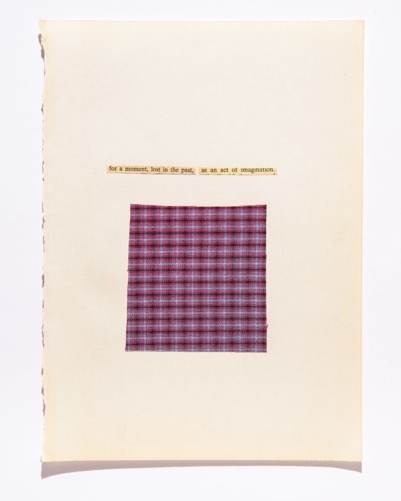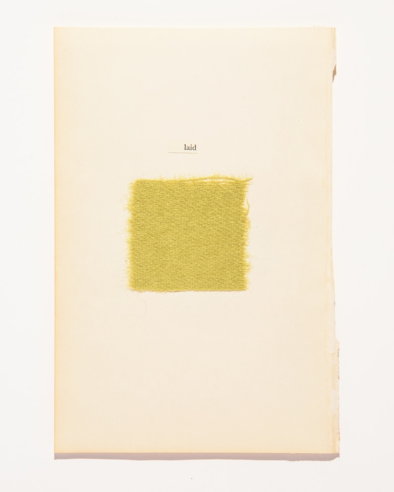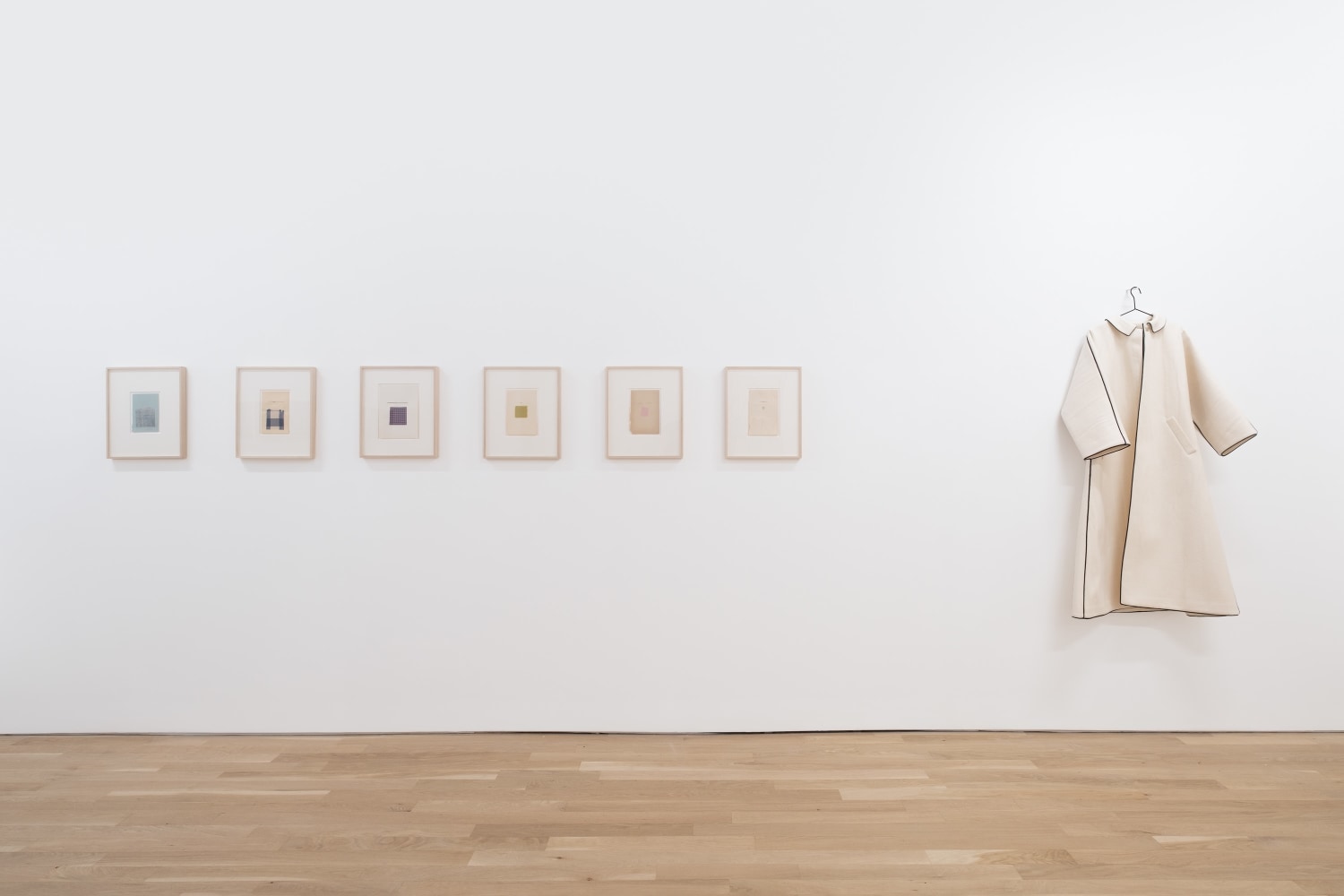 Language and text are at the tactile and metaphoric center of Ann Hamilton’s work. She uses common materials to invoke particular places, collective voices, and communities of labor. What are the places and forms for live, visceral, face-to-face experiences in a media saturated world? In Shell, an homage to Joseph Beuys, in the form of a white felt coat, as well as in a group of  collages on book end paper, the relations of cloth, touch, motion and human gesture give way to dense materiality.
