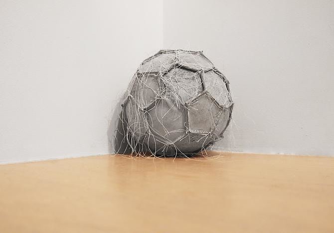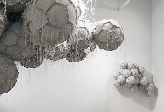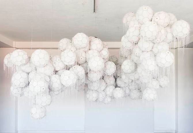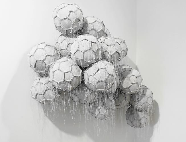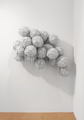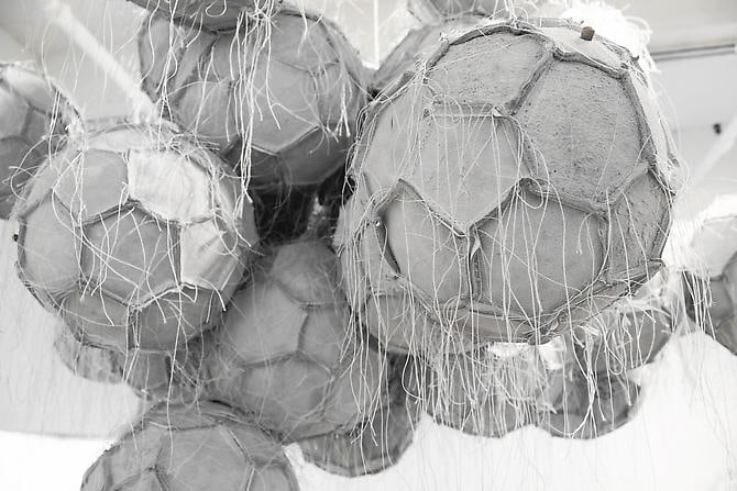 In the project room Dario Escobar creates a sculptural space that is both rational and sensual. Obverse and Reverse (Cloud) is made of white soccer balls that are deconstructed, re-sewn inside out and sewn together in cloud-like clusters. The interior becomes the exterior and the exposed balls reveal a new intimate perspective.