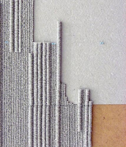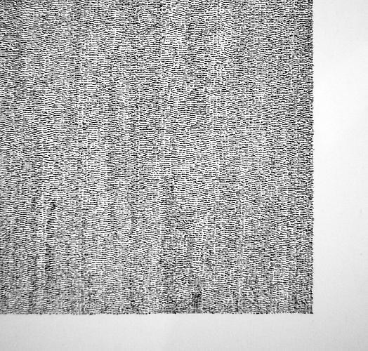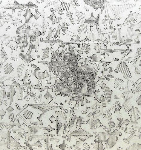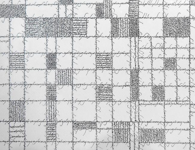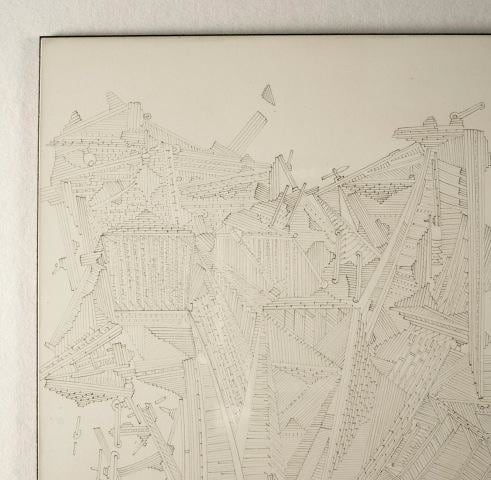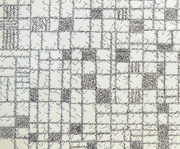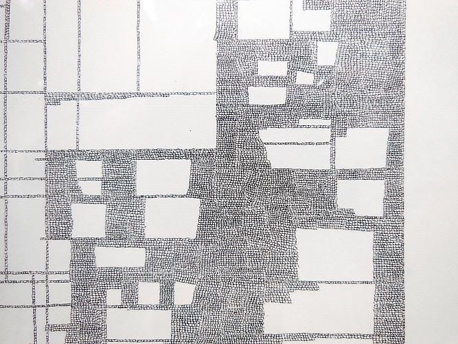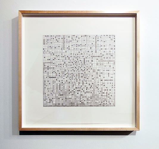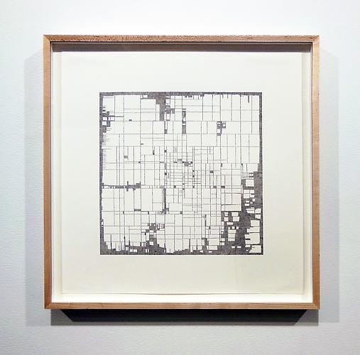 Informed by the tradition of Jewish micrography, Jacob El Hanani uses hebrew letters as building blocks inside wavering nets of cross lines, whose curvature gives the drawings the feeling of a digitally rendered relief map or google earth search. Born in Casablanca, Morocco in 1947, Jacob el Hanani lives and works in New York. His work has been exhibited extensively since 1975. Selected exhibitions include: Drawn to Detail, DeCordova Museum and Sculpture Park, Lincoln, MA (2008); Transforming Chronologies: An Atlas of Drawings, Part Two, Museum of Modern Art, New York (2006); Moment by Moment: Meditations of the Hand, North Dakota Museum of Art, Grand Forks, ND (2006); The Broida Collection, The National Gallery, Washington, D.C. (2006).