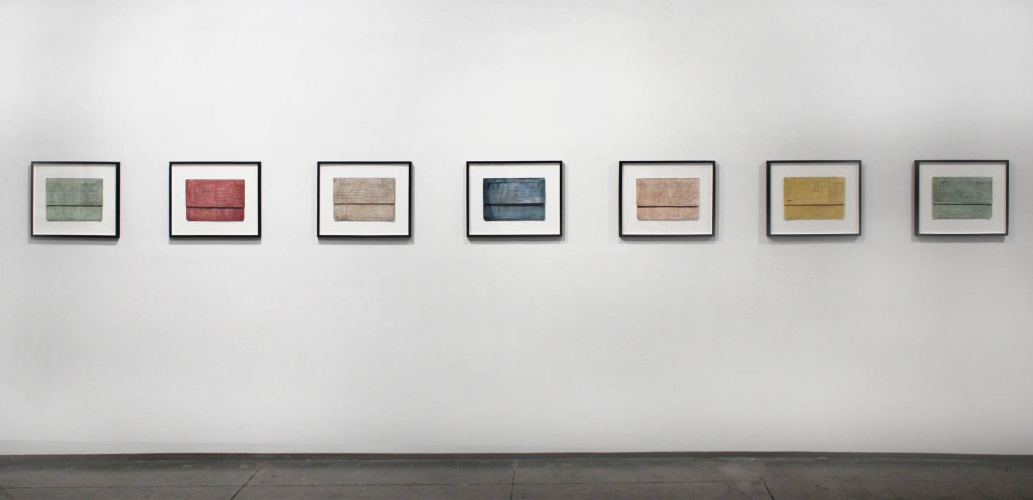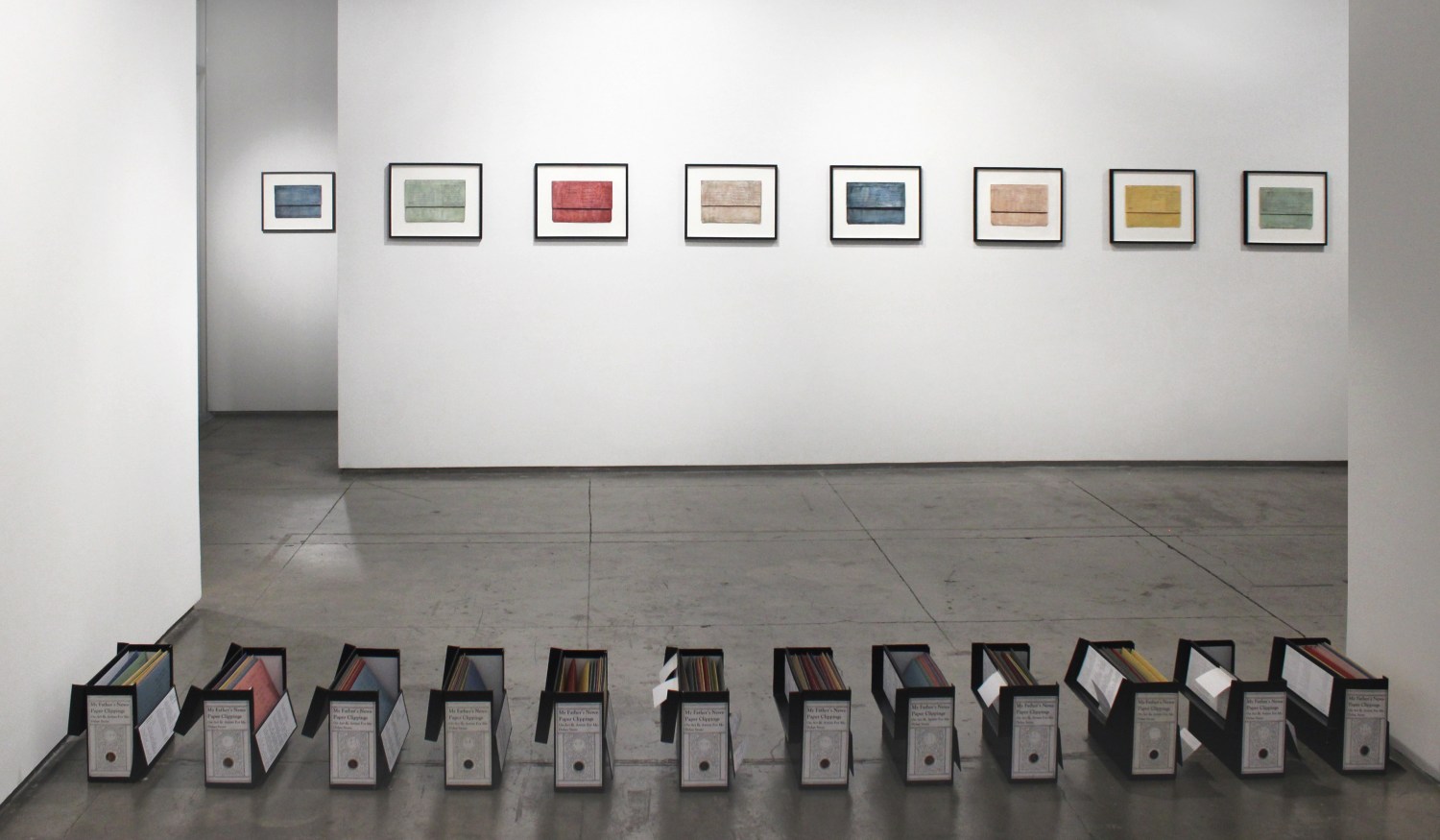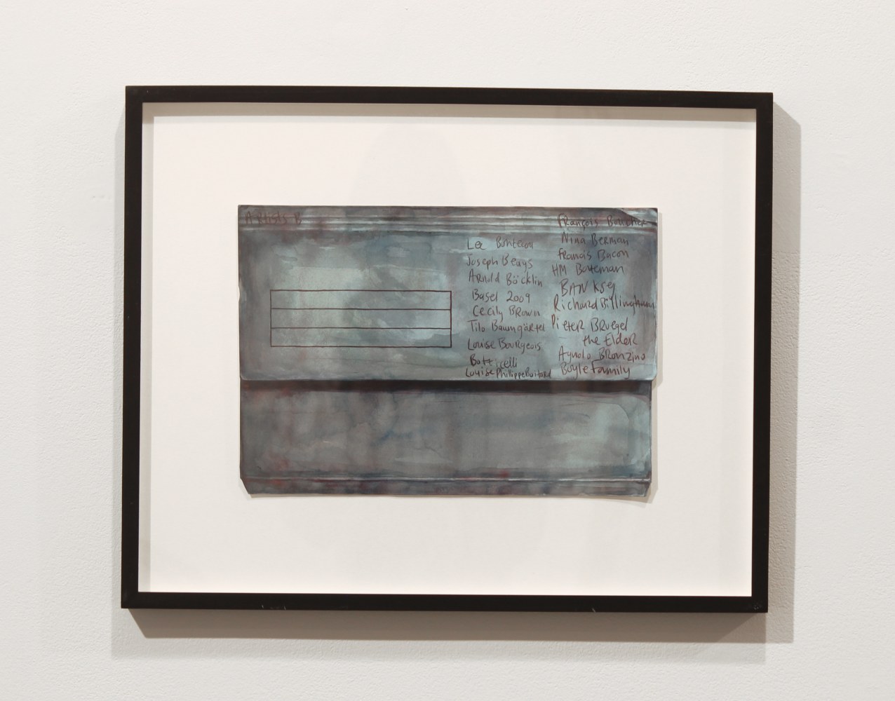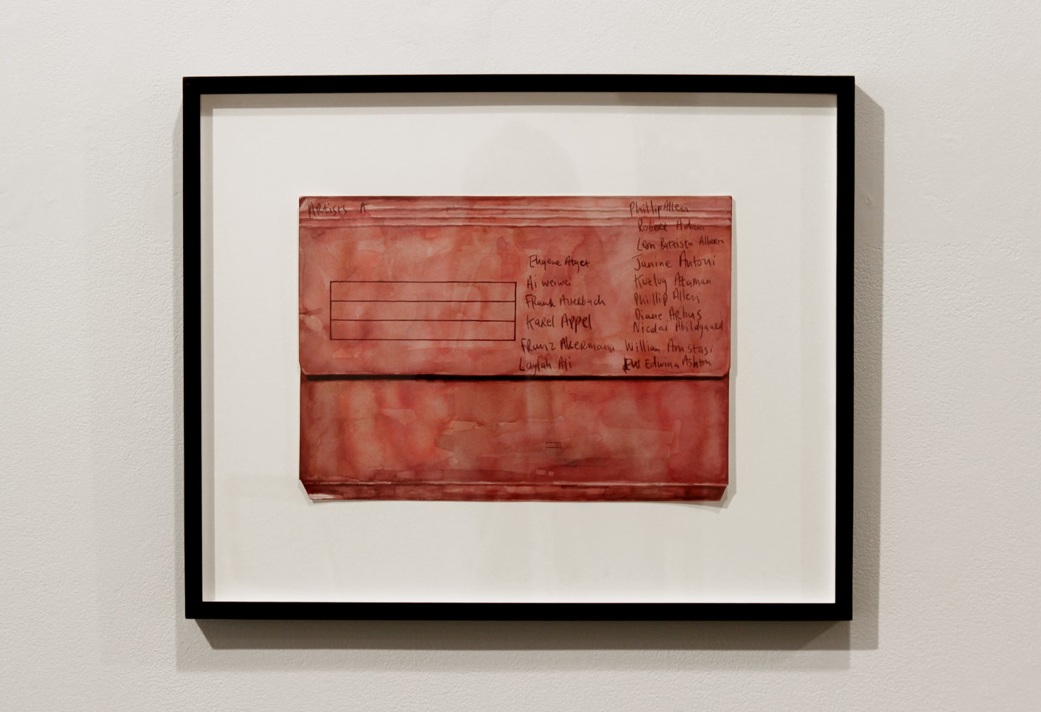 A-B Box, a series of twelve watercolors that focus on the file folders that contain the newspaper clippings. The enclosed articles are listed in the artist’s handwriting. Stone has familiarity with systems of cataloging as in his 26,000 photographs of Lower Manhattan acquired by The New York Public Library and his previous monumental and detailed painting documenting his parents’ bookshelves now in the collection of The Museum of Fine Arts Houston. These file folders, painted in watercolor are a record and index of art and art history.