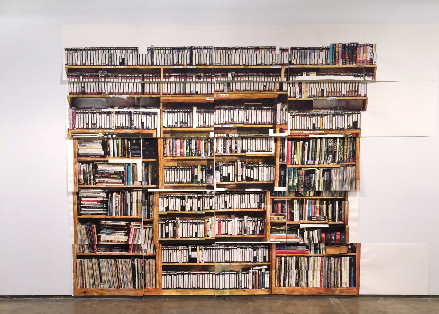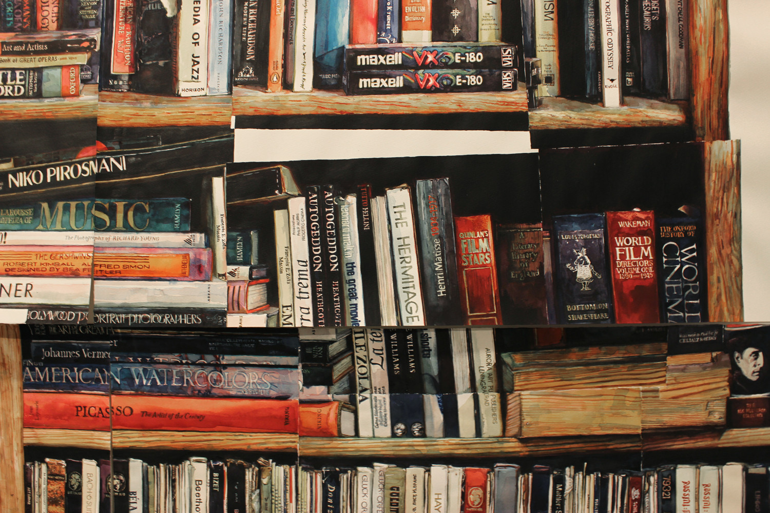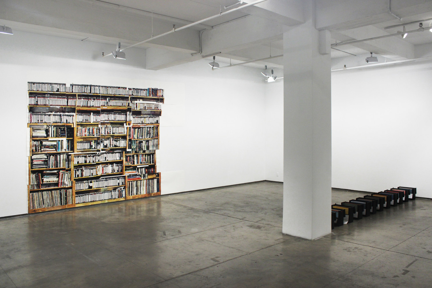 Barbara and David Stone’s Videos, LPs and Books is a watercolor painting of a bookcase lined with familiar artifacts from the 1970s through the 1990s. Stone’s father, David, who recently passed away, worked in collaboration with his wife Barbara, producing films by filmmakers such as Jonas Mekas, Jerome Hill, and Robert Kramer. For thirty years they made home recordings of movies from television that tower over the gallery alongside oversized books and tchotchkes. The painting is tiled together in a mosaic, made of twenty-three sheets, with disjointed and skewed painted panes. Like the breaks and blips natural to older media, there is a dissonance to this un-straight forward tender representation of his parents’ history.