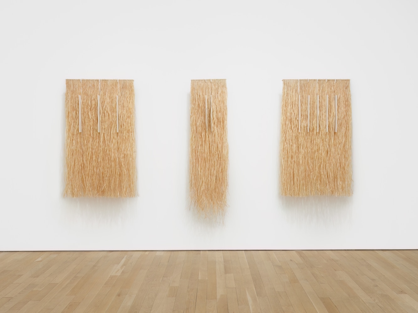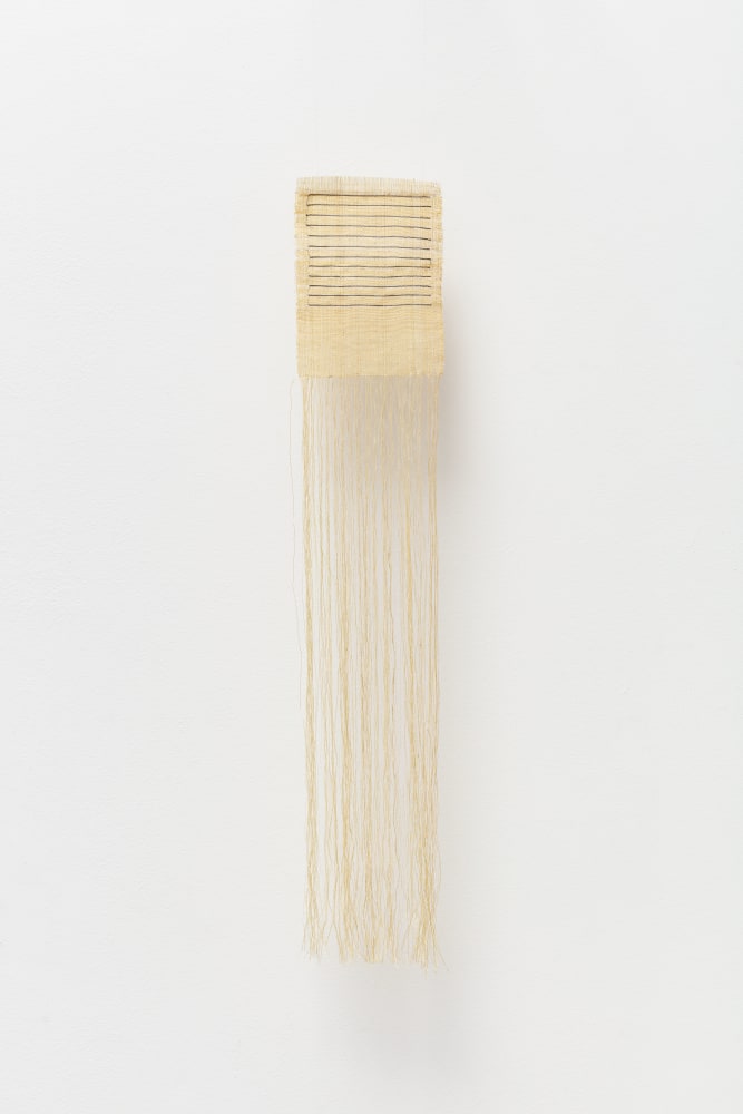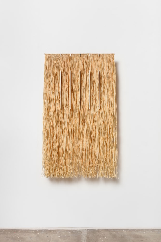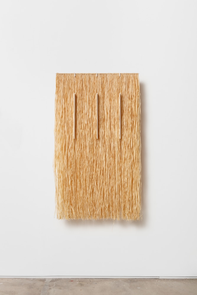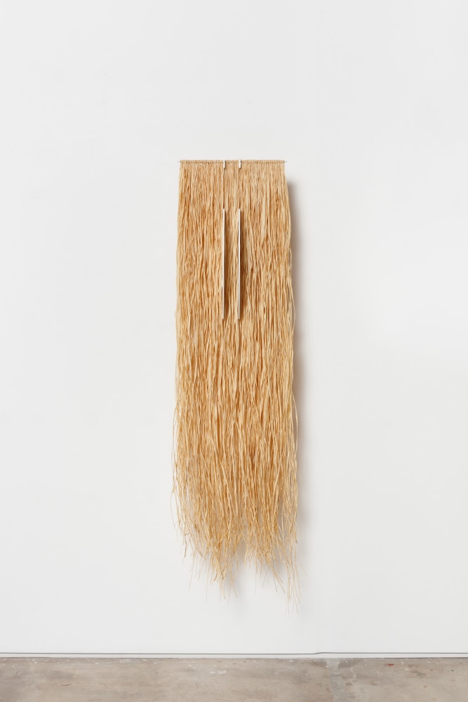 With L.B. Forest School 1, 2, and 3, a new series made of lacquered metal and raffia, a supple fiber coming from palm leaves, Fragateiro pays homage to the recently celebrated legendary Brazilian architect Lina Bo Bardi and her interest in vernacular design and materials. In her projects, Bo Bardi facilitated a coalescence of seemingly dissonant materials, the paradoxes and potentials that this work represents in its link with a “primitivism” of a modernist face. Here, geometric metal shapes emerge in Modernist order from the raffia’s body-like presence.