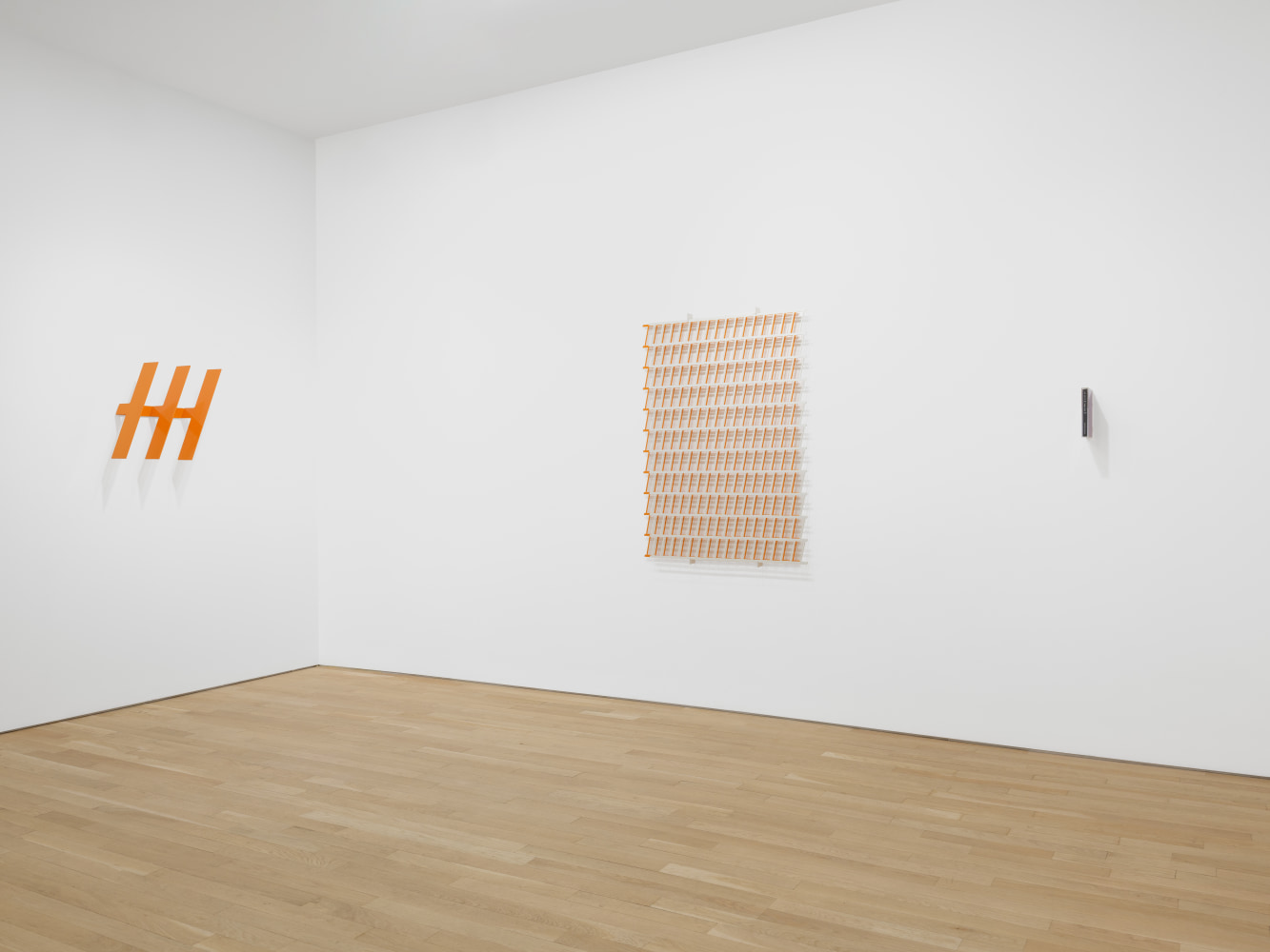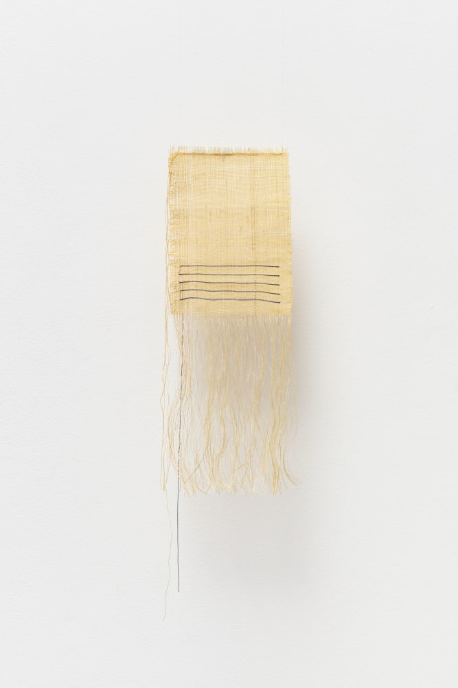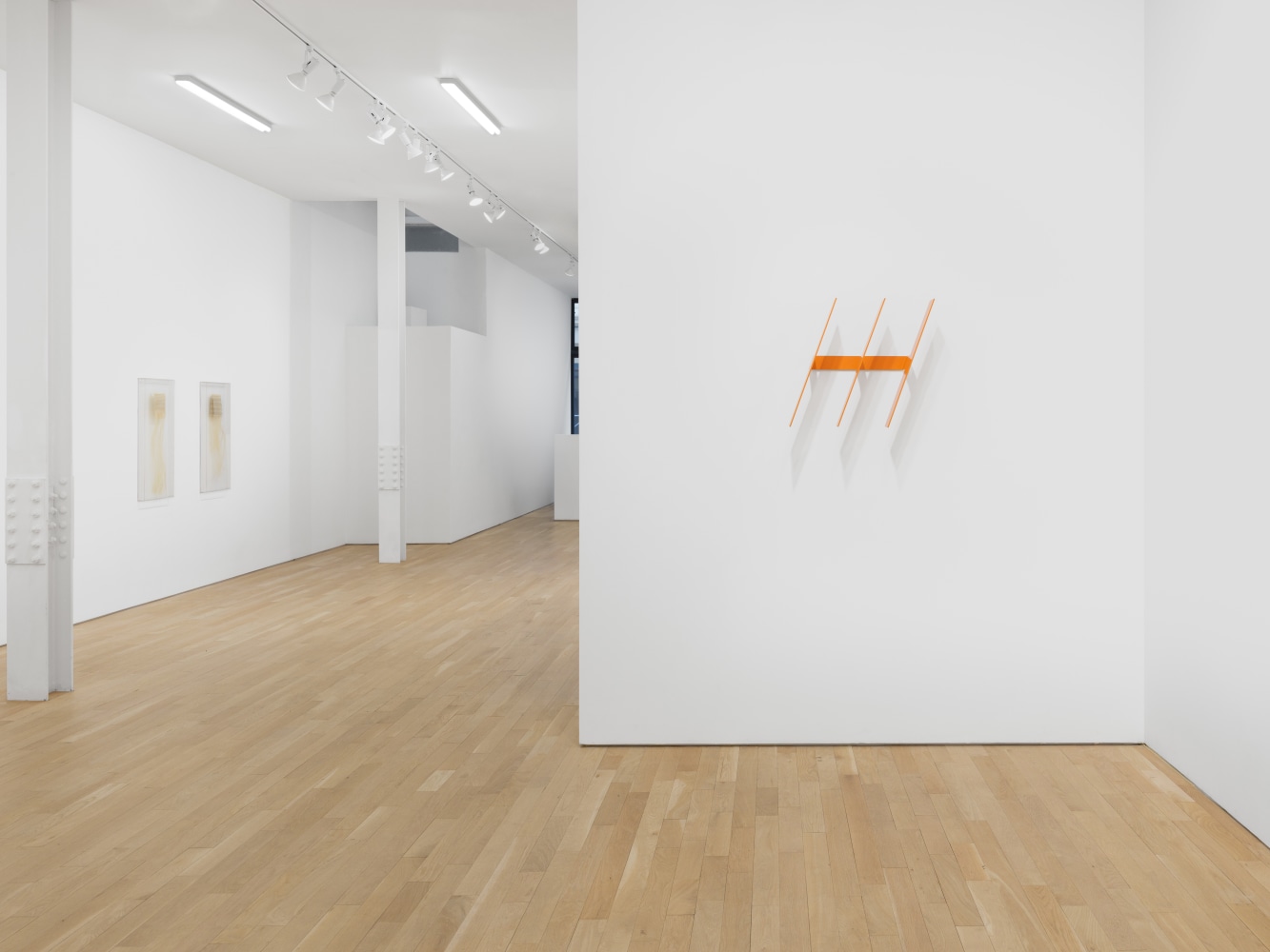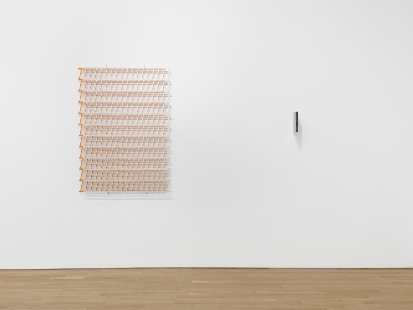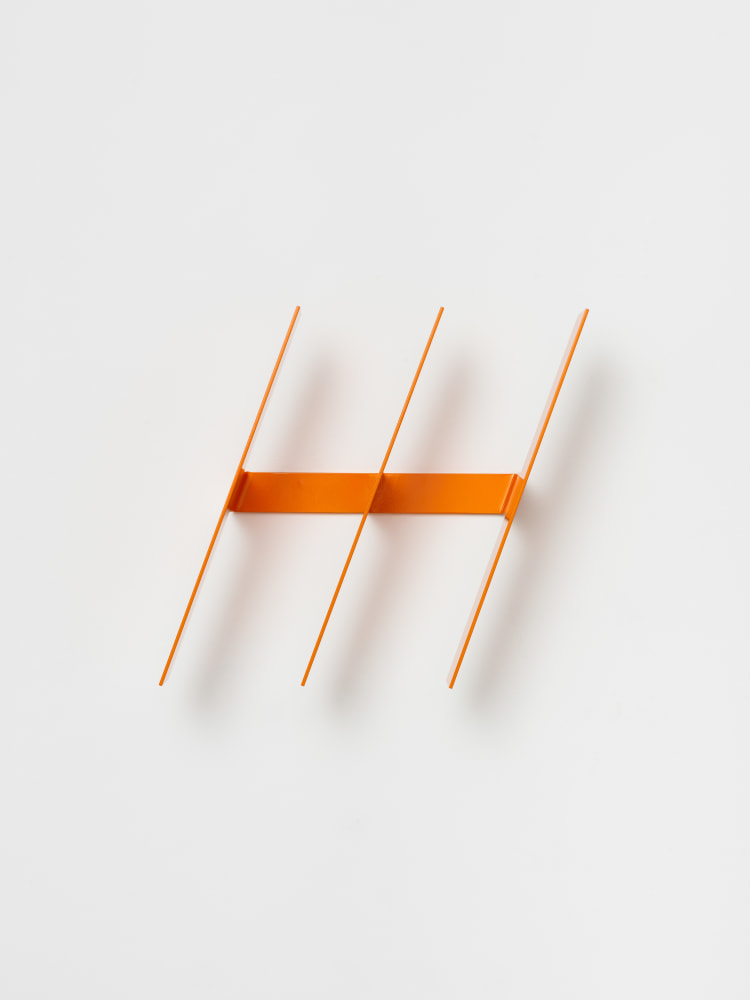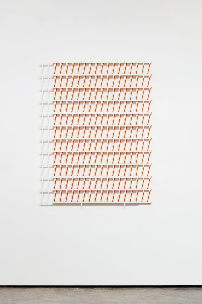 O.B. (Christmas and New Year’s card, after Otti Berger, 1937) and the Texts without Words series are five new textile works made of extremely fine raw silk sourced in a women's community from the North of Portugal (Museu da Seda e do Território de Freixo de Espada à Cinta) and woven by textile artist Ana Gonçalves. Interlaced into the sun-bleached color of the raw silk are dark gray lines, lines of text without words, truncated articulations. Within these delicate works, Fragateiro evokes the memory of Otti Berger, a visionary textile designer from the Bauhaus who was sent to her death in Auschwitz, in the process of waiting for a visa to the United States. O.B. (Christmas and New Year’s Card, after Otti Berger, 1937) is a facsimile of a greeting card woven by Otti Berger while exiled in London. The horizontal lines in Fragateiro’s silk pieces become visually entangled in the two orange and white wall hanging sculptures, rendered from metal sheets that overlap to create a lax grid line formation. Inspired by Agnes Martin’s drawing, “Aspiration”, Fragateiro’s sculptures parse the linearities out, expanding them both vertically and horizontally.