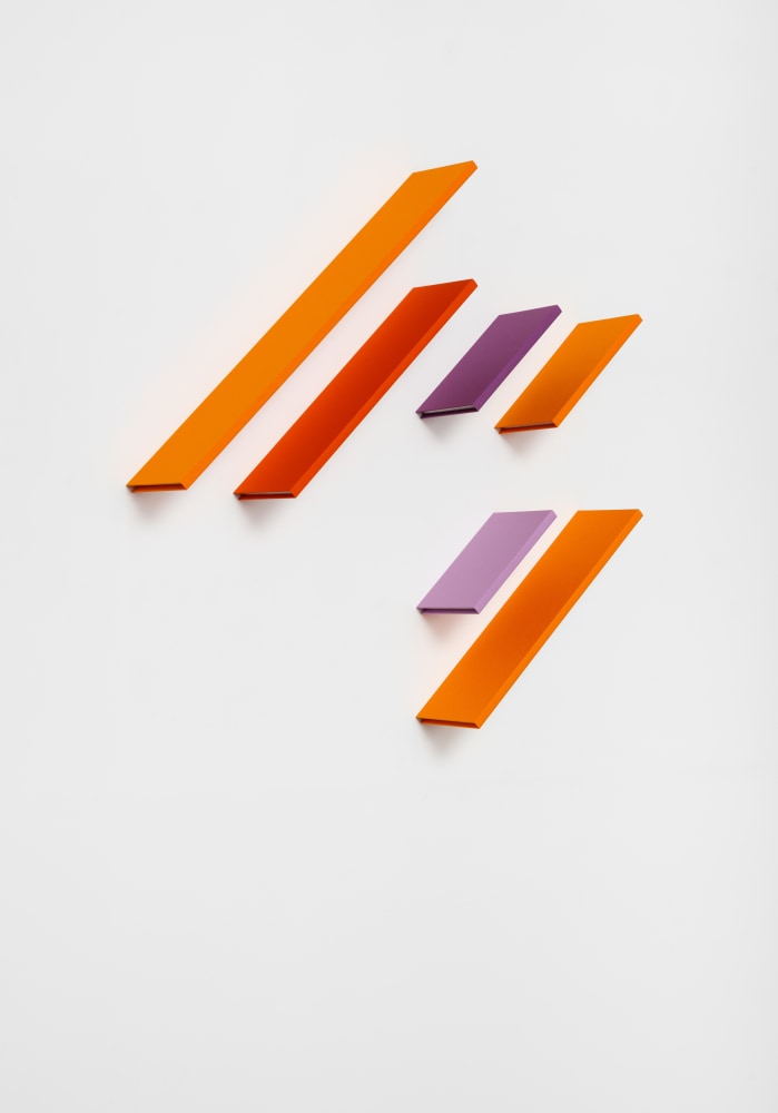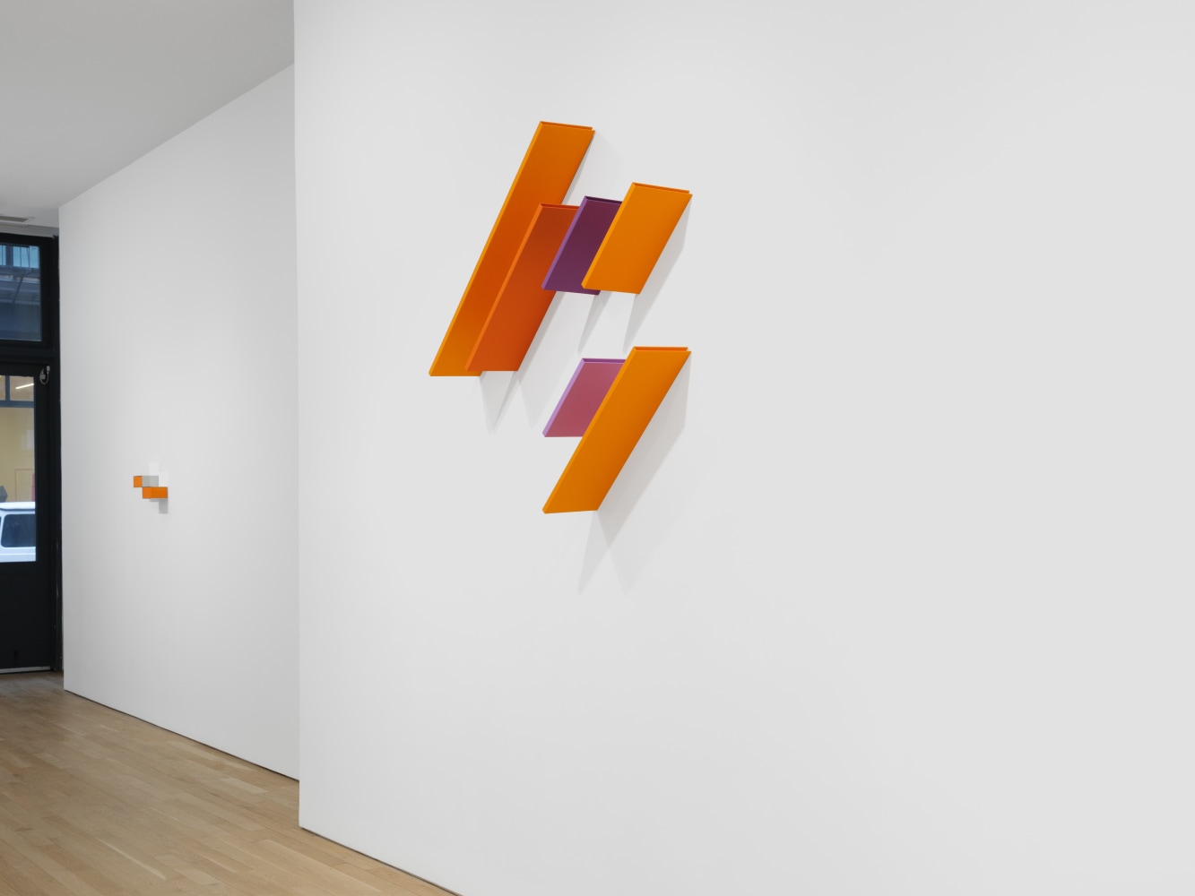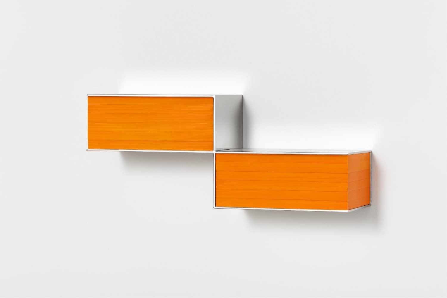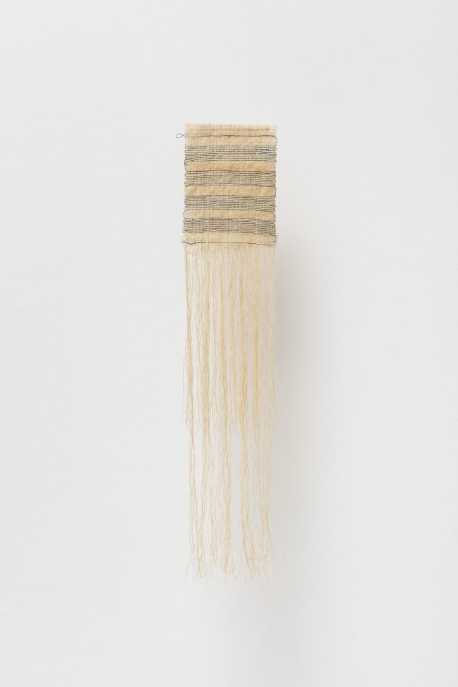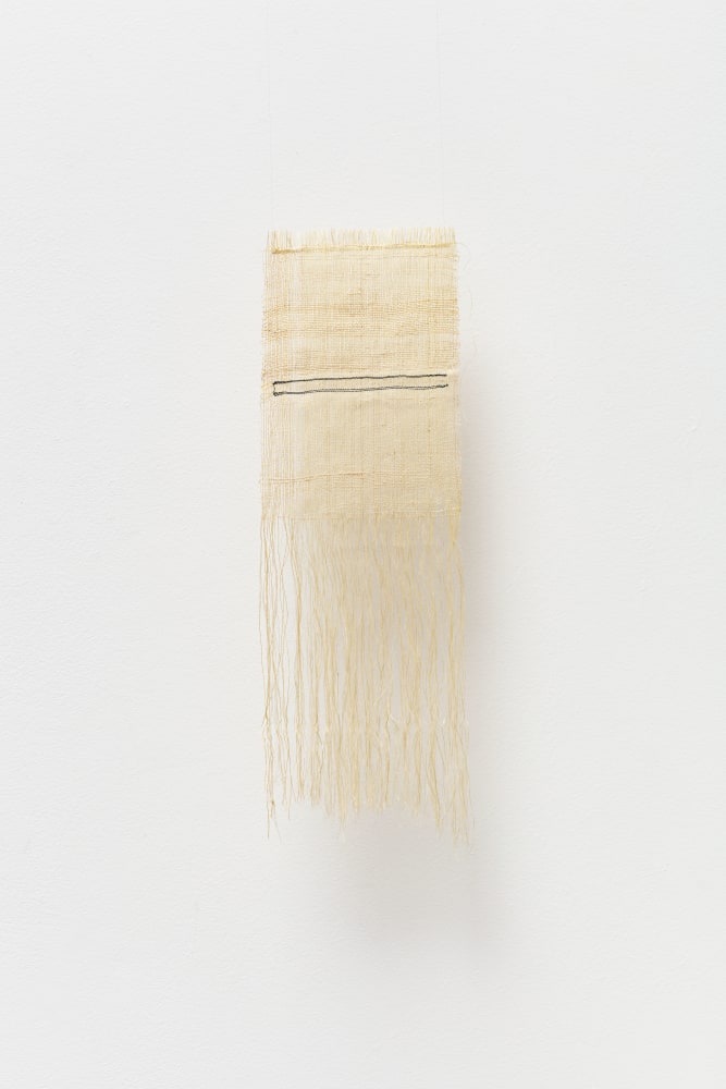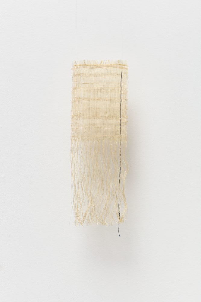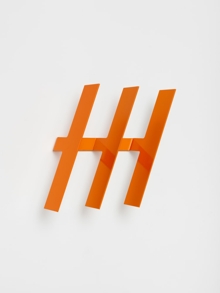 O.B. (Christmas and New Year’s card, after Otti Berger, 1937) and the Texts without Words series are five new textile works made of extremely fine raw silk sourced in a women's community from the North of Portugal (Museu da Seda e do Território de Freixo de Espada à Cinta) and woven by textile artist Ana Gonçalves. Interlaced into the sun-bleached color of the raw silk are dark gray lines, lines of text without words, truncated articulations. Within these delicate works, Fragateiro evokes the memory of Otti Berger, a visionary textile designer from the Bauhaus who was sent to her death in Auschwitz, in the process of waiting for a visa to the United States. O.B. (Christmas and New Year’s Card, after Otti Berger, 1937) is a facsimile of a greeting card woven by Otti Berger while exiled in London. The horizontal lines in Fragateiro’s silk pieces become visually entangled in the two orange and white wall hanging sculptures, rendered from metal sheets that overlap to create a lax grid line formation. Inspired by Agnes Martin’s drawing, “Aspiration”, Fragateiro’s sculptures parse the linearities out, expanding them both vertically and horizontally.