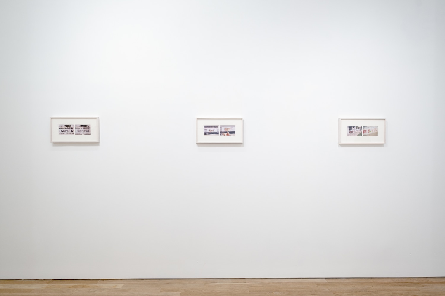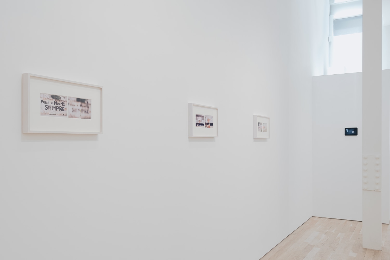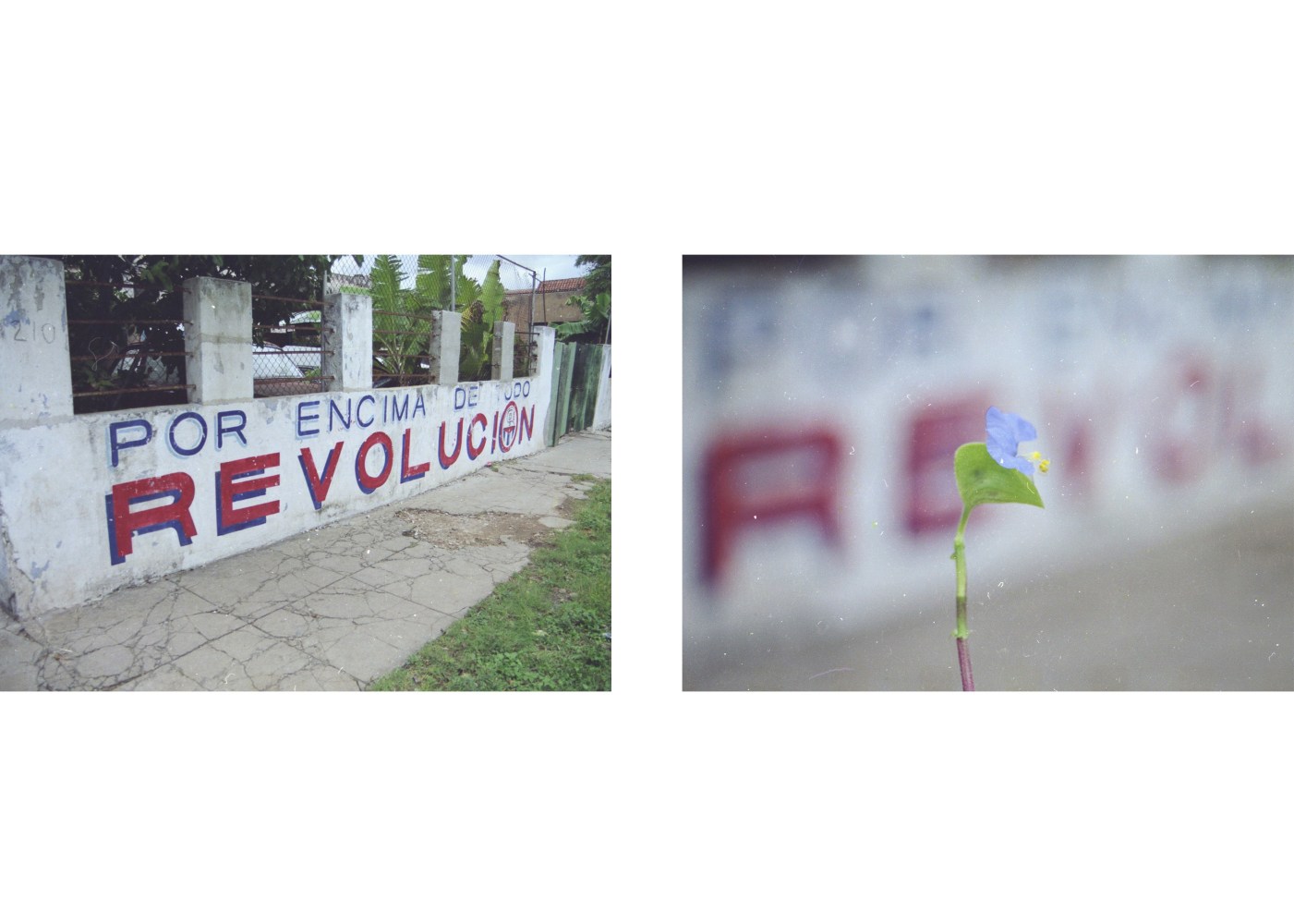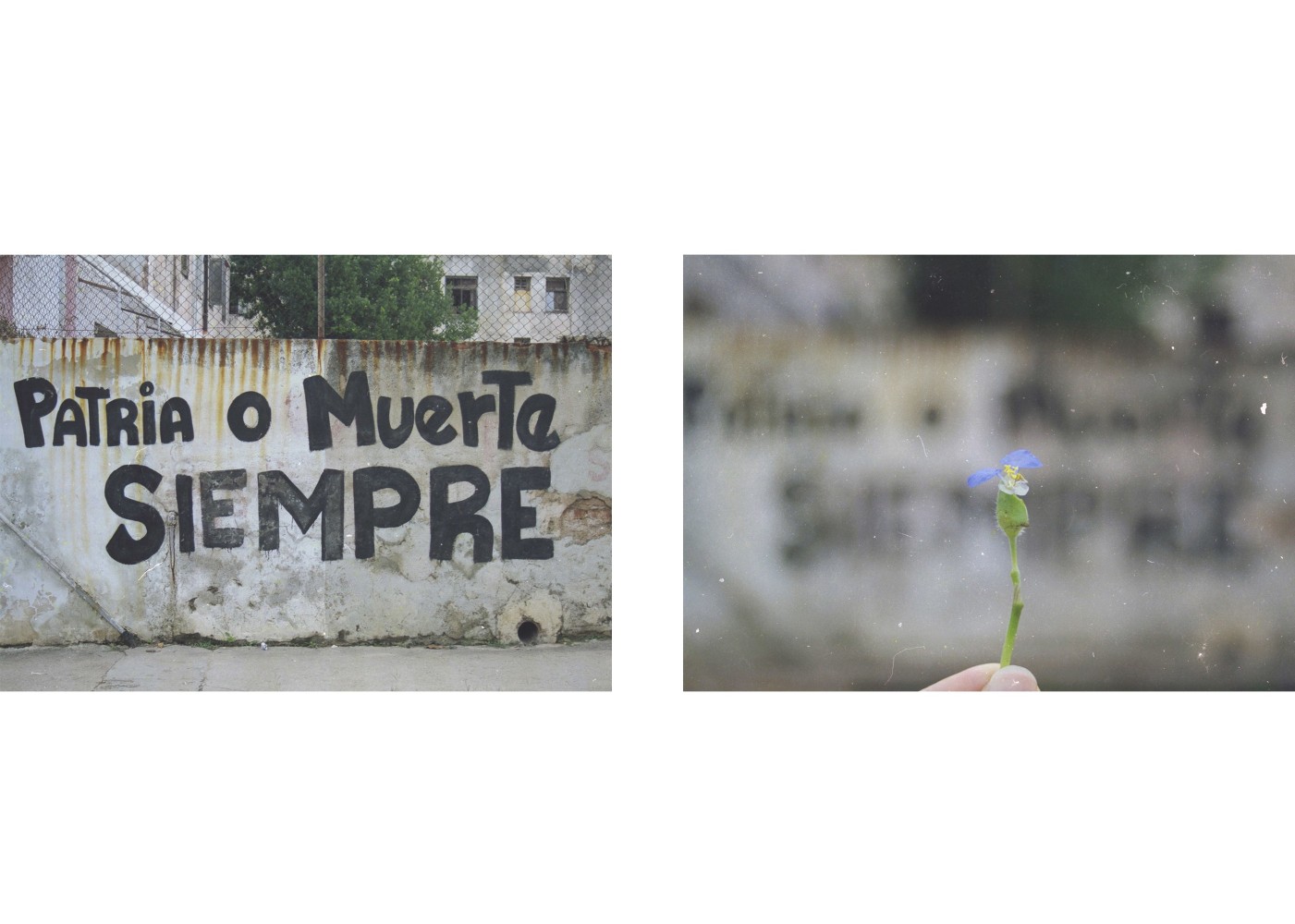 The exhibition opens with Hermoso Punto Azul (1999-2000), from a series crucial to understanding the artist’s relationship to politics, an essential aspect in the Cuban context. Standing in front of the “revolutionary” messages omnipresent in the Cuban landscape, the artist focuses the camera lens on a minuscule flower, therefore turning the propaganda into a foggy background. One of her very first artworks, it was inspired by a fragment from Milan Kundera’s novel Immortality: “She said to herself when the onslaught of ugliness became completely unbearable, she would go to a florist and buy a forget-me-not, a single forget-me-not, a slender stalk with miniature blue flowers. She would go out into the street holding the flower before her eyes, staring at it tenaciously so as to see only that single beautiful blue point, to see it as the last thing she wanted to preserve for herself from a world she had ceased to love.”