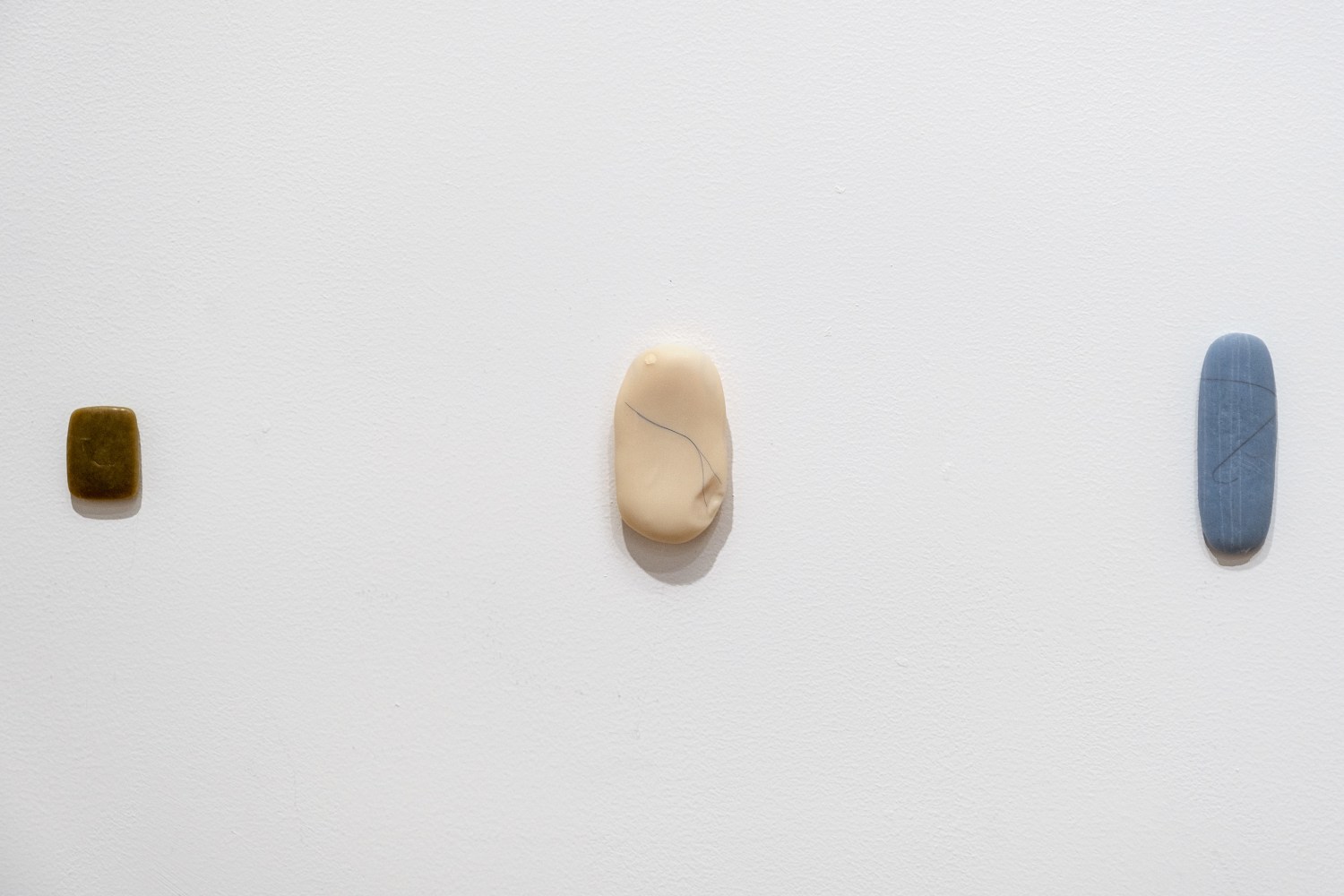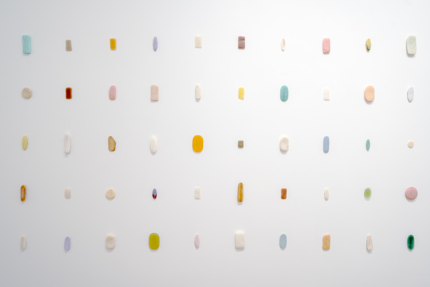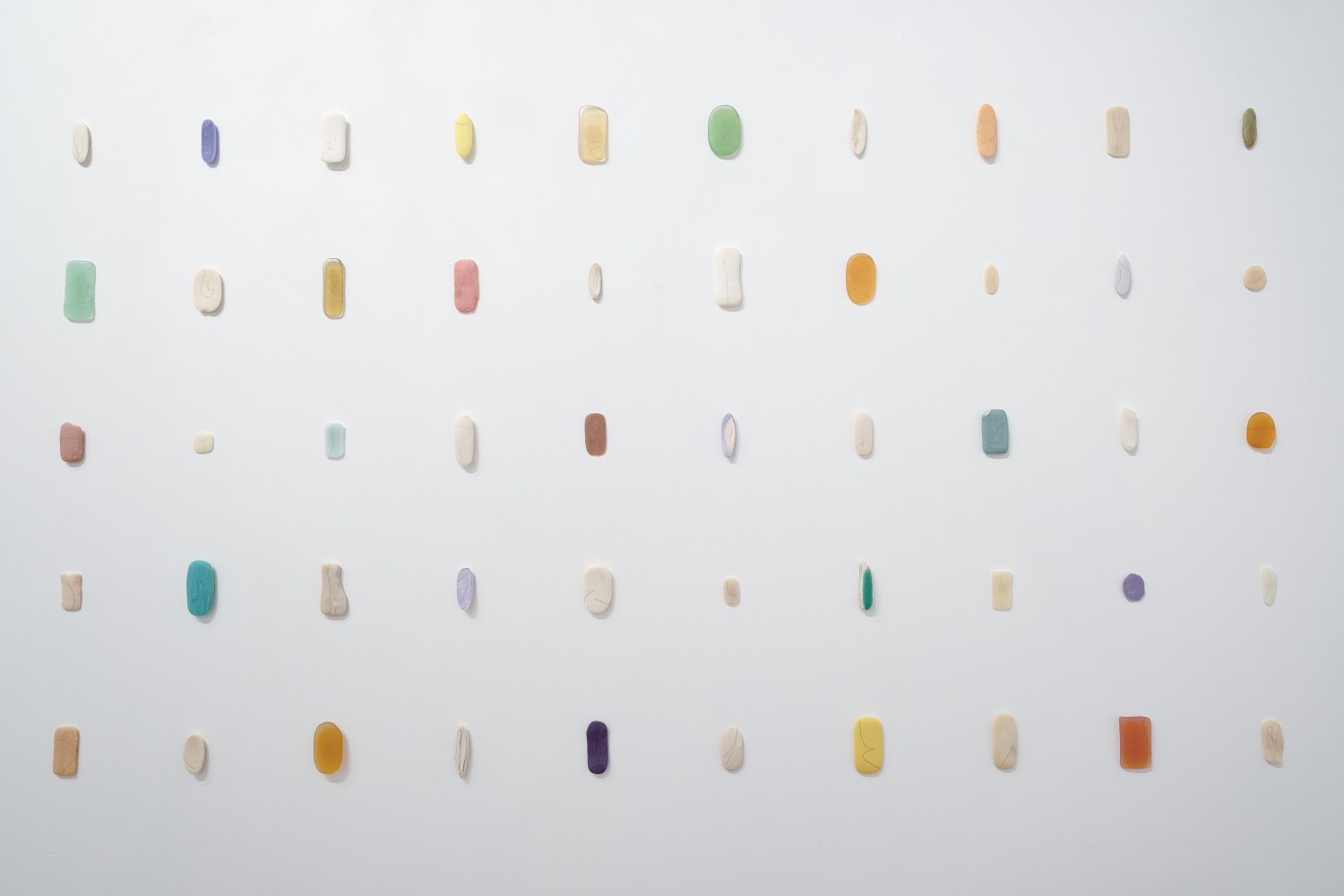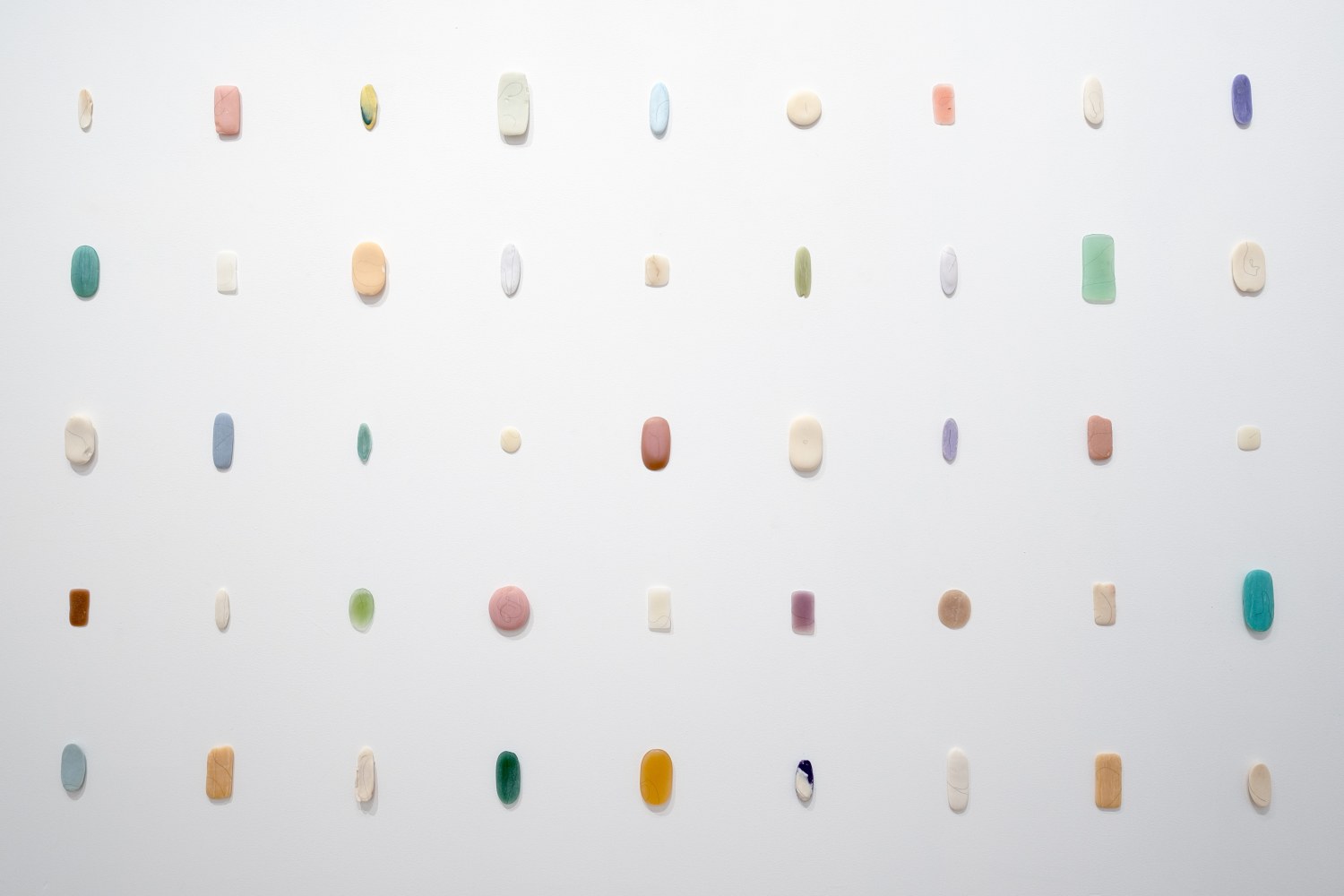 Coming of age during Fidel Castro’s regime, Glenda Leon grew up in the high-tech global age and her daily life ricocheted between almost infinite access to information and very limited access to human freedoms and basic necessities, including food and soap. To create the sculptural installation Shapes of the Instant (2001), she convinced the workers at a soap factory in Havana to give her a box of soap bars, then, in an unusual transaction reversing economic logics, she asked her friends and relatives to exchange the new soaps for their used ones. More than a hundred eroded soaps bars are installed in a grid arrangement on the wall. At first, the variation in soft shapes and colors prevails; upon closer reading, one encounters delicate abstract drawings made of hair embedded in the soap. Slow bodies, tender abrasions: here, the clean recalls the dirty and the repulsive becomes delicate. With a radical economy of means, Leon invites us to reconsider our relationship to our body, to each other and to the larger universe. Interior and exterior, public displays and private activities: these seeming opposites coexist in a poetic alignment in her work, informing and transforming one another. Likewise, In Every Tear is a Shape of Time, an eye formed by fake eyelashes “cries in colors”, in Campo de Juego, a bed becomes the game field for different sports, eliciting multiple interpretations.