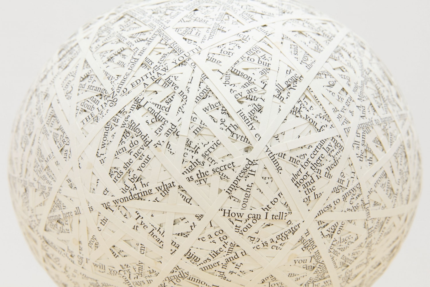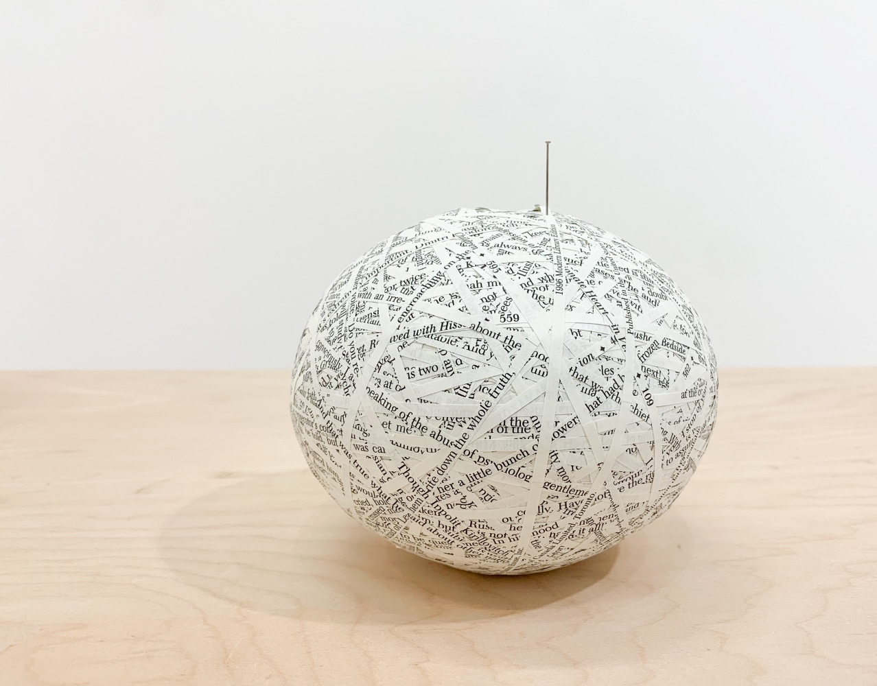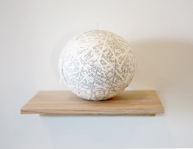 Emily Wilson’s fabulous translation of The Odyssey — the first English translation of the epic poem by a woman, has been deconstructed and reconfigured into a ball of cut paper as well. It stands as a single sculpture, a complete world unto itself. Coal from Tender Buttons by Gertrude Stein is placed on a single shelf reminiscent of a Ryoan-ji rock garden. Taken from Gertrude Stein’s enigmatic collection of experimental poems describing everyday objects, it consists of chunks of anthracite, a hard, compact coal with a submetallic luster, word-wrapped and polished.
