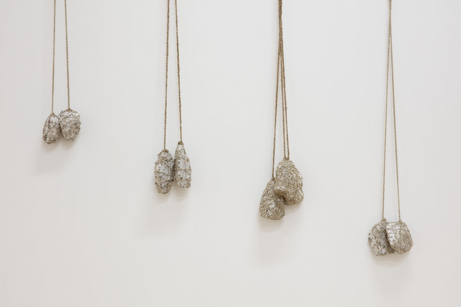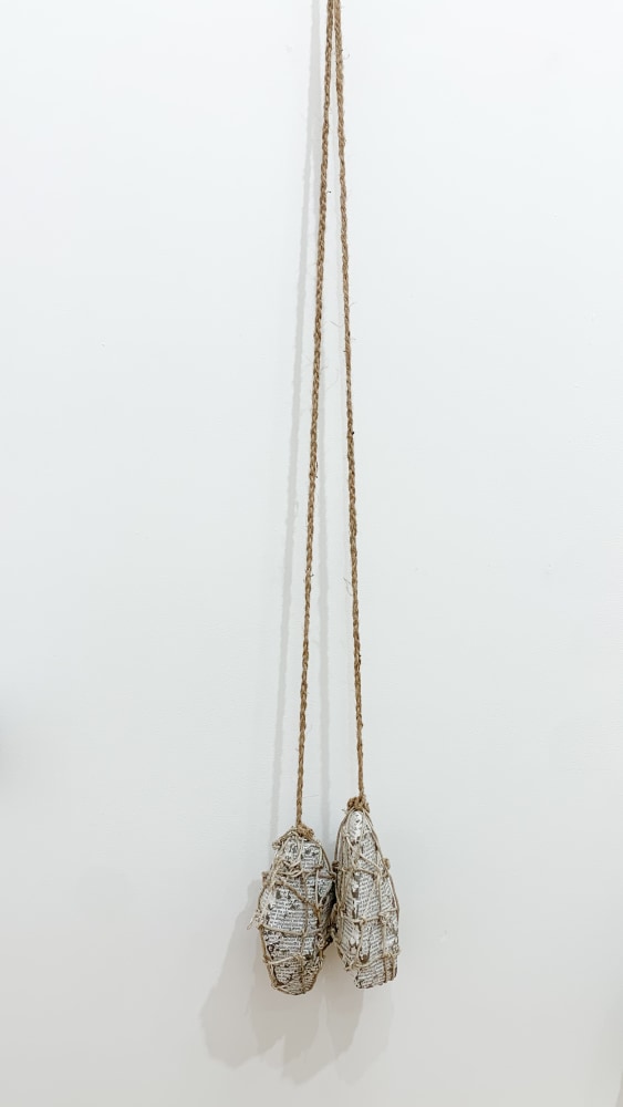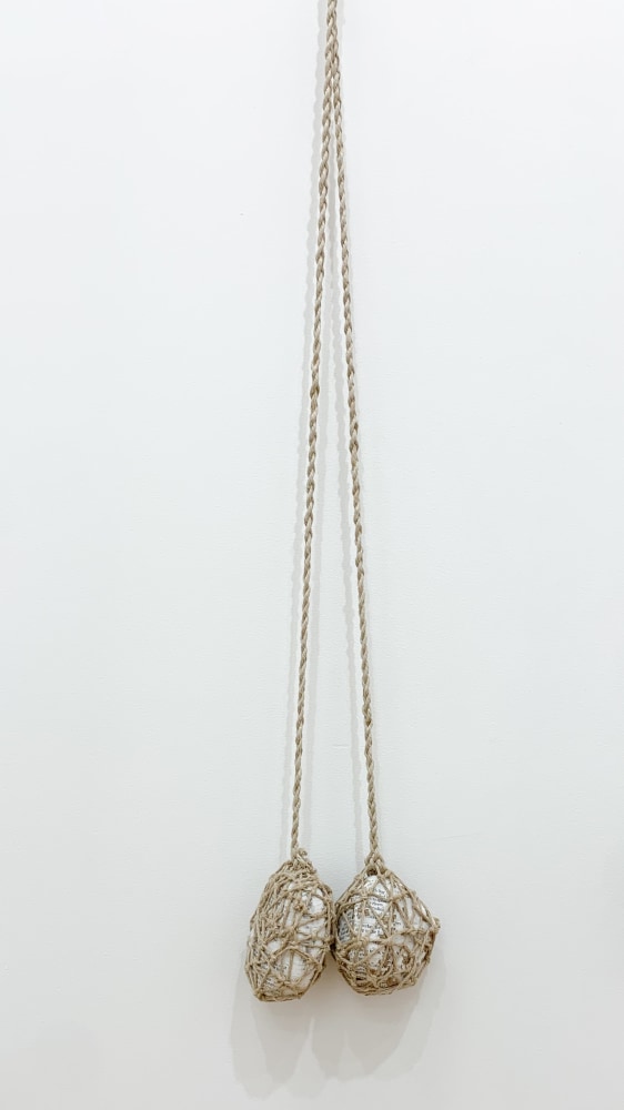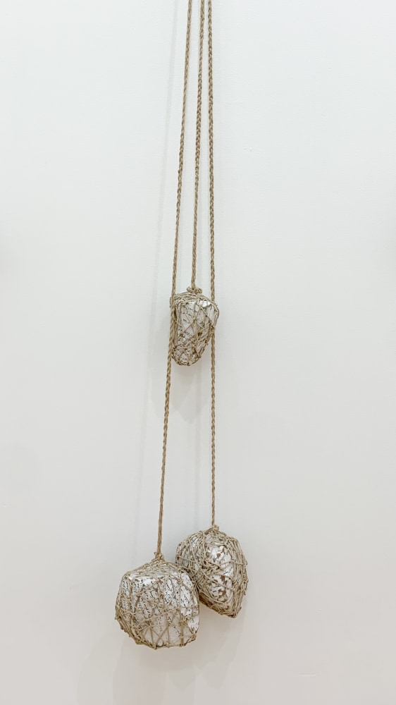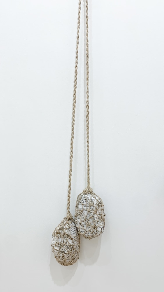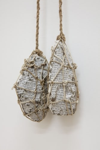 An installation of Protest Stones occupies the wall. These hurling weapons hang with braided twine. Made of either two, or three poetry-wrapped stones, the sculptures are nestled in knotted and tied Irish linen twine, or polished Hungarian hemp cord. Reminiscent of gaucho bolas or Arctic yo-yos, the stones are bolstered by the weighty words of iconic poets Ella Wheeler Wilcox, Joan Jordan, Adrienne Rich, Audre Lorde, Eavan Boland and Forough Farrokhzad.