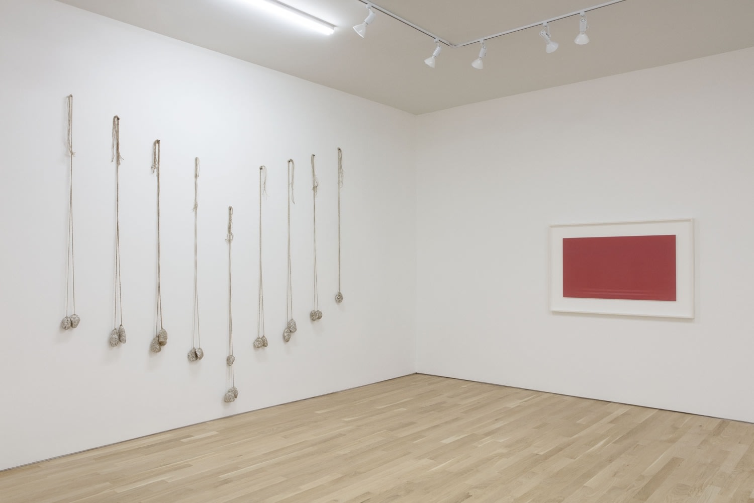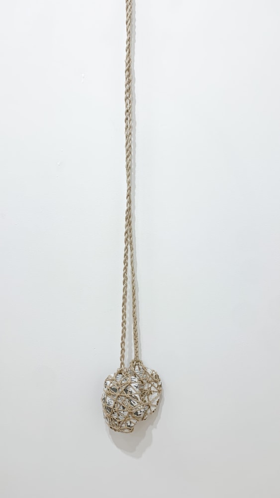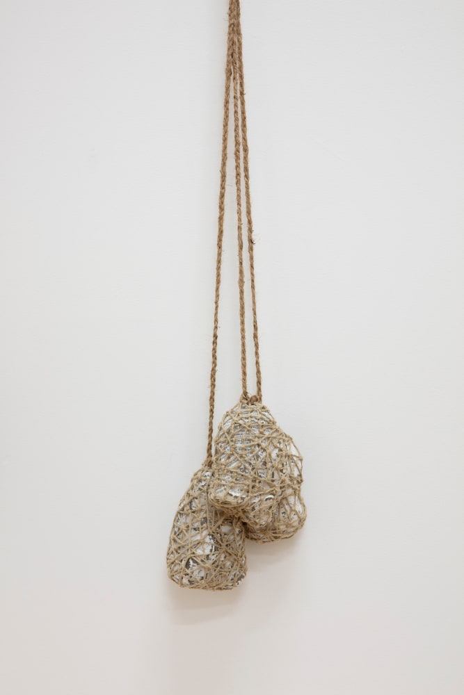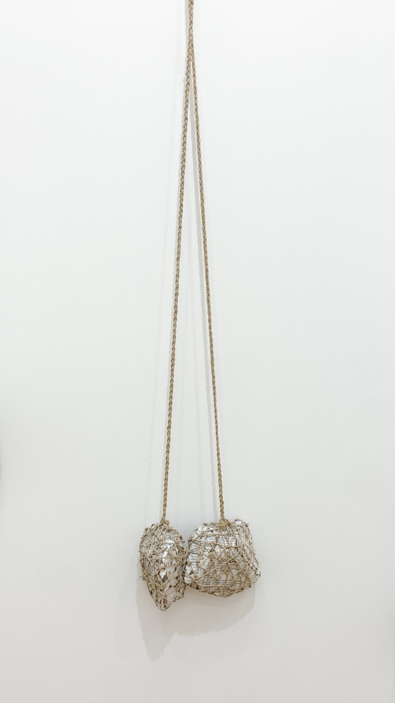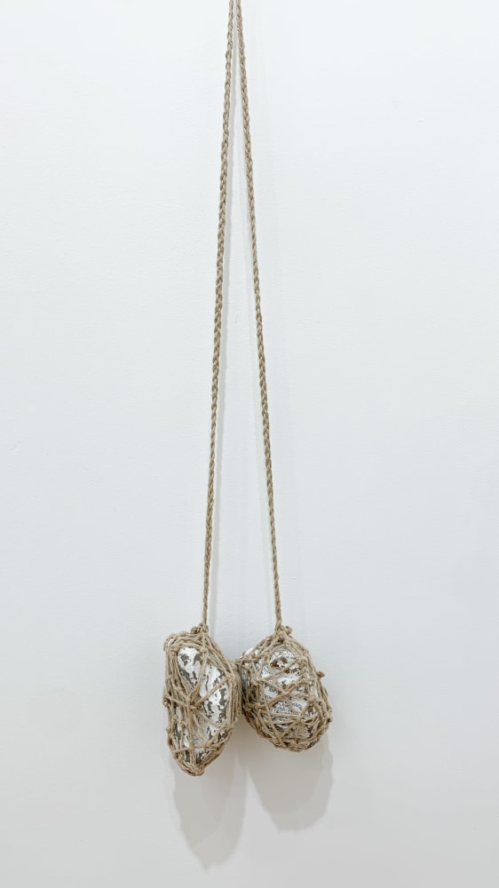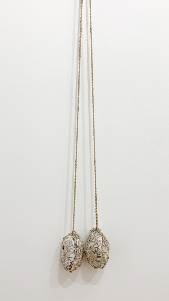 An installation of Protest Stones occupies the wall. These hurling weapons hang with braided twine. Made of either two, or three poetry-wrapped stones, the sculptures are nestled in knotted and tied Irish linen twine, or polished Hungarian hemp cord. Reminiscent of gaucho bolas or Arctic yo-yos, the stones are bolstered by the weighty words of iconic poets Ella Wheeler Wilcox, Joan Jordan, Adrienne Rich, Audre Lorde, Eavan Boland and Forough Farrokhzad.