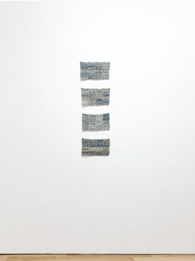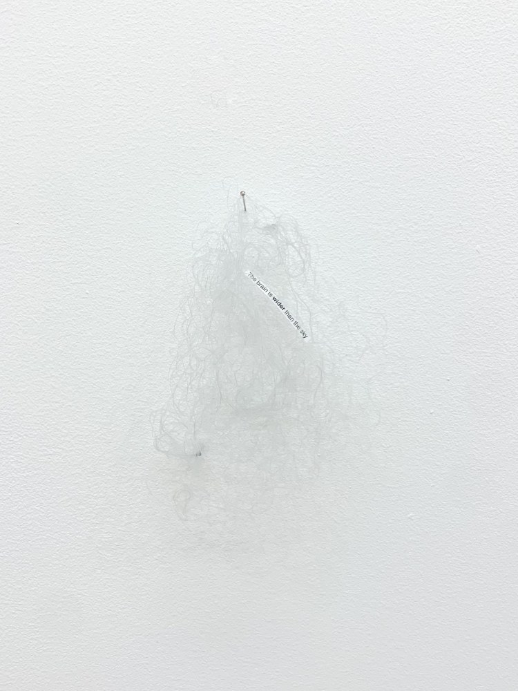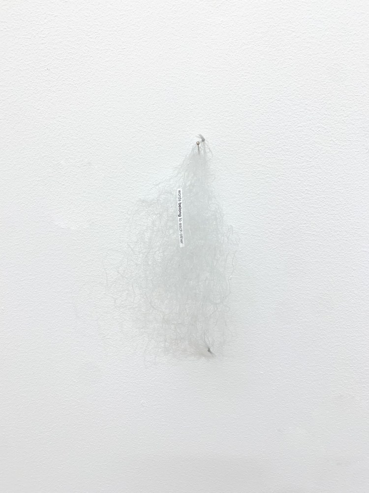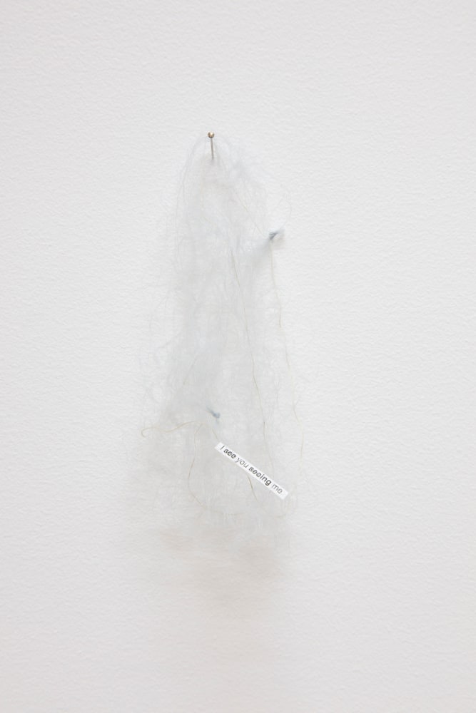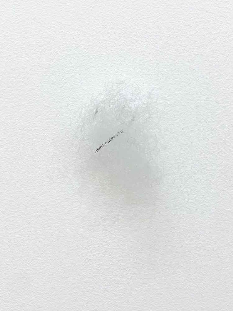 Also on view is a discreet installation of invisible hair net sculptures inspired by the admonition to carry one’s knowledge lightly. The ultimate in self-effacement: “you are the only one who knows you are wearing it,” these text depositories, magic knit of sheer nylon yarn and woven into a self-conforming and durable ultra-invisible mesh, enable the wearer to bear their learning quietly on their head.