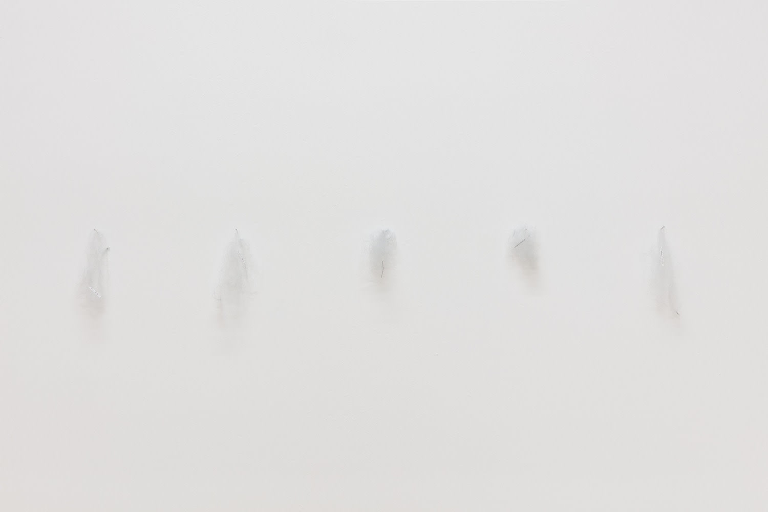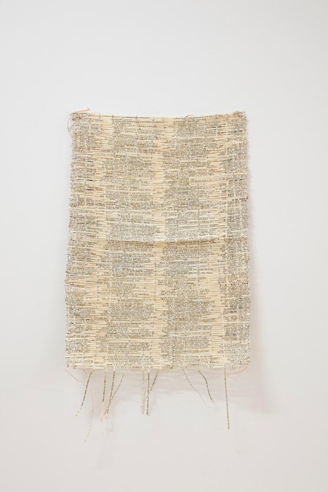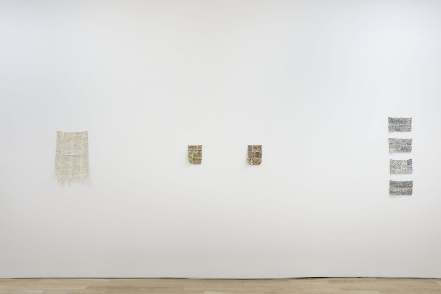 Also on view is a discreet installation of invisible hair net sculptures inspired by the admonition to carry one’s knowledge lightly. The ultimate in self-effacement: “you are the only one who knows you are wearing it,” these text depositories, magic knit of sheer nylon yarn and woven into a self-conforming and durable ultra-invisible mesh, enable the wearer to bear their learning quietly on their head.