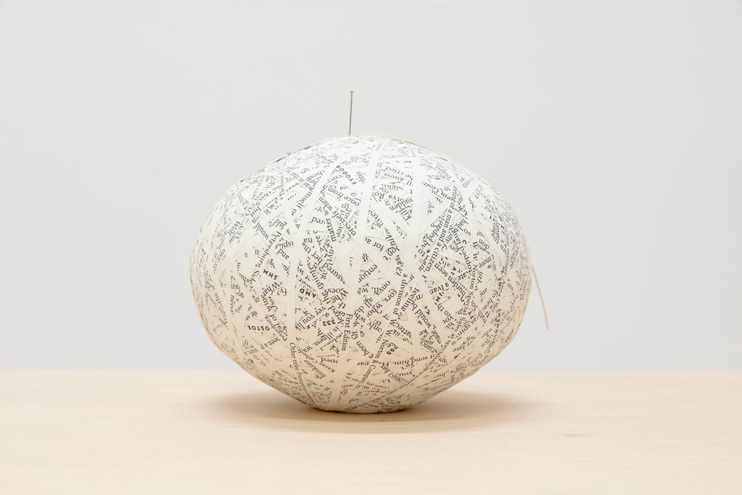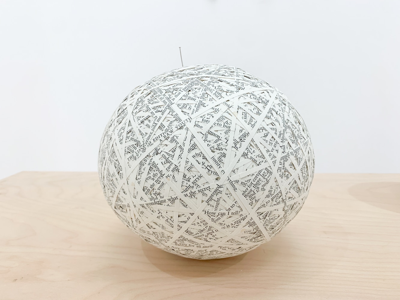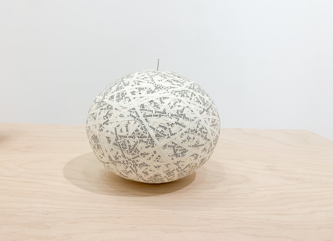 Five sculptures on a table are the centerpiece of the gallery. Deconstructed books reconfigured as continuous balls of string, the paper sculptures are shown here for the first time, a massive undertaking McClure has been working on since 2018. The sculptures are complete reconstructions of Fyodor Dostoyevsky’s five major novels, The Idiot, The Brothers Karamazov, Crime and Punishment, The Possessed, and A Raw Youth. These behemoths are collectively known as The Five Elephants, a phrase coined by Svetlana Geier, perhaps the world’s greatest translator of Russian literature, who spent her life retranslating these texts into German, offering a new reading of the masterpieces.