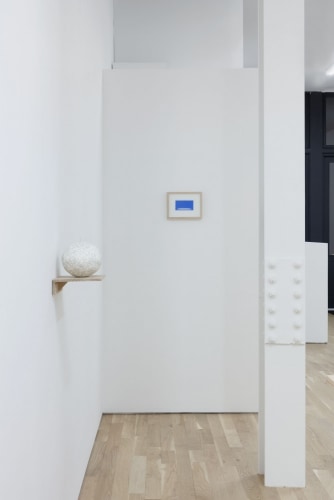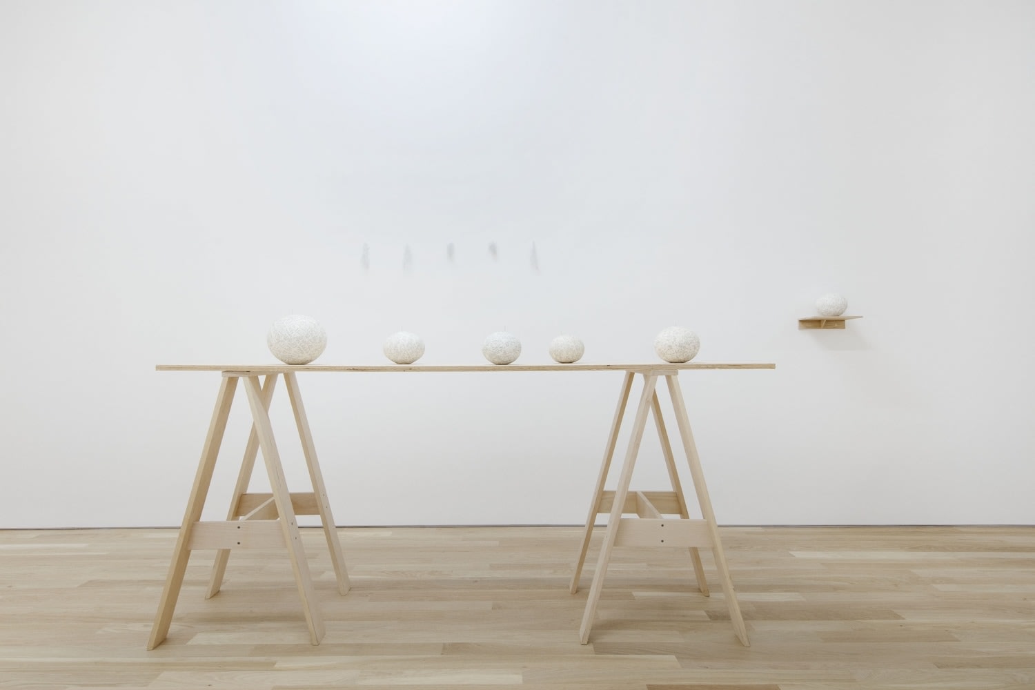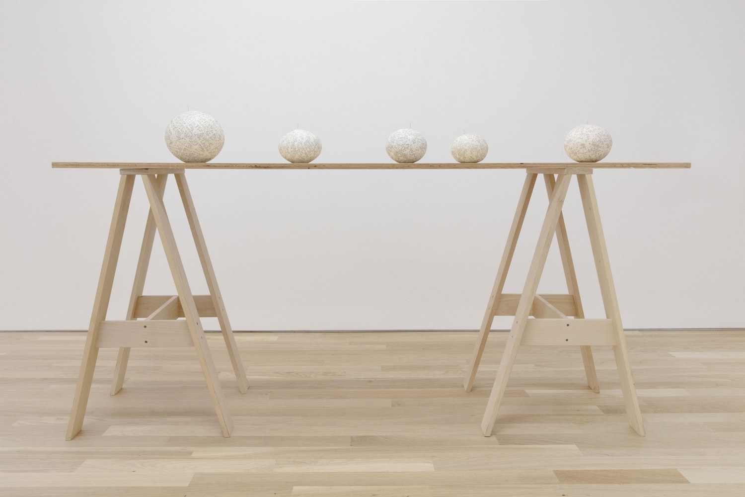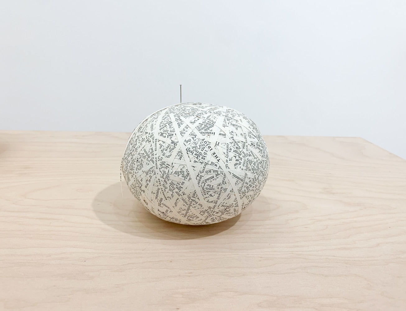 Five sculptures on a table are the centerpiece of the gallery. Deconstructed books reconfigured as continuous balls of string, the paper sculptures are shown here for the first time, a massive undertaking McClure has been working on since 2018. The sculptures are complete reconstructions of Fyodor Dostoyevsky’s five major novels, The Idiot, The Brothers Karamazov, Crime and Punishment, The Possessed, and A Raw Youth. These behemoths are collectively known as The Five Elephants, a phrase coined by Svetlana Geier, perhaps the world’s greatest translator of Russian literature, who spent her life retranslating these texts into German, offering a new reading of the masterpieces.