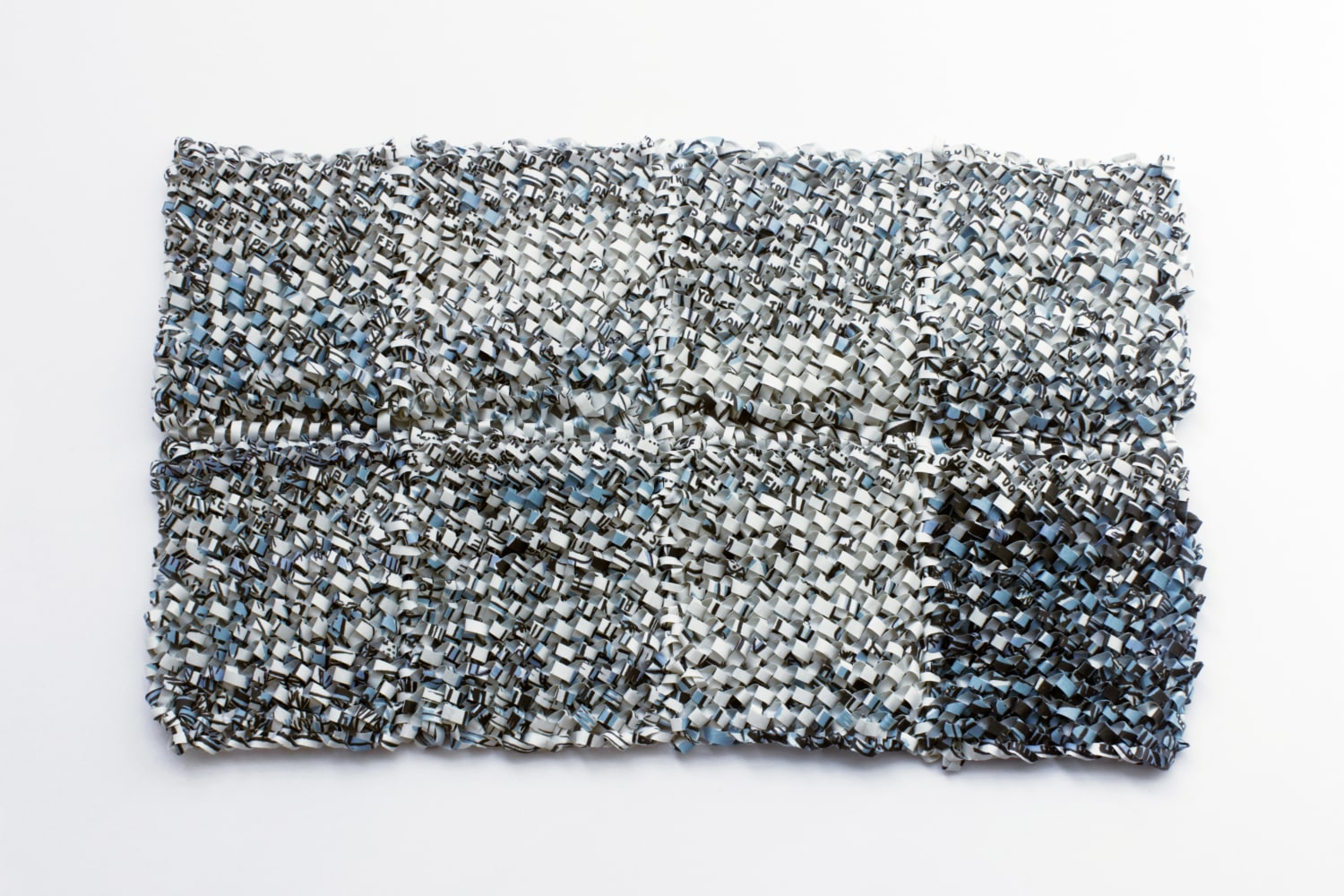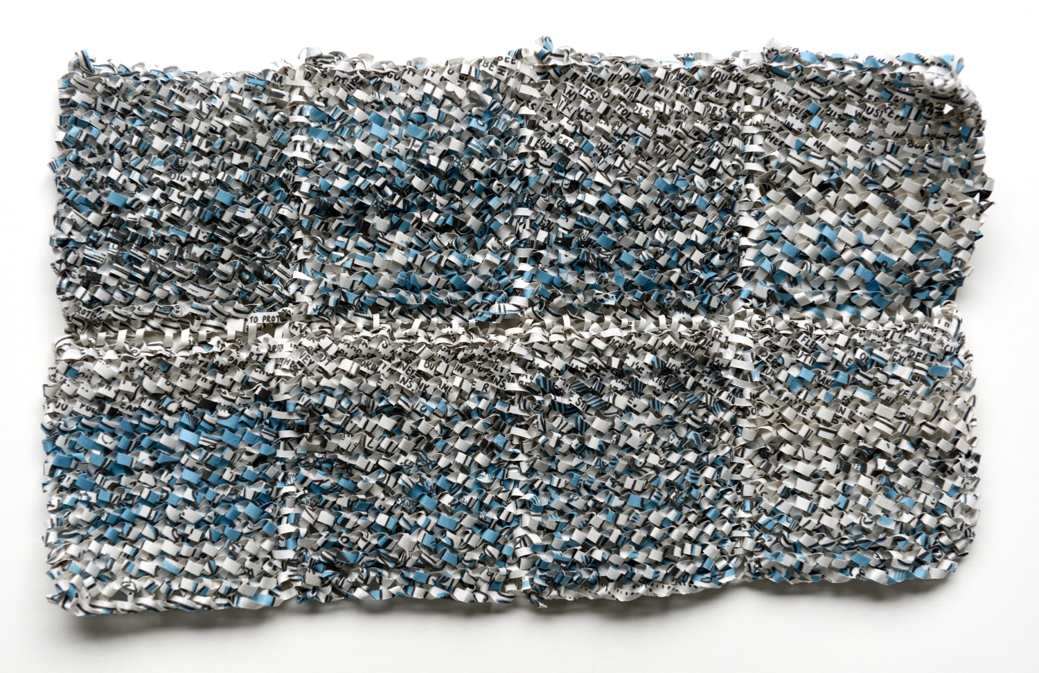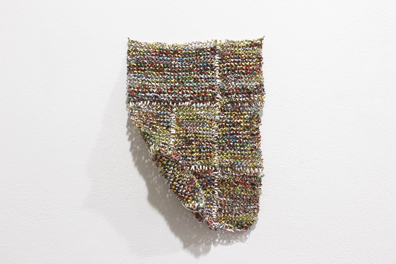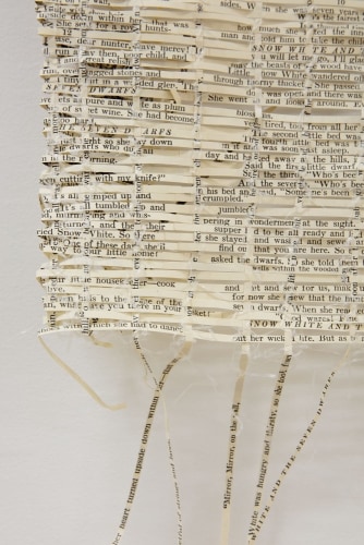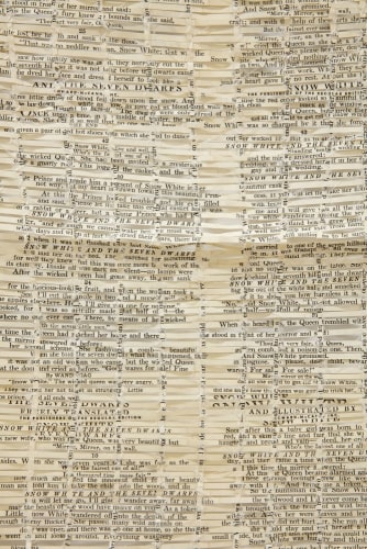Much of McClure’s practice involves using processes more often applied to textiles than paper. She has created a series of finely woven objects reminiscent of wall tapestries. Wonder Woman, one of the most powerful superheroes in the DC universe, battles an evil group of mermaids created from tiny sharks. The comics, cut into strips and hand knit back together, are transfigured into a delicate fabric, weaving alternate storylines that are barely perceptible.