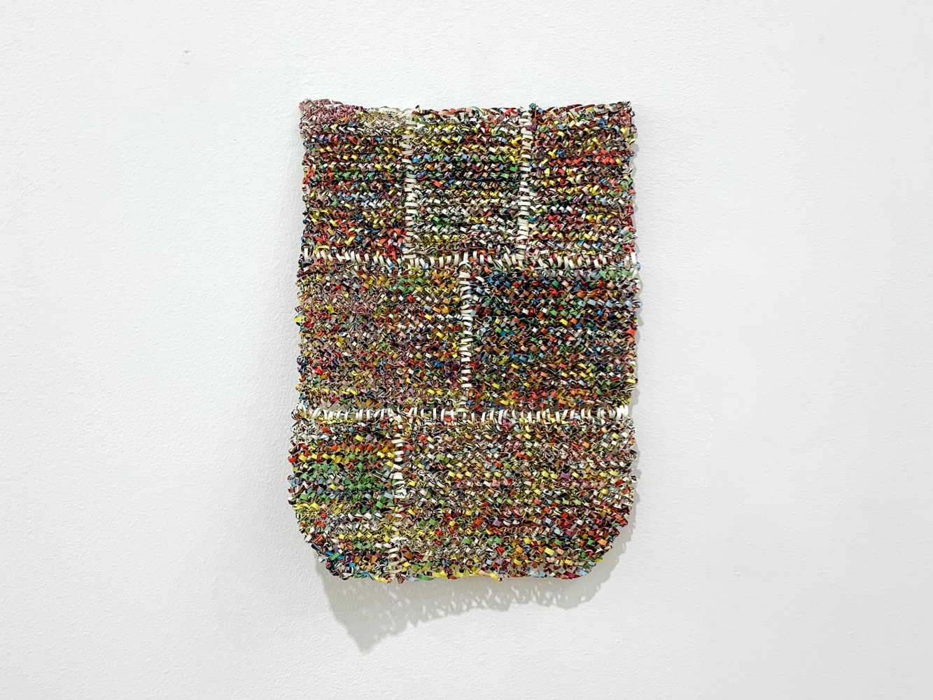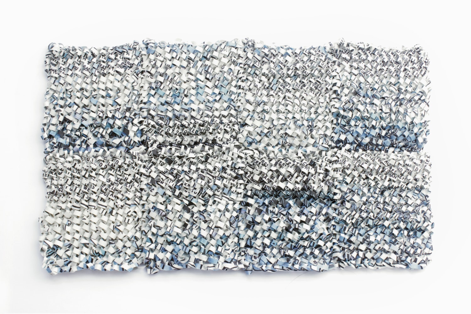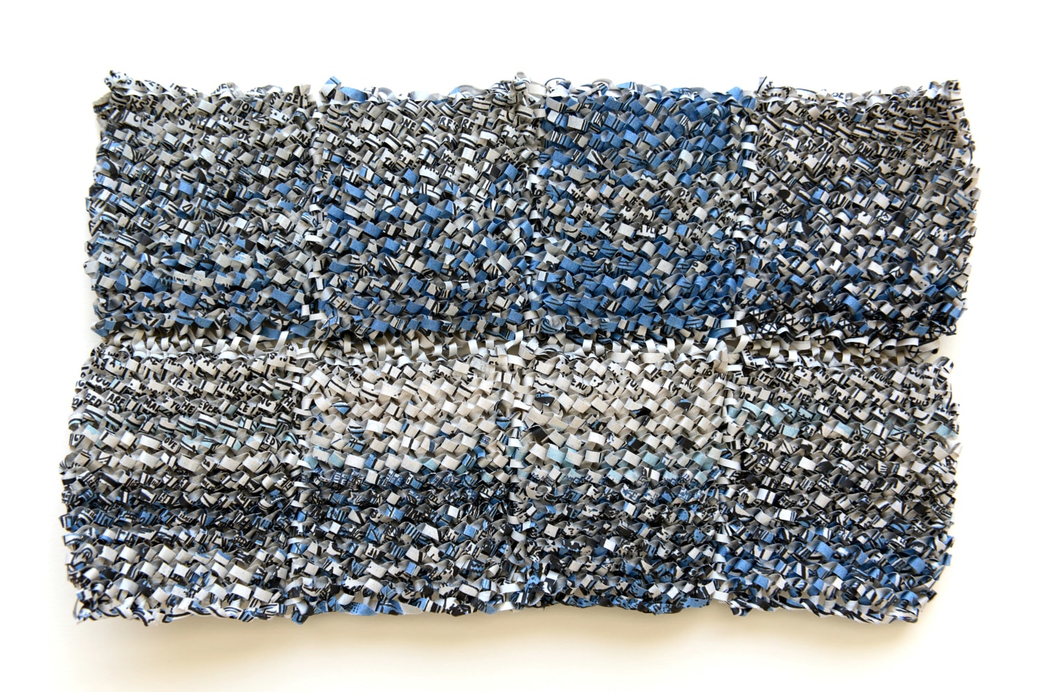 Much of McClure’s practice involves using processes more often applied to textiles than paper. She has created a series of finely woven objects reminiscent of wall tapestries. Wonder Woman, one of the most powerful superheroes in the DC universe, battles an evil group of mermaids created from tiny sharks. The comics, cut into strips and hand knit back together, are transfigured into a delicate fabric, weaving alternate storylines that are barely perceptible.