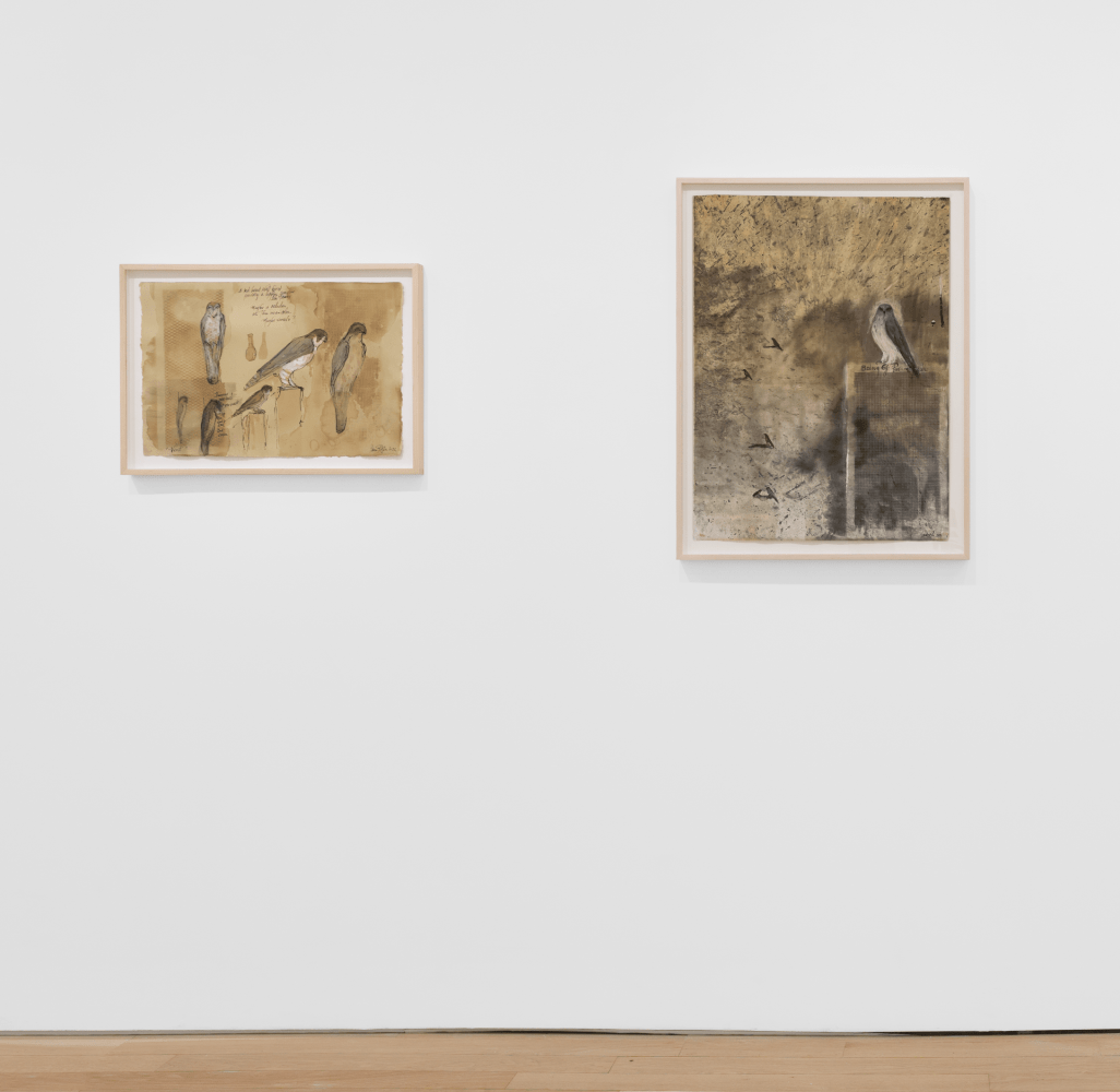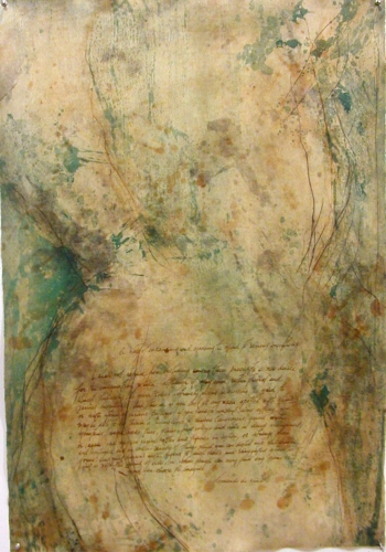 Among the works on paper is a hand-colored multimedia print incorporating a text by Leonardo da Vinci: "If you look at any walls soiled with a variety of stains, or stones with variegated patterns, when you have to invent some location, you will therein be able to see a resemblance to various landscapes graced with mountains, rivers, rocks, trees, plains, great valleys and hills in many combinations…And what happens with regard to such walls and variegated stones is just as with the sound of bells, in whose peal you will find any name or word you care to imagine."