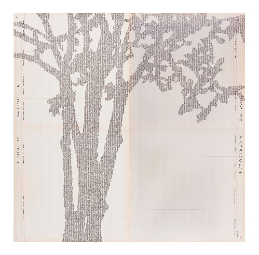 In Perímetros, it is neither photographic paper nor the accessories of the trade that constitute the primary element of her work, but rather the typed text of the agrarian law of 2011. On the blank pages of old land registry books, it takes the outlines of trees, planted by landless campesinos.