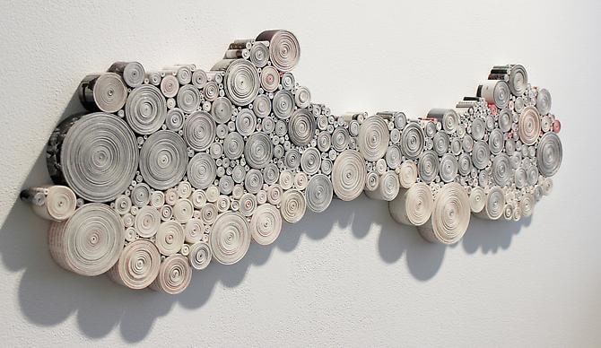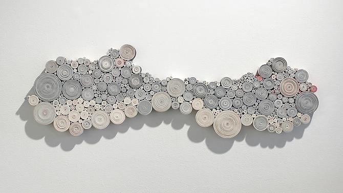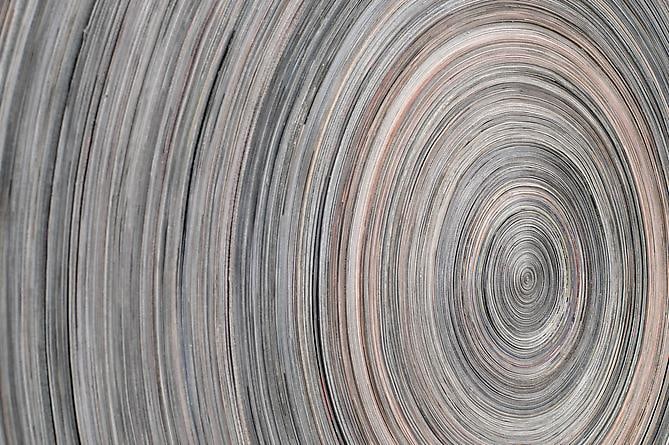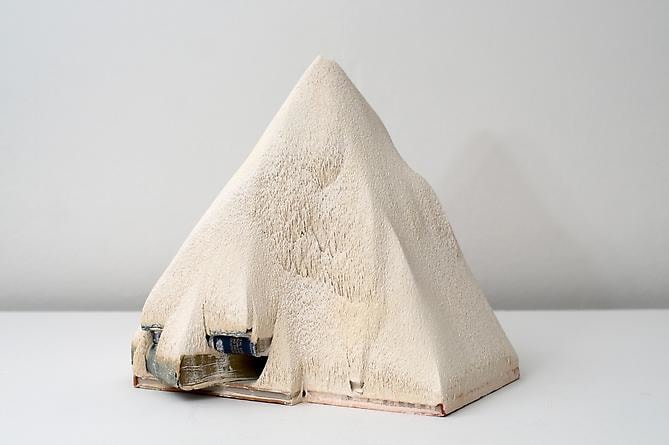 Access denial is one of Callan’s favored strategies. In "The Solution", books that form the footprint of the mountain are held in sedimentary layers. "Flowers Arranged" and "Sweden" are entombed books, monuments to themselves. Linear fault lines - the edges of the paper - are all that remain visible. Access to information is also denied in "Cosmos" and "China", where entire books are cut into strips and wound upon themselves. The spiral shape alludes to other forms of data storage - vinyl records, hard drive disks and scrolls.