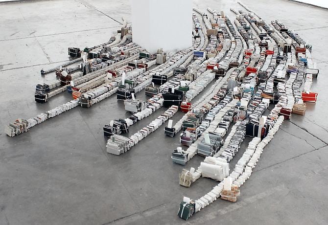 "Bind" is a floor installation composed of 116 books taken apart with pages folded in on themselves, rather like the paper a diamond dealer uses to hold stones, or the paper a cocaine dealer might use for individual wraps. The pages are bound with cable ties, the manacle of choice for the modern military. The piece is laid out as raised furrows, or a larger illustration of badly justified typography. The taxonomy of this random library is almost entirely physical with a certain degree of menace.
