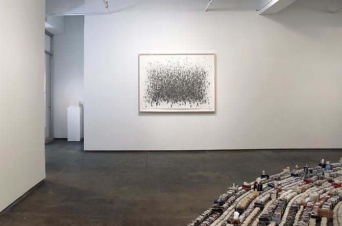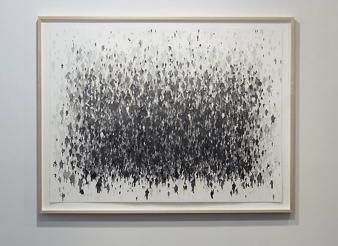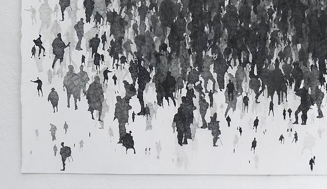"We Are Also Too Many" is a visual counterpoint to the rest of the show. The graphite drawing sourced from images of walkers from different publications, reveals a human landscape at the point of collapse.