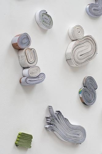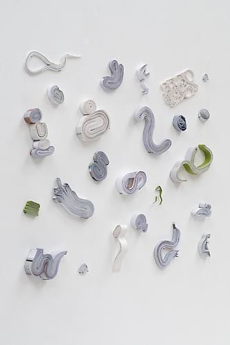 "24 Sculptures from Richard ISBB 978-1-91702-37-8" is a personal workshop in memory and perception. The catalog of Richard Tuttle's solo show is transformed into 24 wall sculptures. Callan first saw Tuttle’s work in the flesh in 1980, it was a tiny piece of rope occupying a huge wall. This work is in remembrance of that. Remembering it 24 times, or as long as the catalog gave out.