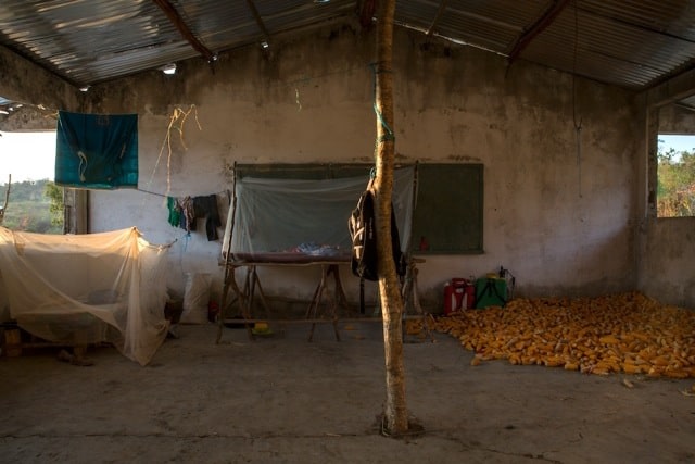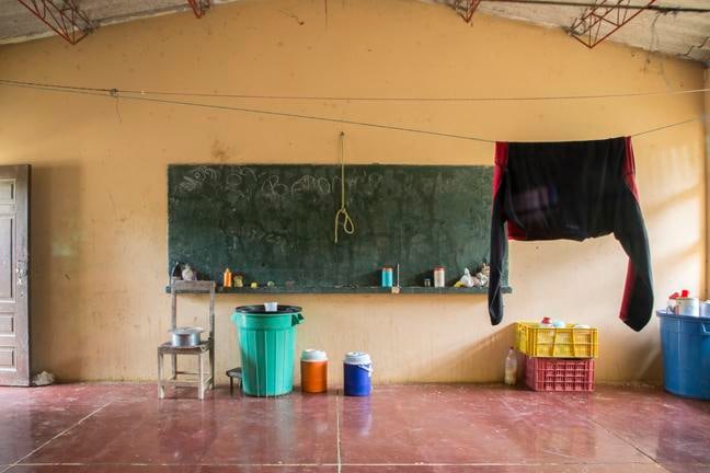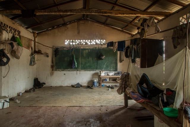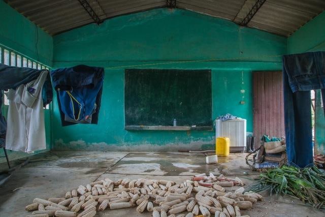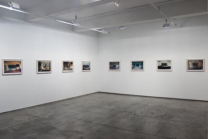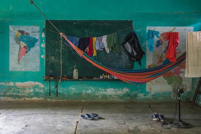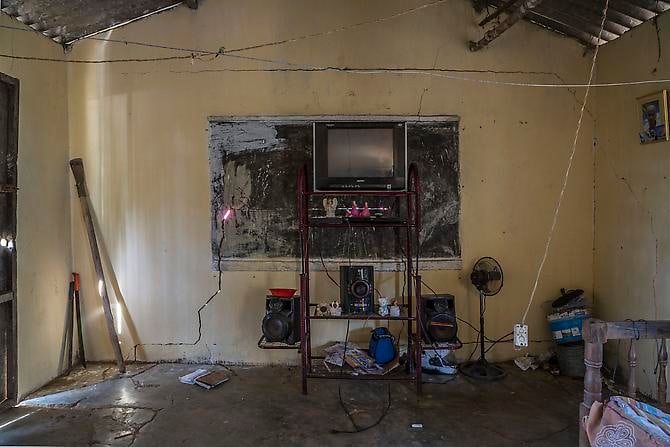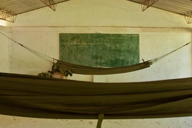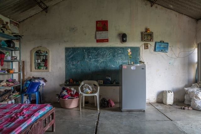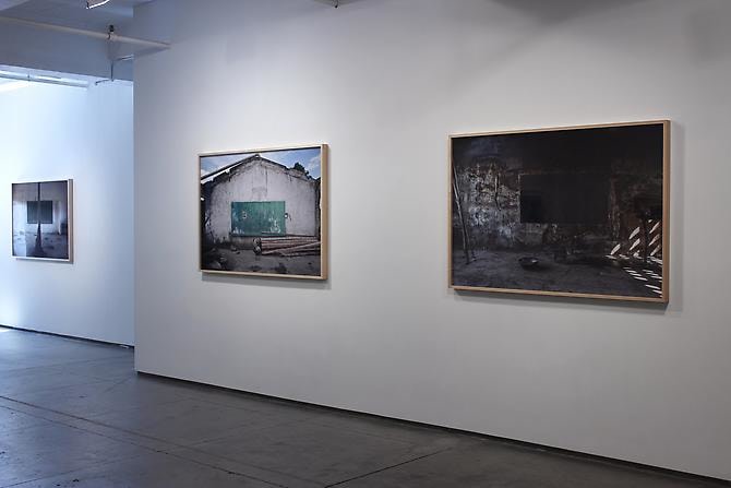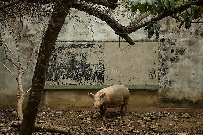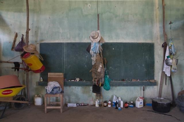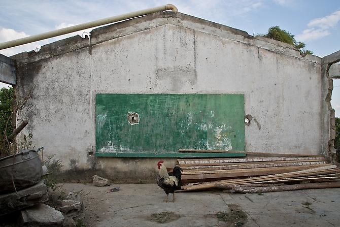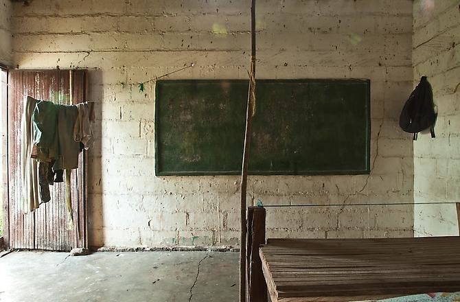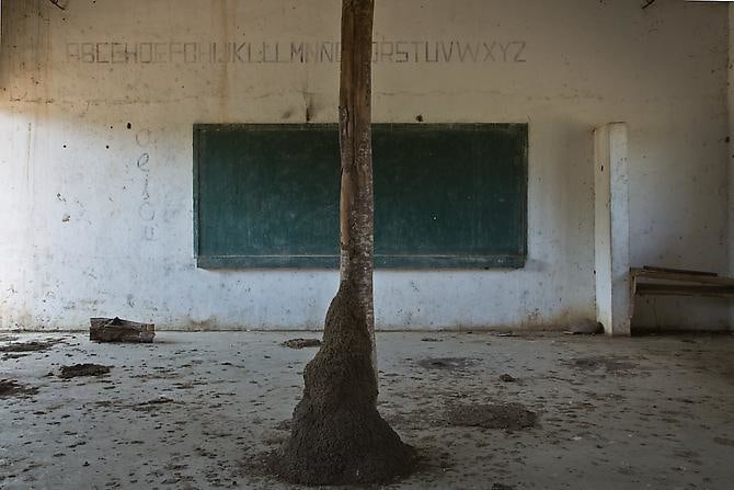 In Silencios, a suite of twelve photographs taken between 2010 and 2013, Echavarría documents the mutation of the function of the classroom space. Over time, a former classroom is overtaken as a living space by displaced farmers. Makeshift beds, plastic chairs, assorted cans, and other daily objects constitute the very idea of displacement in a form of reverse archeology. Ruins slowly become inhabited again. With their emptiness and muteness, the photographs articulate a ceremonial metaphor, creating spaces of communion where letters, numbers, and the voices of children once silenced, can begin to be heard again as timid signs of life start to accumulate. During these long journeys, Echavarría has been confronted by unexpected encounters he names Testigos. A pig, a cat, and a termite nest become silent witnesses testifying for the children’s absence.