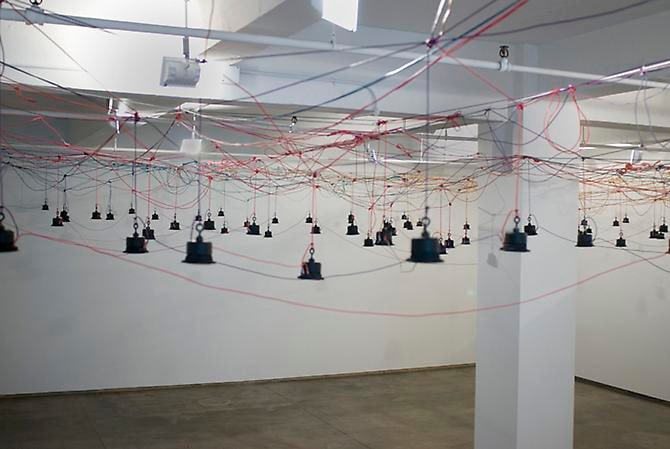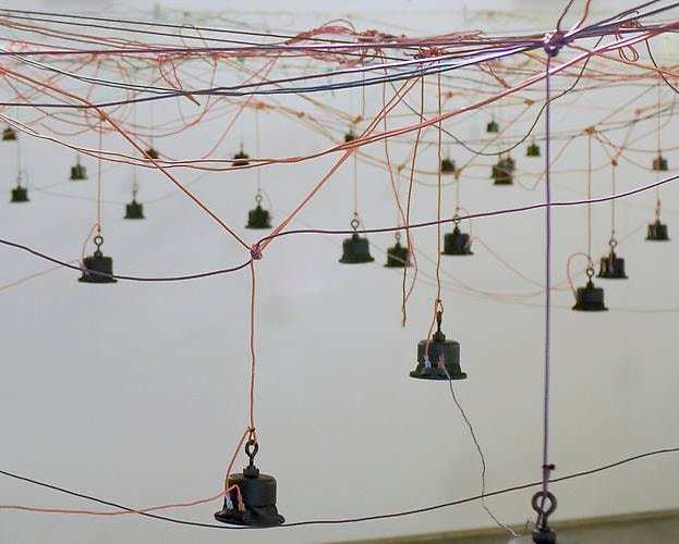 In Terrain, twelve channels of sound move through a colorful web of wire and speakers to create a dynamic sonic landscape. Utilizing over a hundred speakers to emit hums and hushed whispers, the piece emanates sounds reminiscent of stormy weather, blowing leaves or a gentle wind. To make the soundtrack for the piece, Julianne Swartz asked thirty-eight volunteers to envision a loved one, and to speak into a microphone as though whispering in that person's ear. Swartz has woven these intimacies so that visitors will hear abstract affective tones, interspersed with discernible moments of conversation. The layering and merging of disparate voices and languages constructs an aural topography of human sentiment.