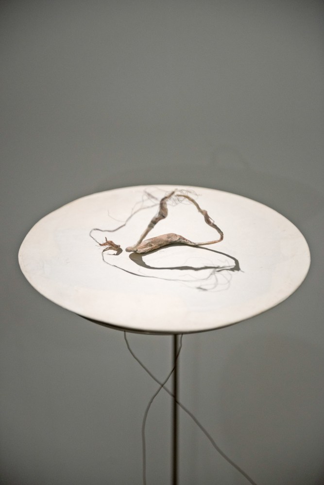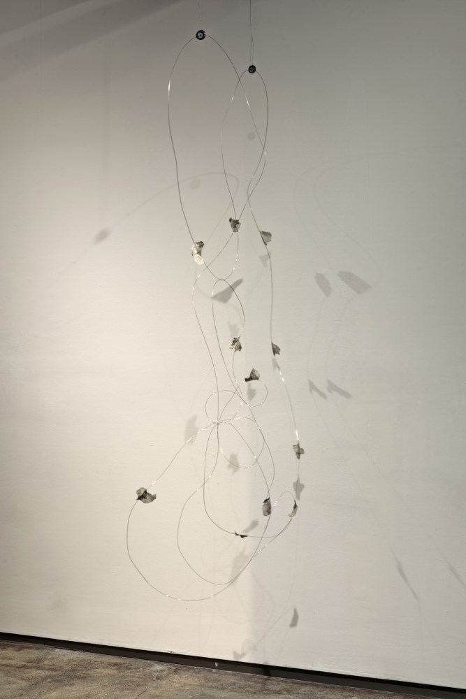 Each Bone Score transmutes sound to be visual and tactile. Sculptures made of wire, paper, ceramic, and magnets act as functional “speakers” that translate a score of sounds to vibration and gesture. The energy of sound is dispersed through both aurality and action. Movements in the sculptures have an uncanny familiarity as they demonstrate the attack and release of both recognizable and uncommon sounds. Material trembles and palpitates in uncertainty, actualizing restlessness and unease.