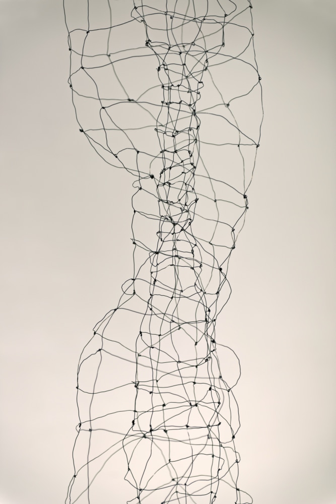 The Void Weave sculptures are containers, cavities and pouches, woven and spun from steel and electrical wire. Some of the wire is impossibly thin, like hair. Each vessel uses a different weave, dialect and behavior to hold form. They are unguarded and soft. Some of the Void Weaves carry electrical current, producing shudders and vibrations through the wires. Tenuous lines delineate and hold space. Emptiness becomes substance.
