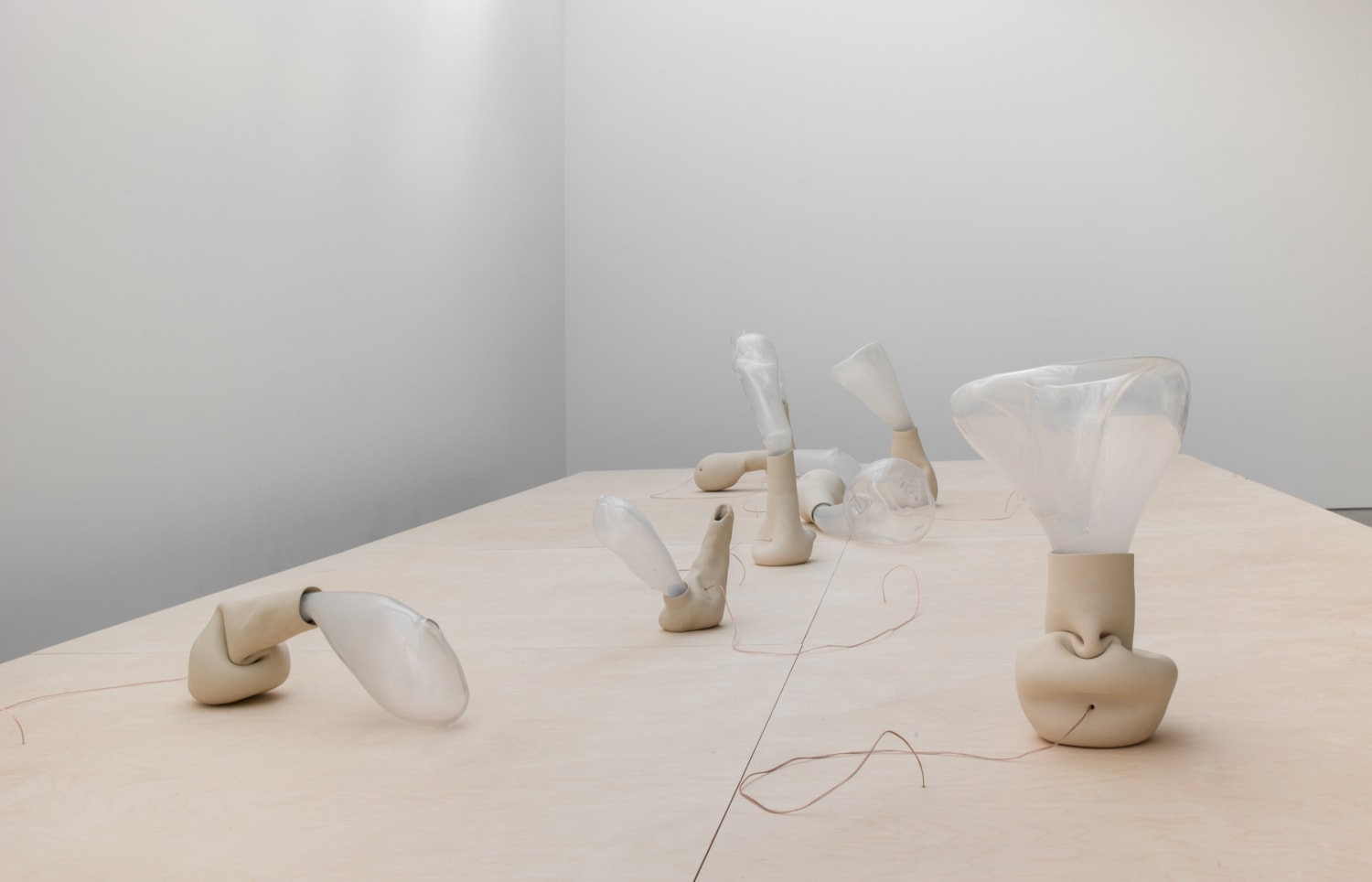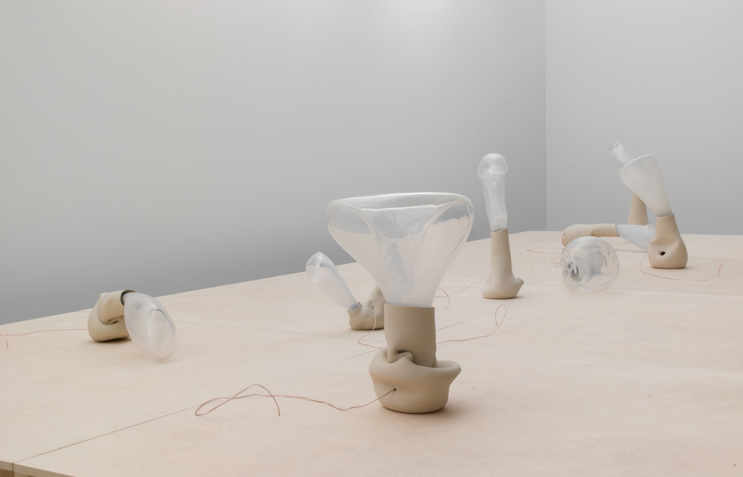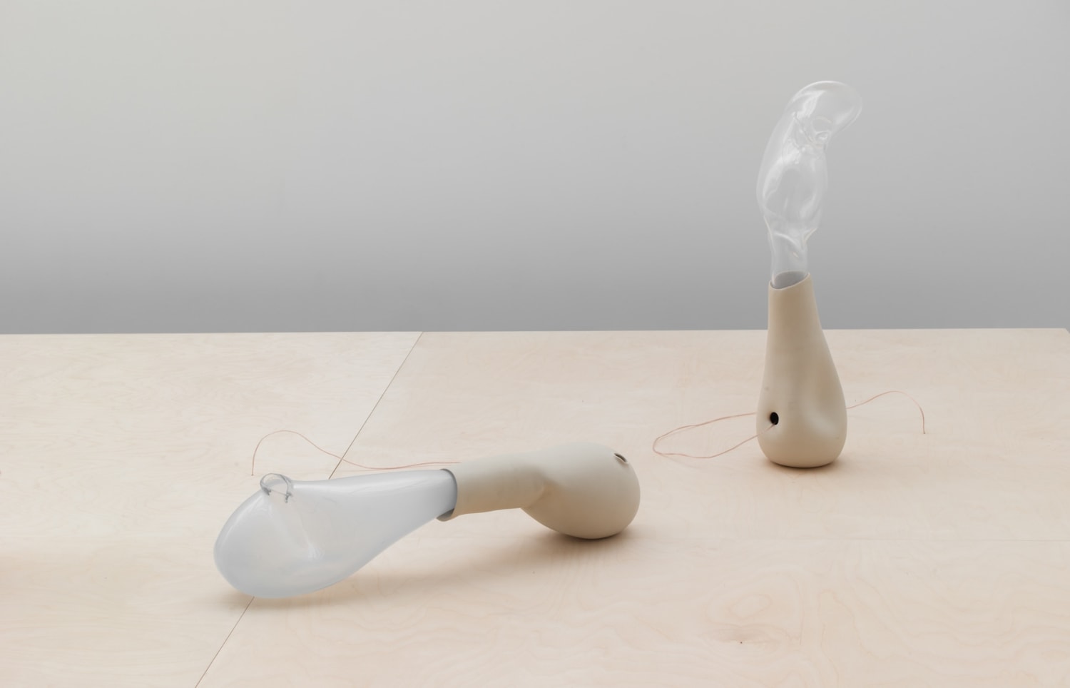 Using the acoustically reflective materials of ceramic and glass, Swartz has built a group of hybrid instruments that suggest corporeal forms. Visibly handcrafted, these vessels resemble deflated limbs, distended organs, or industrial objects that have slumped and folded in the course of their making (2). The forms are familiar and foreign, very much their own bodies. Utilizing an electronic feedback process, Swartz locates the pure Sine tones, resonant in each vessel, with no additive sound. The unique shape, size, and orifices give each its own voice. Swartz’s objects explore the ways in which sculptures, bodies, and the buildings they occupy can be synchronized as resonant chambers for pure sound.