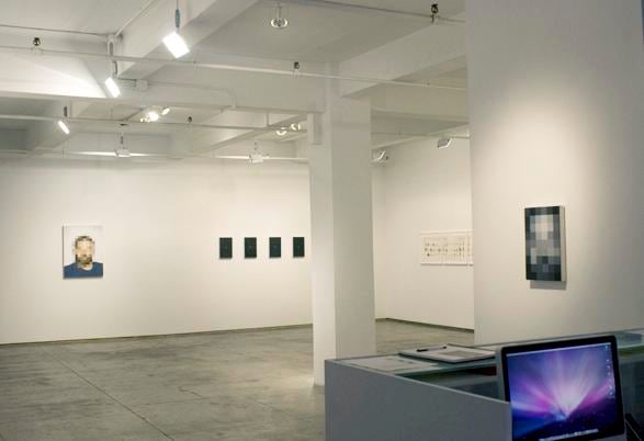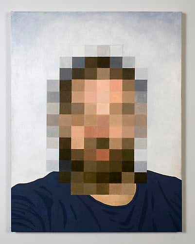 A group of Google Portraits are visual preservations of a fleeting moment. Fossils of digital information, they translate the results from image searches into watercolor. Three Face Book homepages of various people who share the name Kenneth Solomon explore notions of cyber and digital identity. I Didn’t Do It is a self-portrait, censored behind a pixilated grid obliterating the face. Powering Off …Quarter Moon...Six O’Clock is a sequence of five small paintings of a screen shutting down with its center wheel shifting grey scale around the clock.