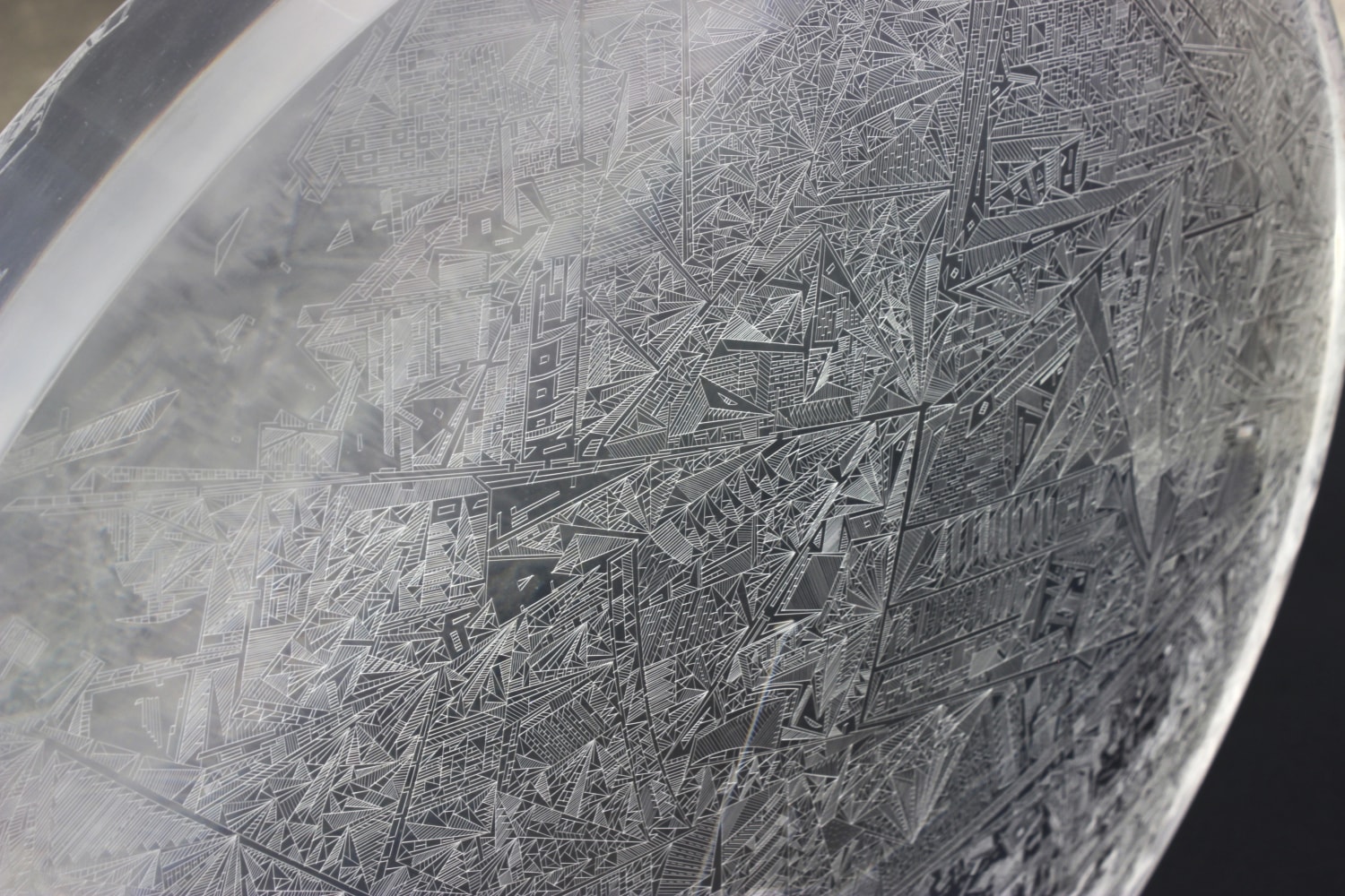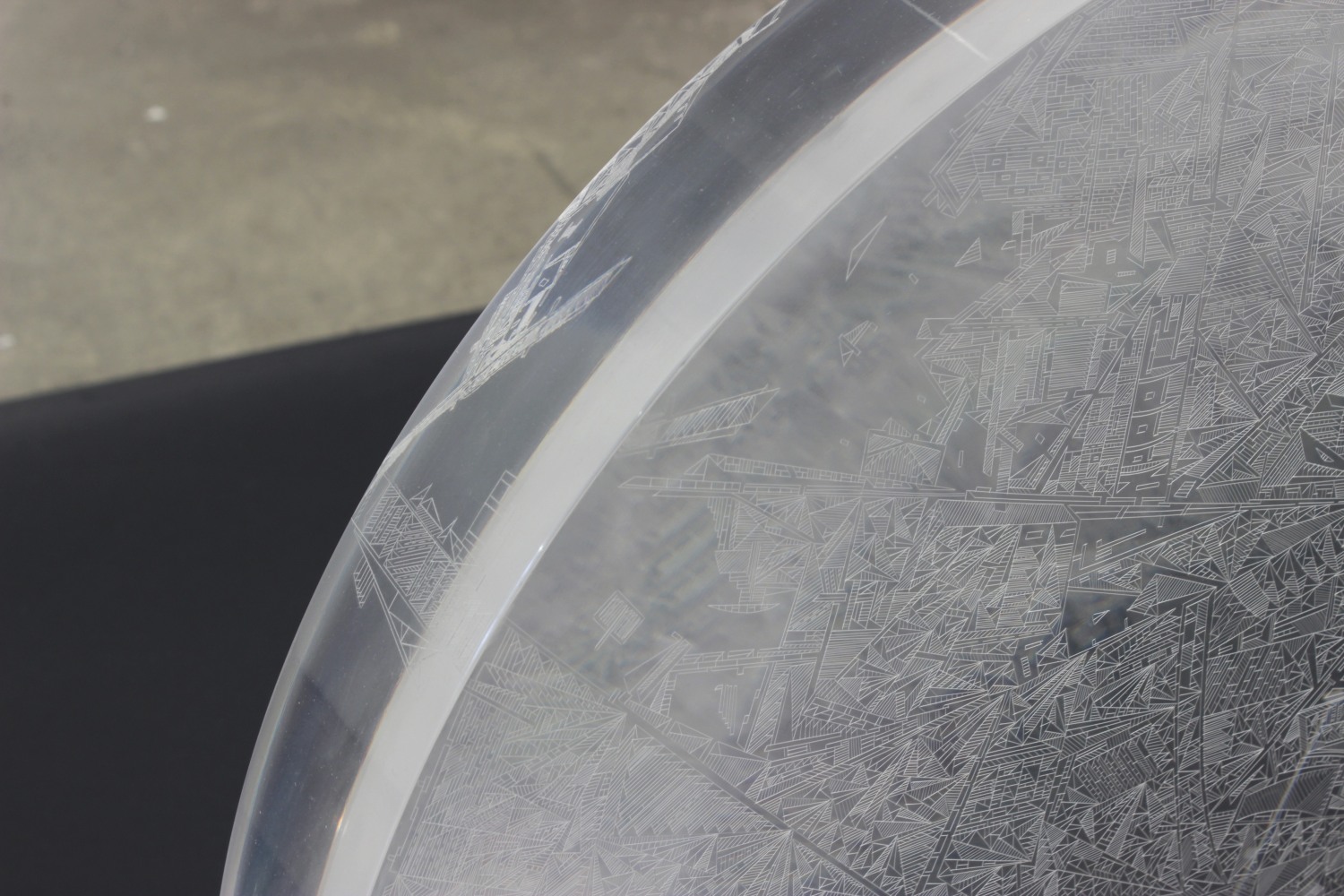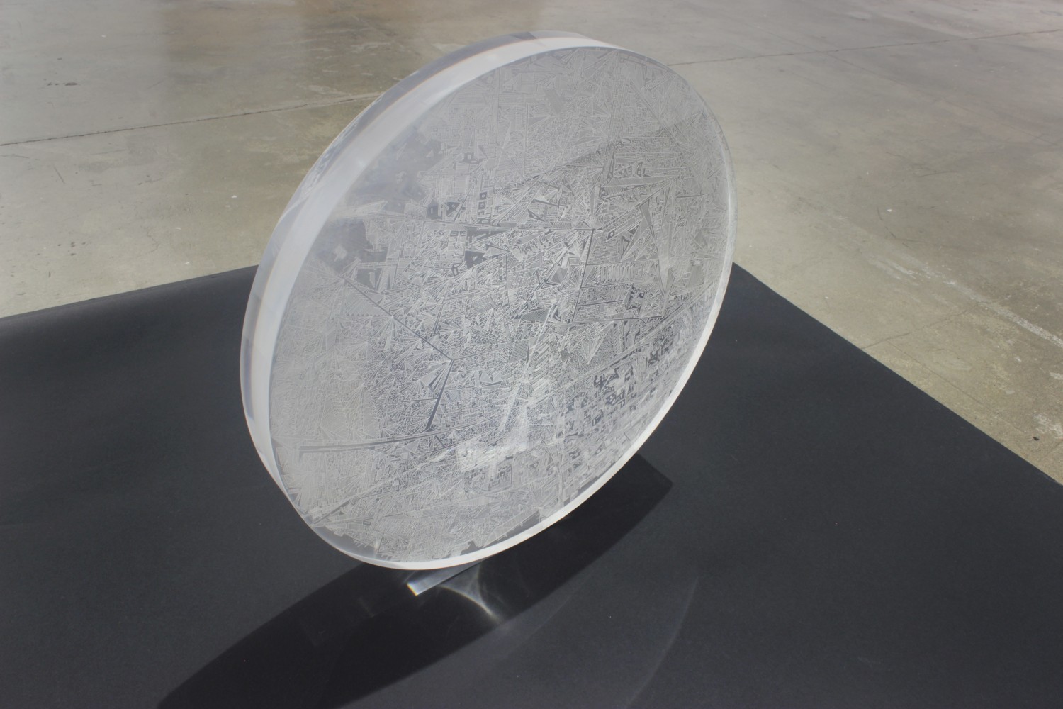 Marco Maggi, Paperweight, 2016, cuts on plexiglas, paper, plexiglas: 20 in diameter x 3.5 in depth, 14 sheets of paper: 53 x 53 in