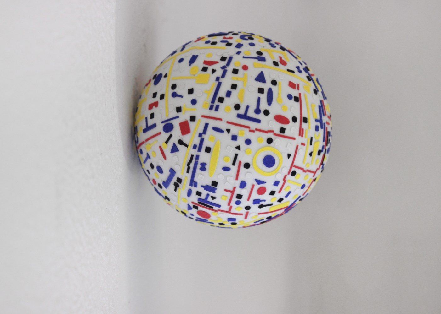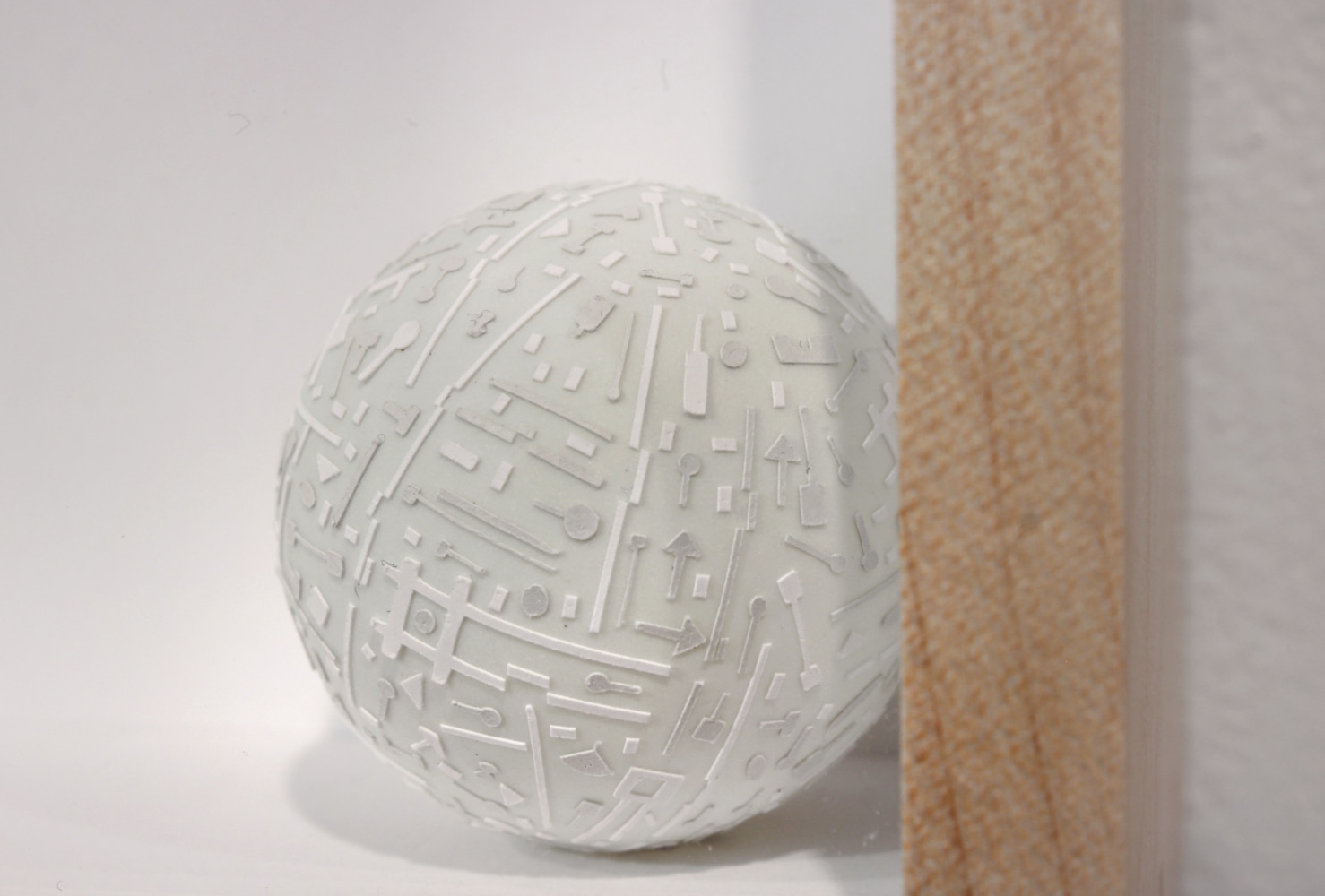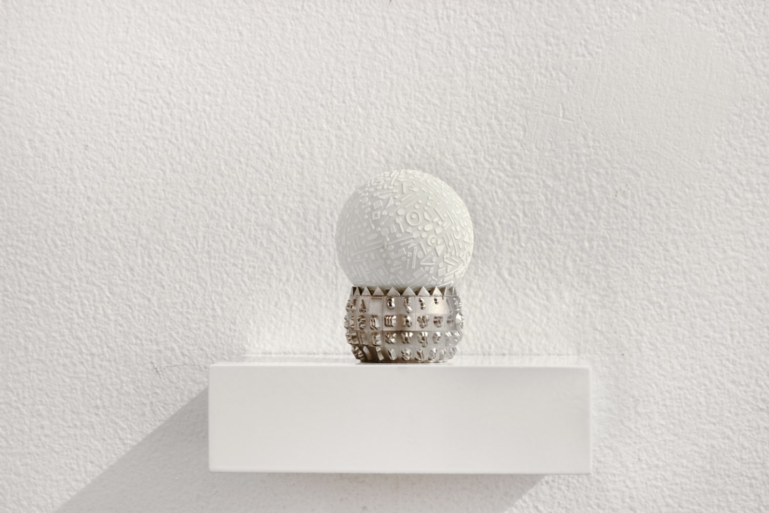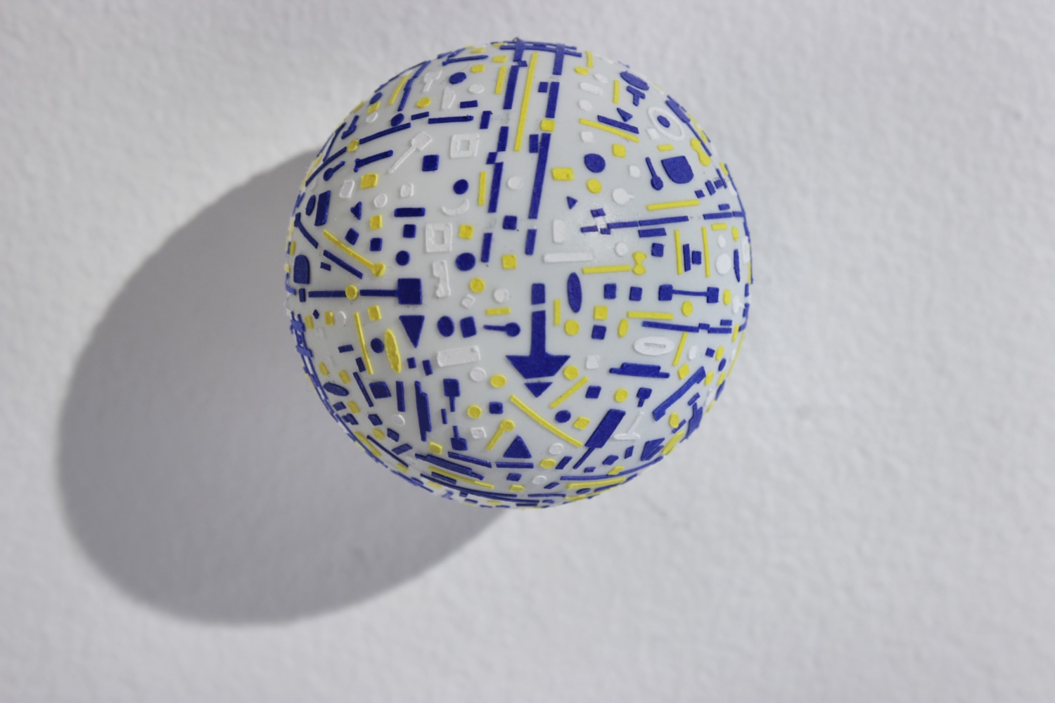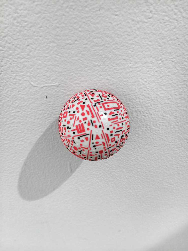Marco Maggi, Language in Residence, 2016, self-adhesive archival paper on ping-pong ball, metal, 2.25h x 2w inches on 1.25h x 4.2w