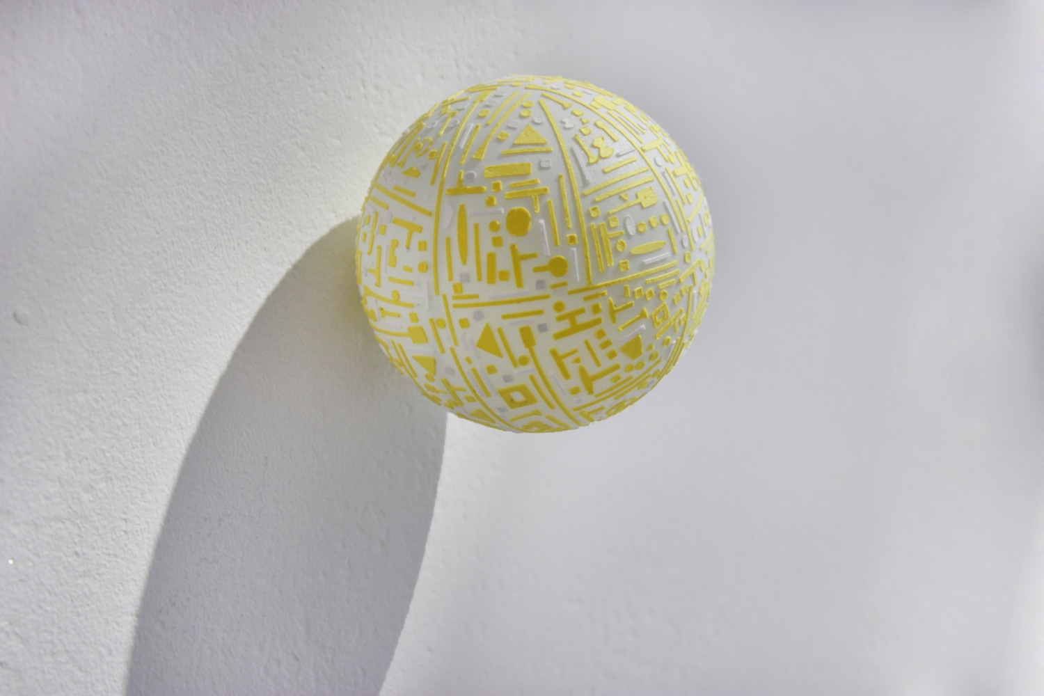 Marco Maggi, Newton, 2016, cuts on paper on 4 ping-pong balls, 1.5 inch diameter each ping-pong ball, 60h x 1.5 inches overall