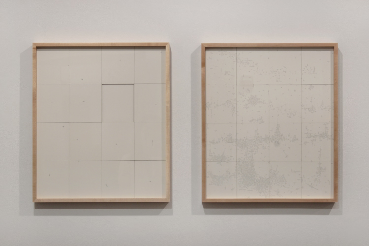 Marco Maggi, 15 Starting Points, 2016, pencil on 16 clayboards each panel, diptych: 20.75h x 17.75w inches framed each