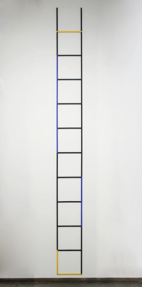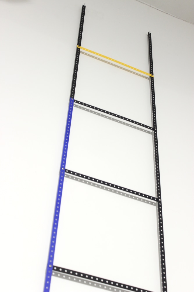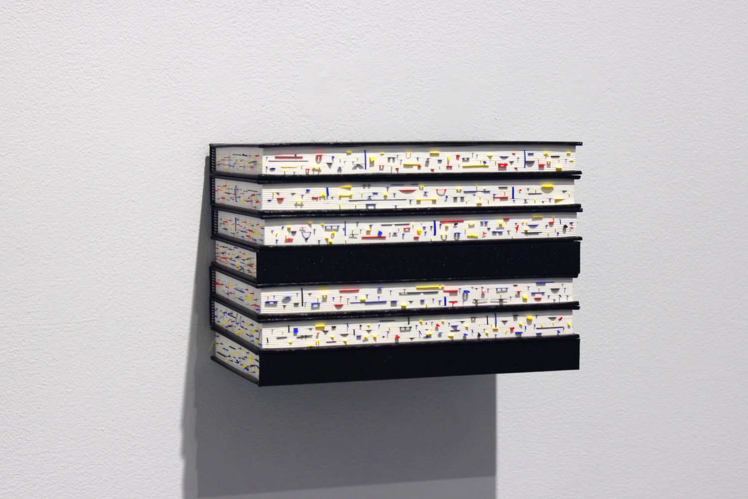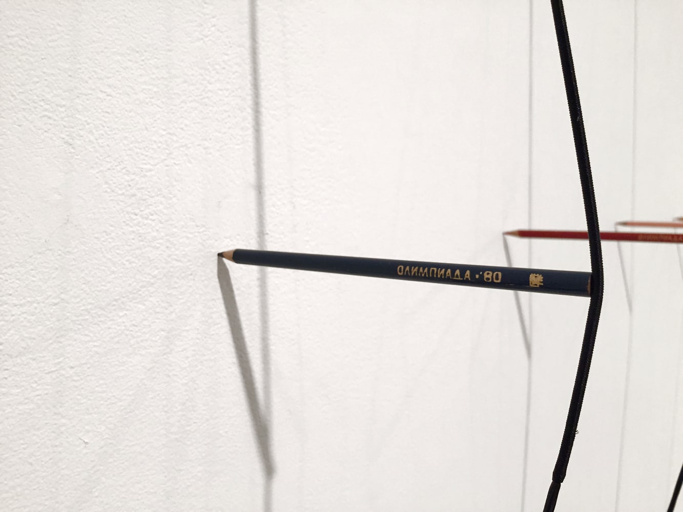 In Putin’s Pencils, ten pencils are pointed against the wall, held by the tensions of bowstrings, ten arrows ready to be projected. The trajectory of these Soviet era color pencils is frozen, almost going backward in time. Leading to the project room, a ladder made of Fanfold, the already obsolete perforated computer paper, grows upward and downward from two dimensions to three-dimensional space in a symbiosis of hardware and software. Inside the room, two individual panels of cutout stickers face each other. Another wall installation, Stacking Quotes (Black Cachet), suspends bound sketchbooks with fragments of colored stickers pressed within their pages. These small referential stickers act as words cut out from a larger message, recoding the original context.