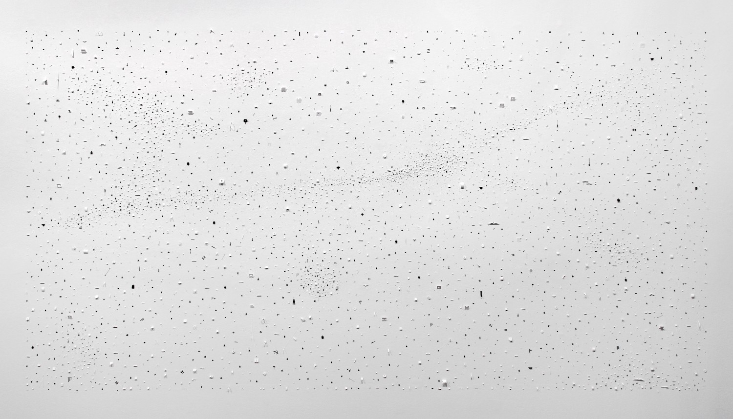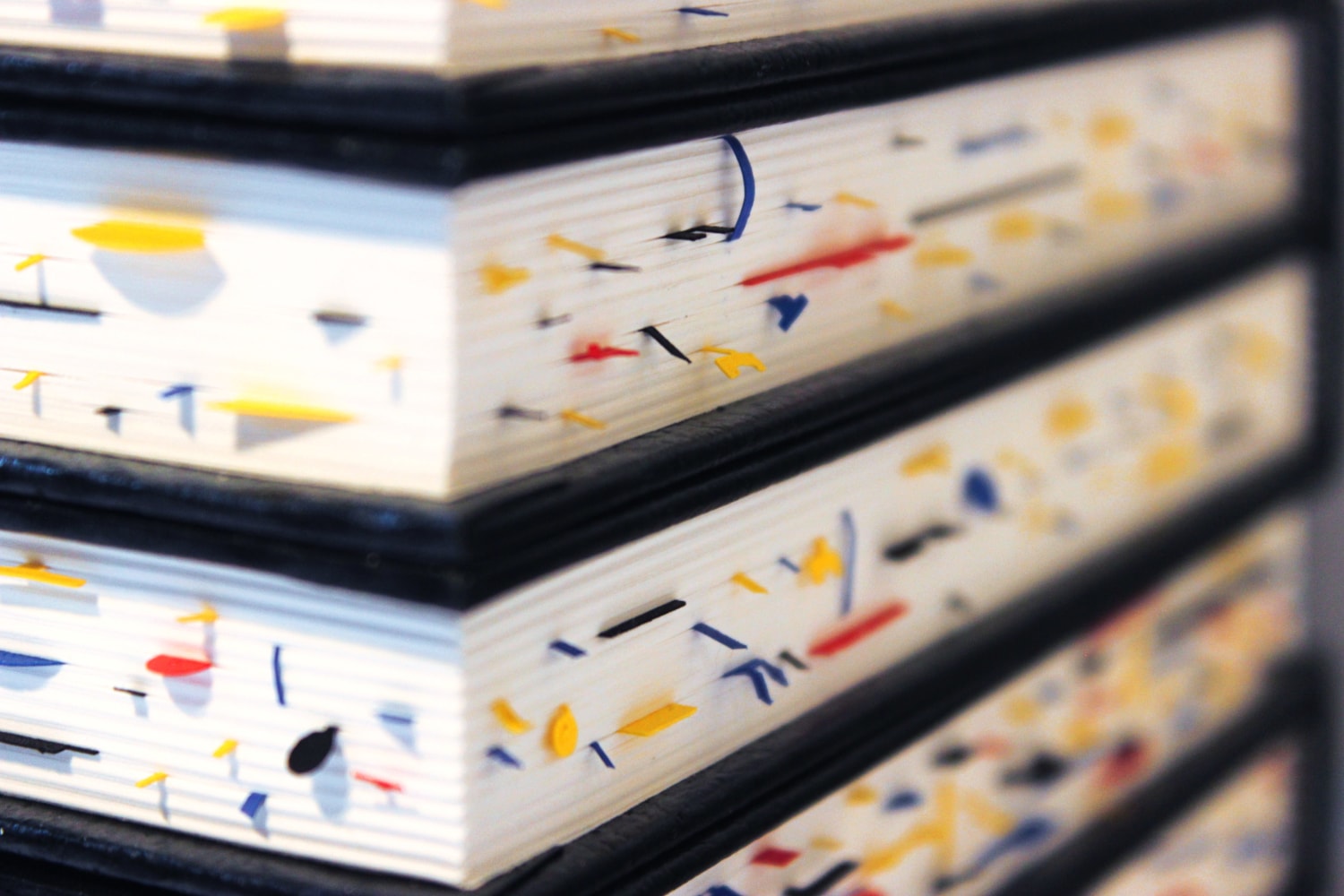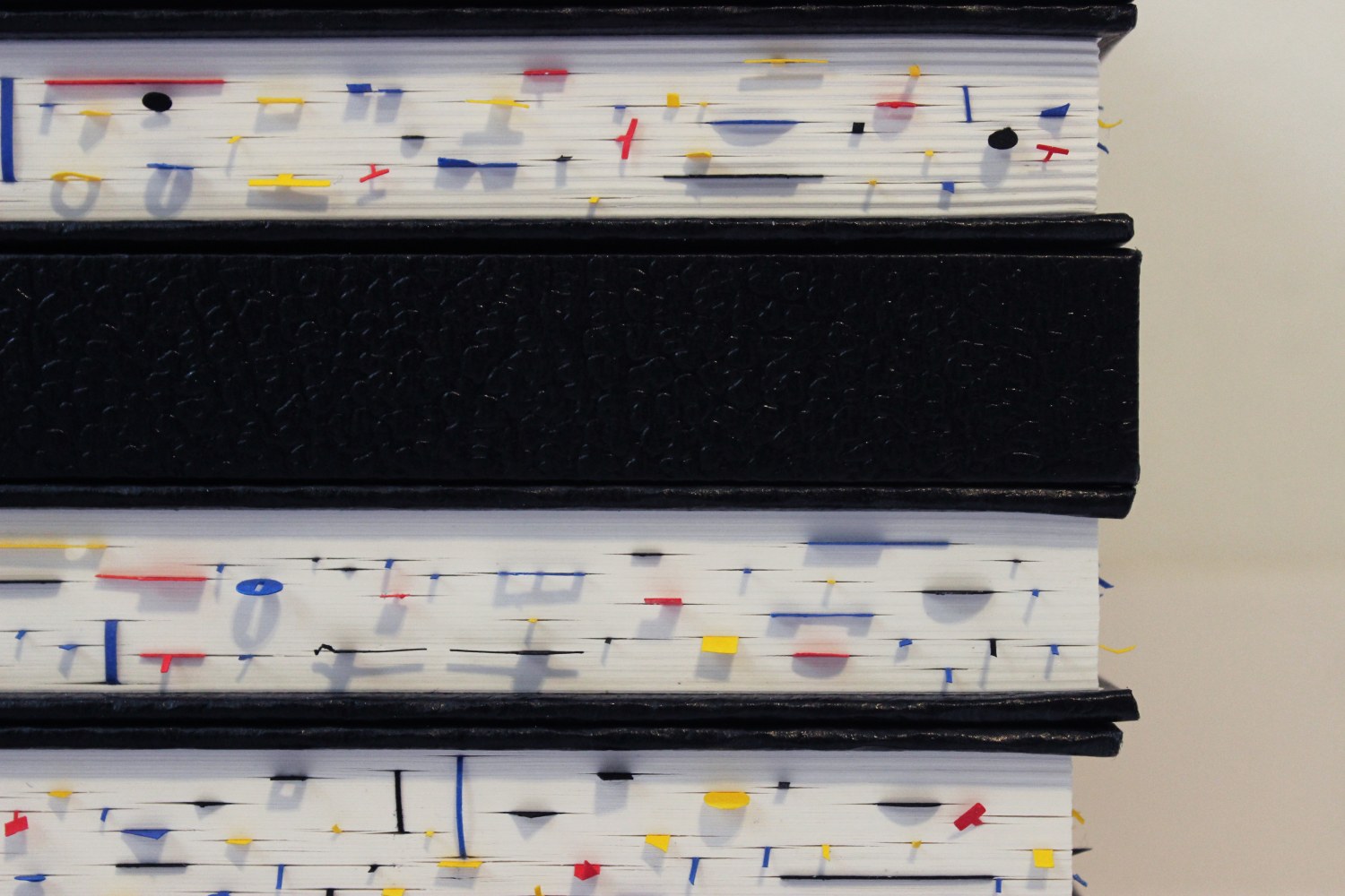 In Putin’s Pencils, ten pencils are pointed against the wall, held by the tensions of bowstrings, ten arrows ready to be projected. The trajectory of these Soviet era color pencils is frozen, almost going backward in time. Leading to the project room, a ladder made of Fanfold, the already obsolete perforated computer paper, grows upward and downward from two dimensions to three-dimensional space in a symbiosis of hardware and software. Inside the room, two individual panels of cutout stickers face each other. Another wall installation, Stacking Quotes (Black Cachet), suspends bound sketchbooks with fragments of colored stickers pressed within their pages. These small referential stickers act as words cut out from a larger message, recoding the original context.