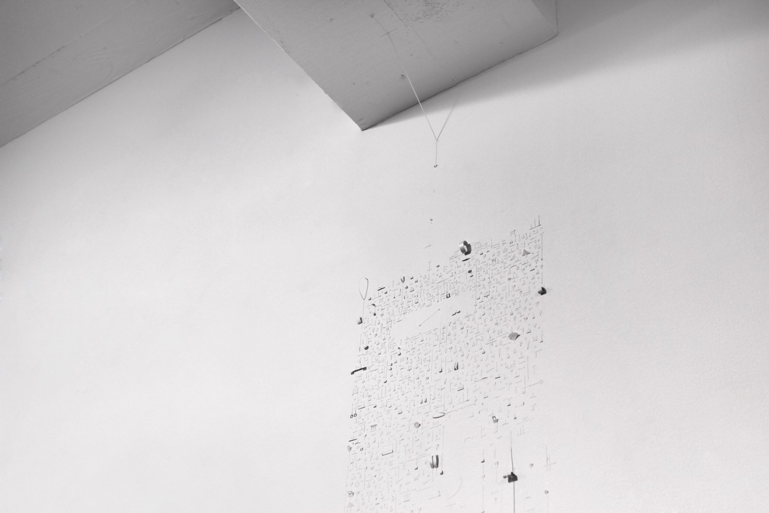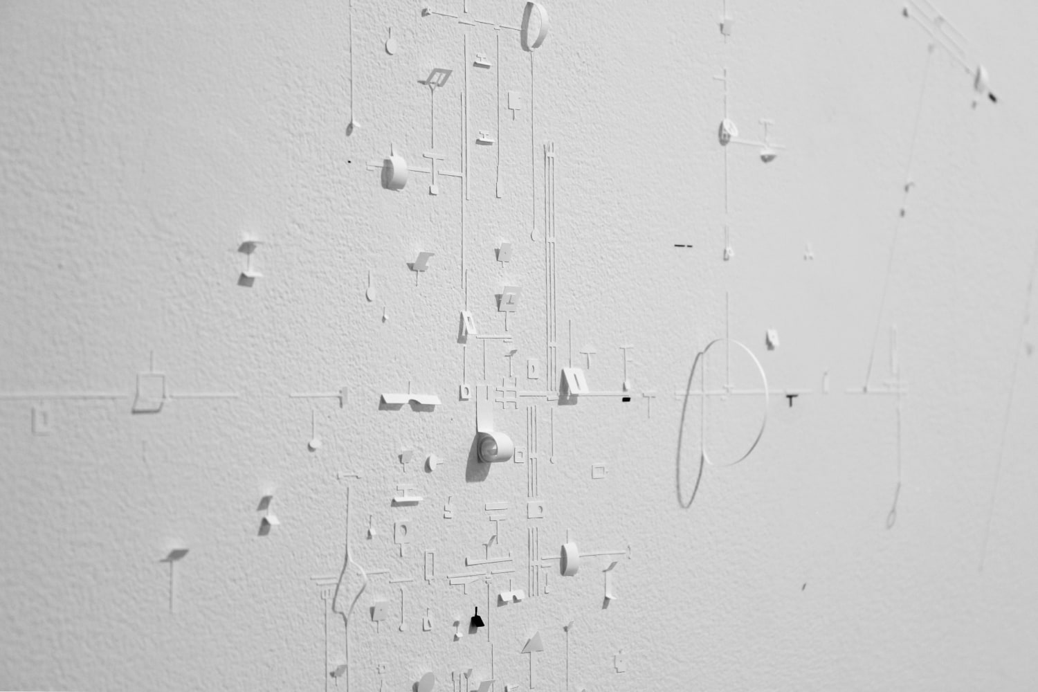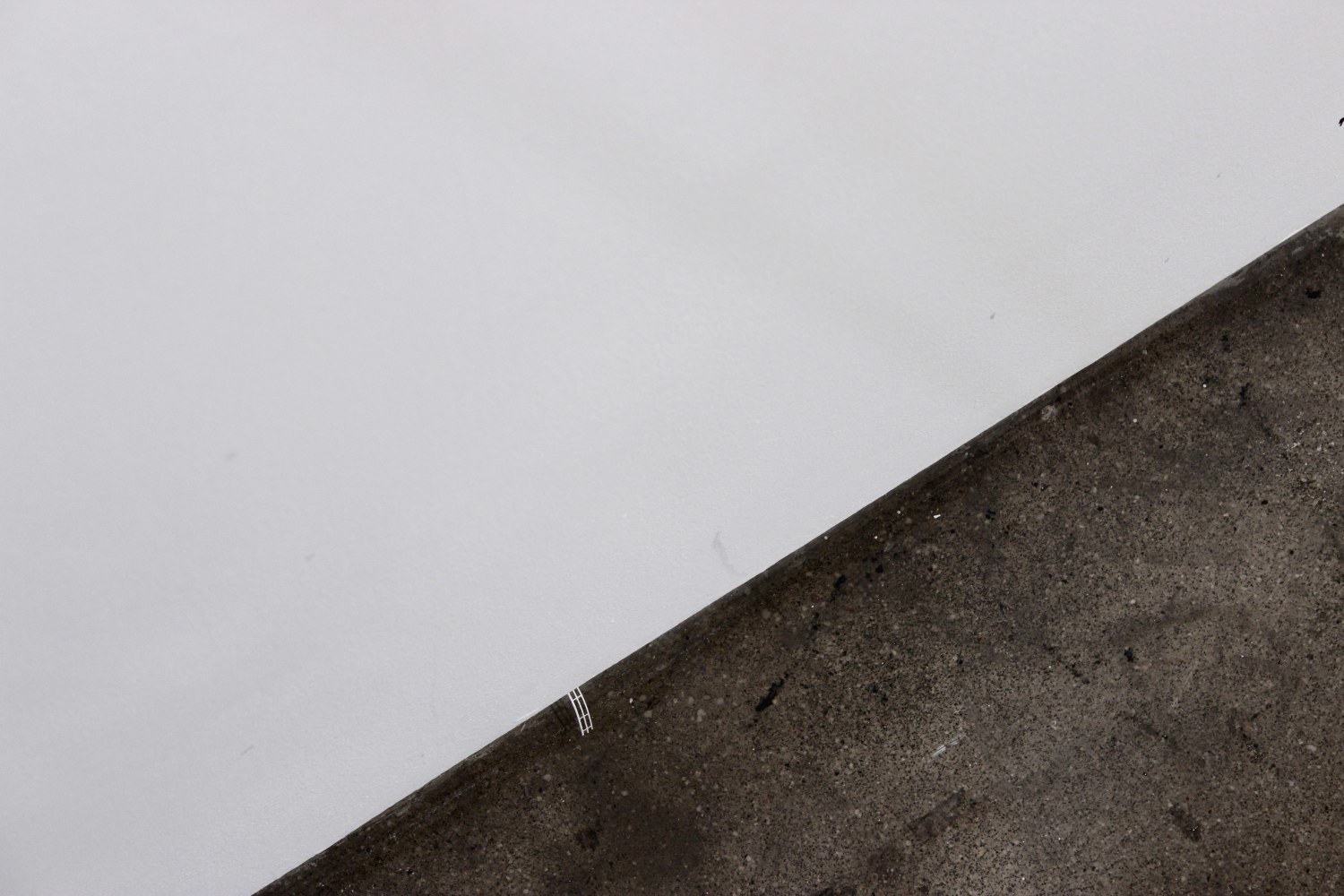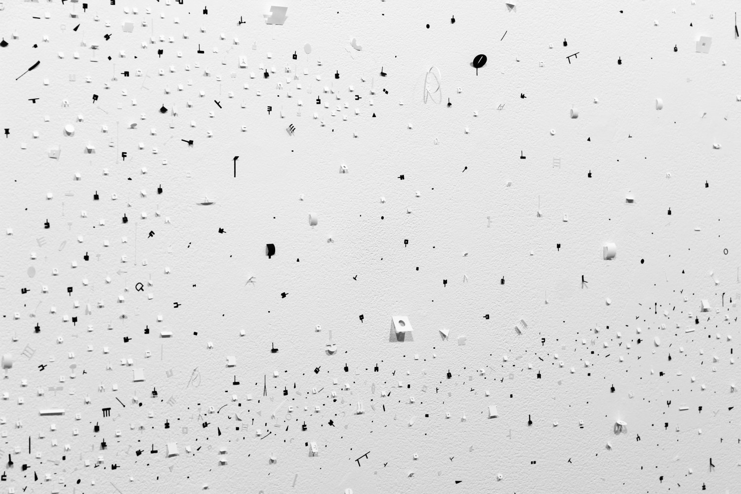 A portable kit composed of thousands of elements cut-out from self-adhesive paper becomes an insignificant alphabet folded and pasted onto the walls during the months preceding the exhibition. The diminutive papers are disseminated or connected following the traffic rules and syntax dictated by any accumulation of sediments. Some areas throughout the gallery are infected with color, the edge of the wall in red, blue or yellow, like the margins of a misprinted sheet of paper. The colonies of stickers on the walls enter in dialogue with the light upon them. Myriads of shadows and infinitesimal incandescent projections aim to slow down the viewer. The main ambition of the project is to promote pauses and make time visible.