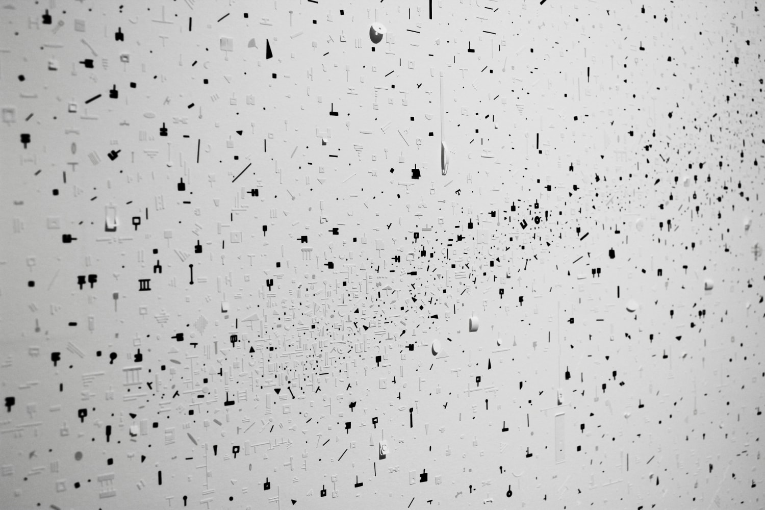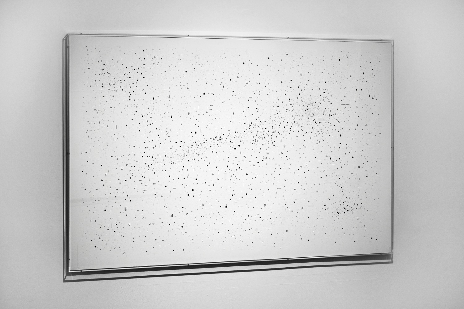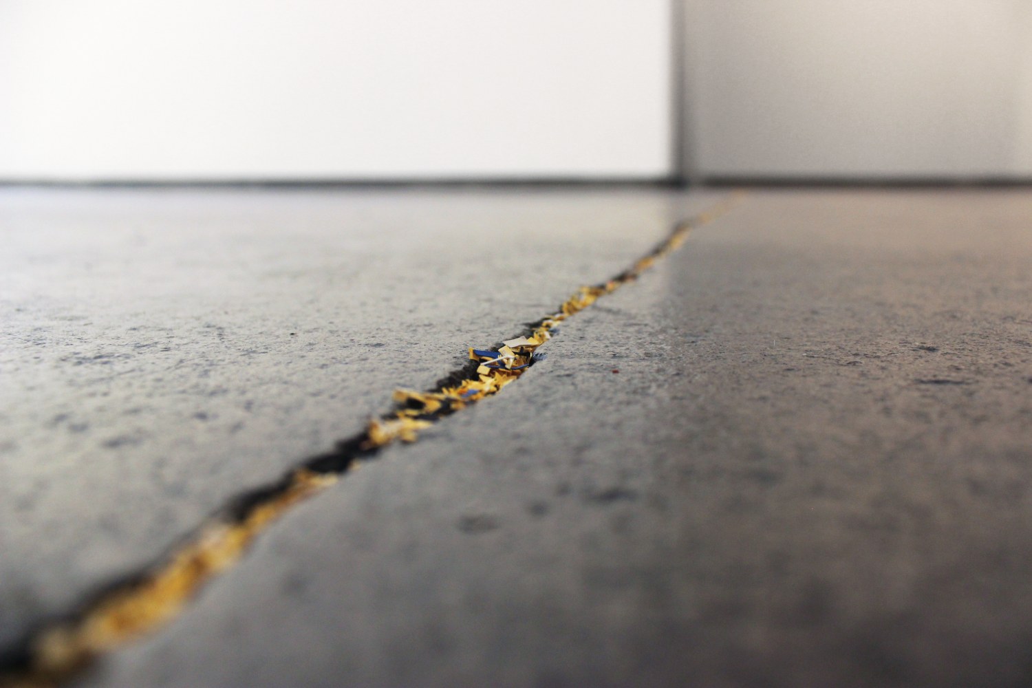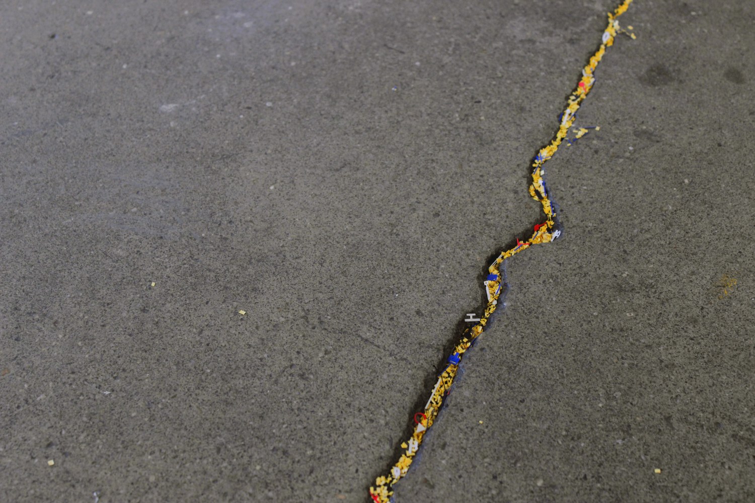 A portable kit composed of thousands of elements cut-out from self-adhesive paper becomes an insignificant alphabet folded and pasted onto the walls during the months preceding the exhibition. The diminutive papers are disseminated or connected following the traffic rules and syntax dictated by any accumulation of sediments. Some areas throughout the gallery are infected with color, the edge of the wall in red, blue or yellow, like the margins of a misprinted sheet of paper. The colonies of stickers on the walls enter in dialogue with the light upon them. Myriads of shadows and infinitesimal incandescent projections aim to slow down the viewer. The main ambition of the project is to promote pauses and make time visible.
