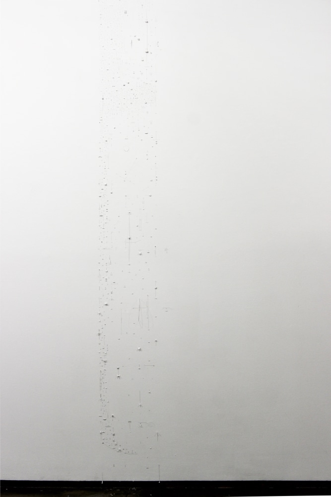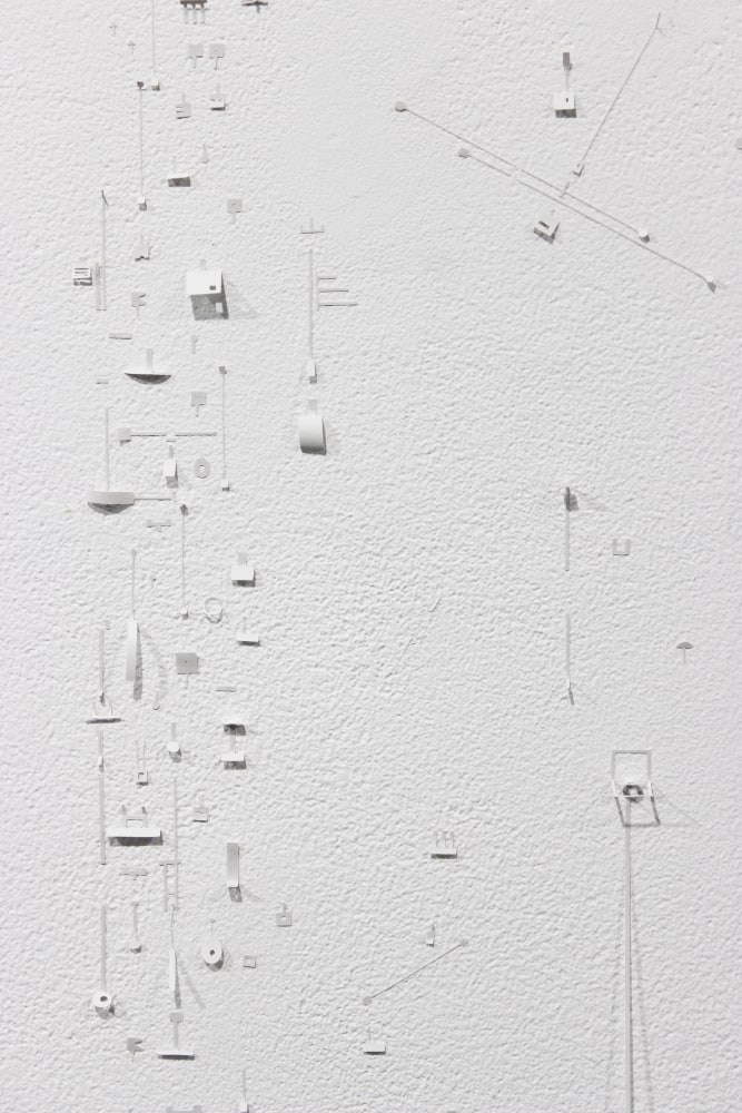 Like in the Venice pavilion, Maggi separates the two basic elements of drawing. He draws with paper on the walls in the main space, and presents an installation of pencils in a separate area. "Drawing is a dialogue with a superficy and a certain superficiality. It is a superficial discipline that allows oneself to take distance from the depths of thinking in order to de-multiply an empathy for the insignificant. Drawing for me is like writing in a language that I don't understand. I don't believe in messages or ideas. Ideas have the tendency to become fixed and aspire ultimately to the status of ideology." (Marco Maggi, 2015)