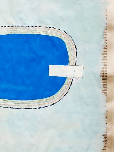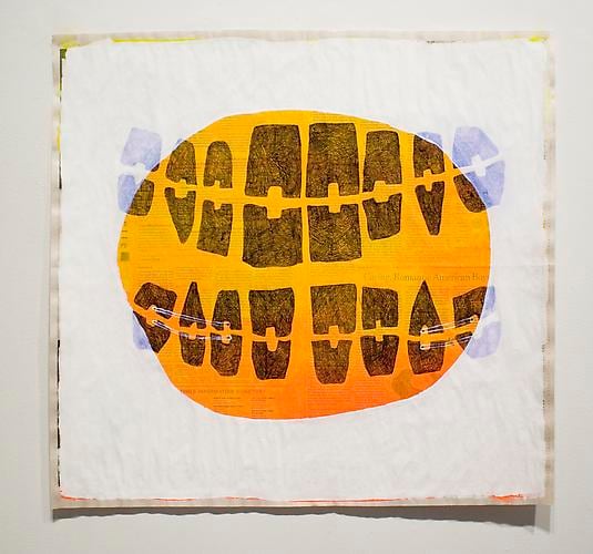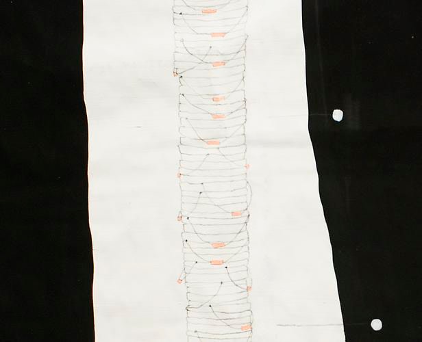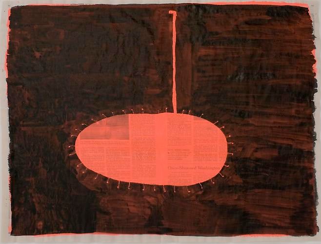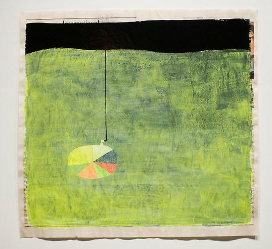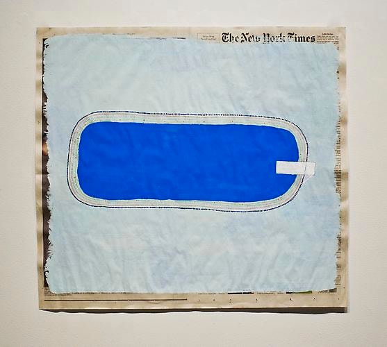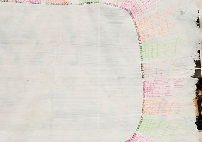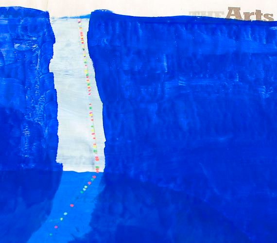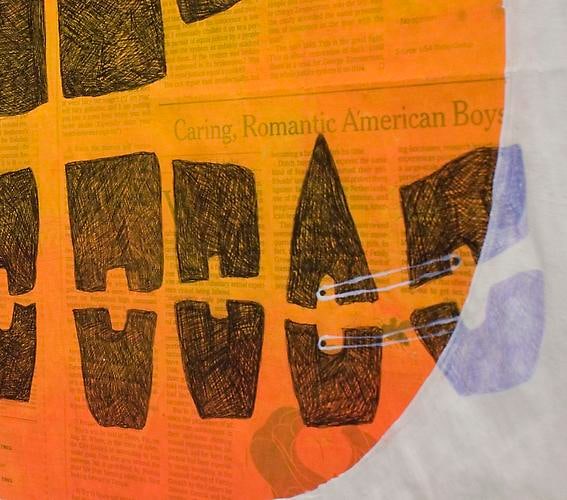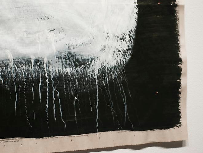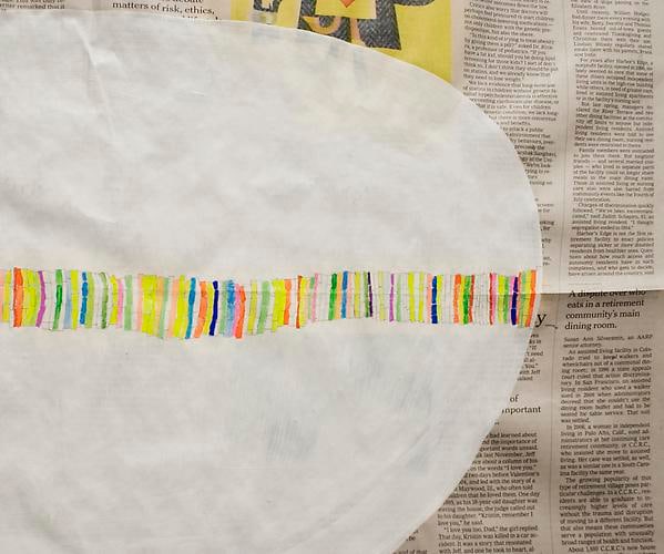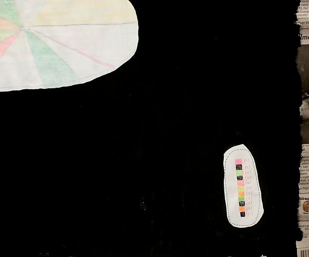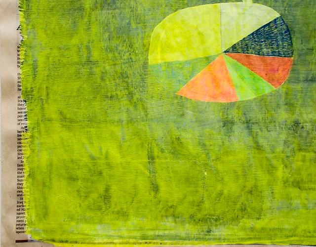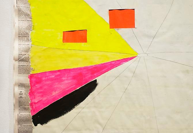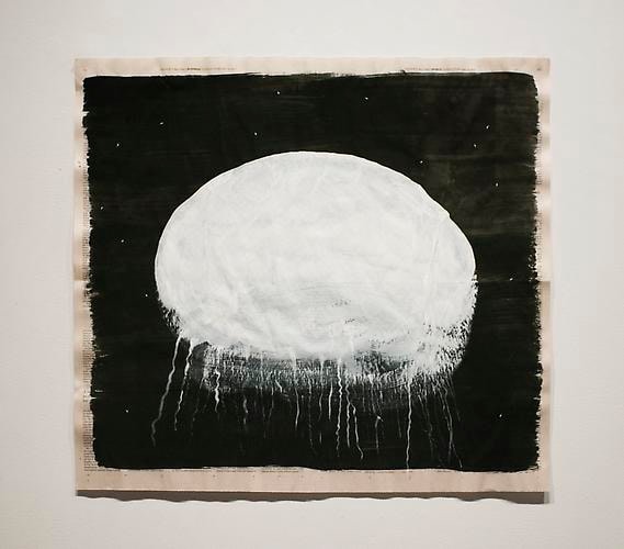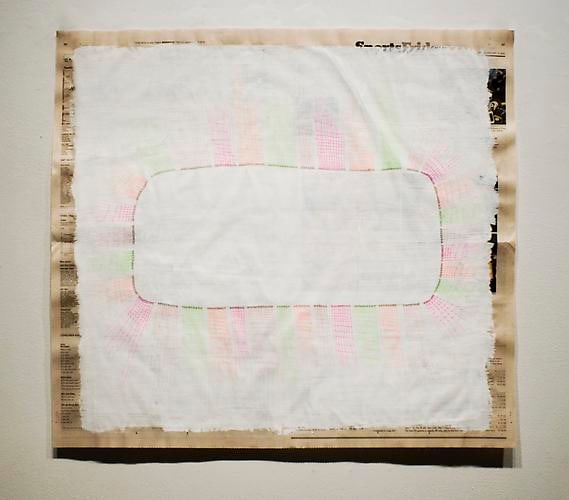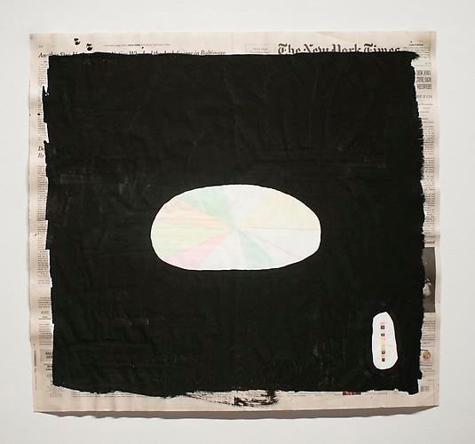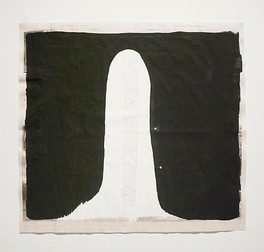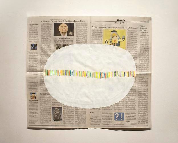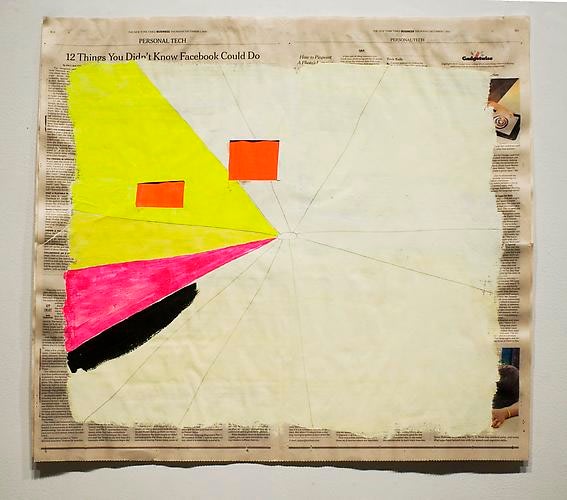 Systems, rules, problems, behaviors, and the relationship between one activity to another influence her drawing process and these unfold and develop organically as the paintings/drawings evolve. Sometimes the works reference activities that occurred in existing installations. At times these memories get exaggerated and overblown; for example, stacking small pieces of wood become stacking plastic cups on the moon. Drawing and painting on newspaper is similar to building a structure with found wood.  Newspapers come from the real world and a larger system that is constantly in motion. Each sheet is dated and considered recorded history although it becomes immediately disposable as old news. The existing information on the newspaper provides a point of departure for the drawings. Even if most of the information is ultimately covered up, it is layered underneath and still affects the drawing on many levels.