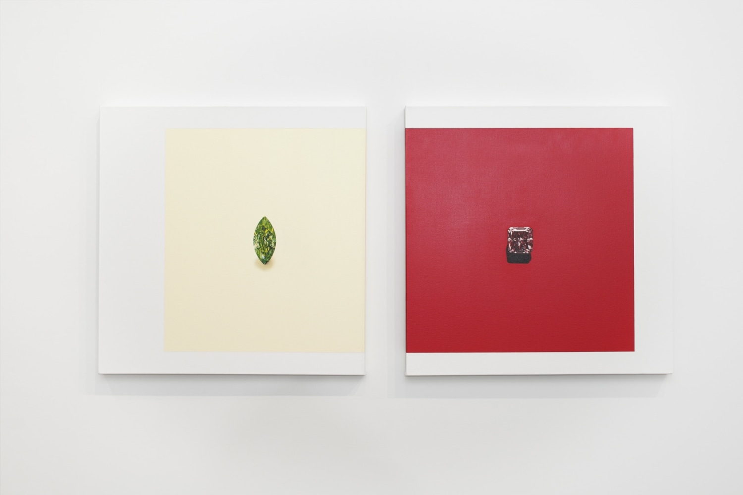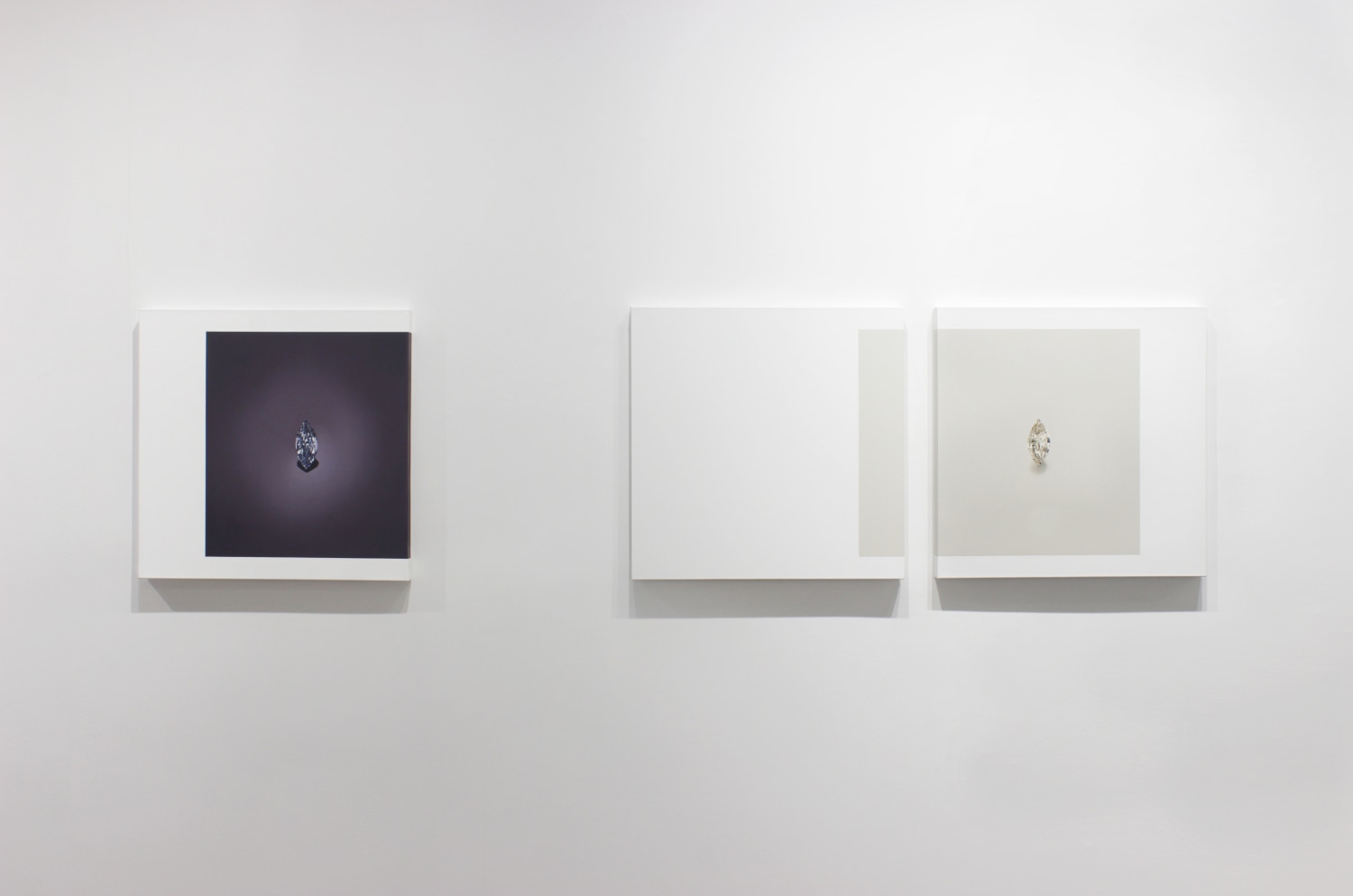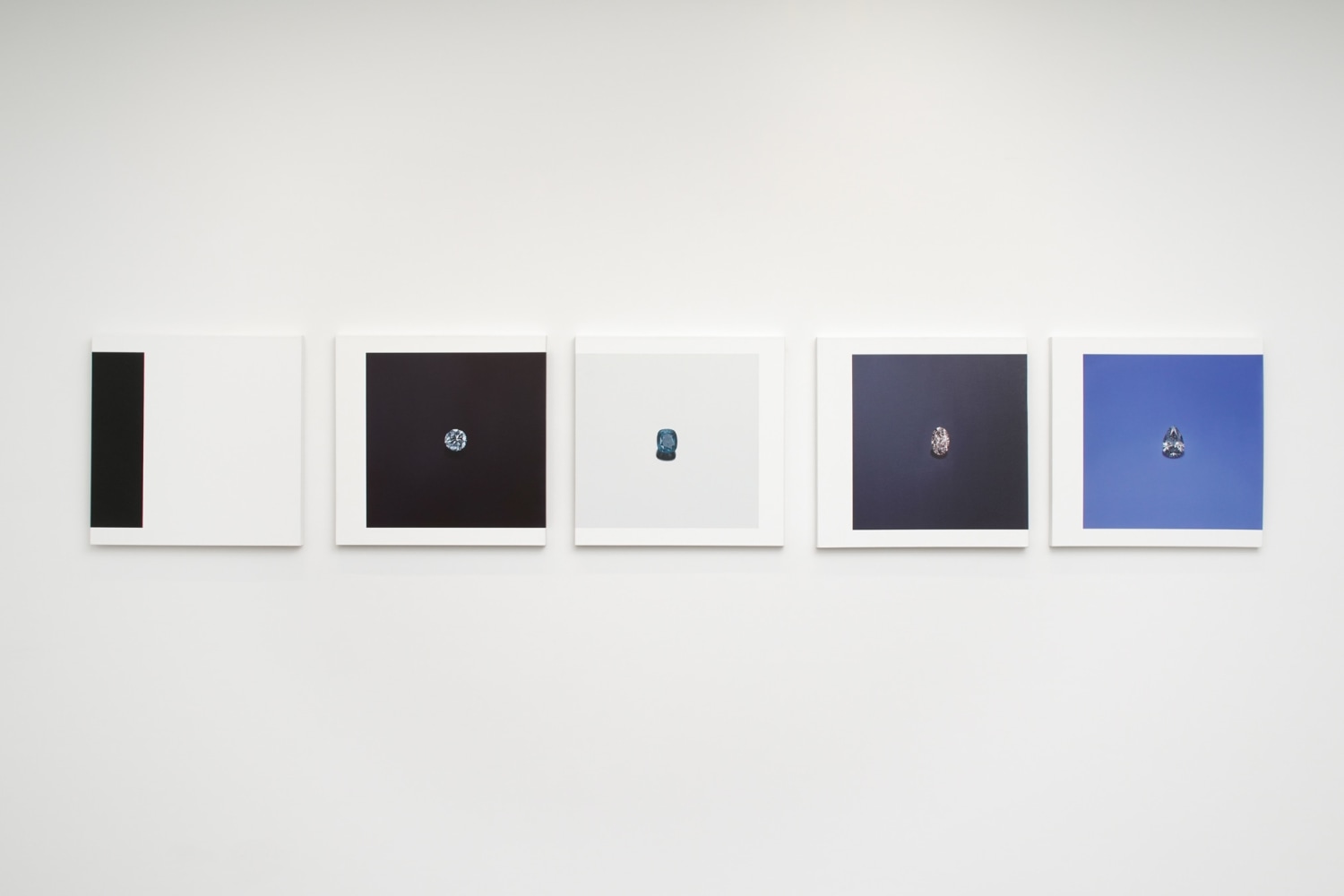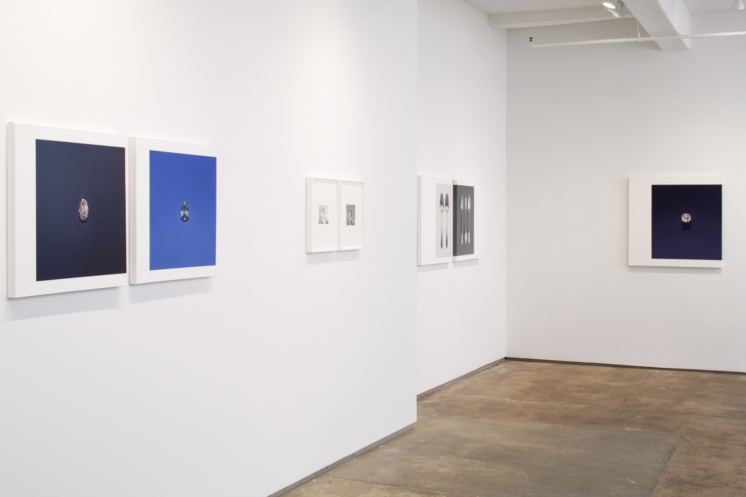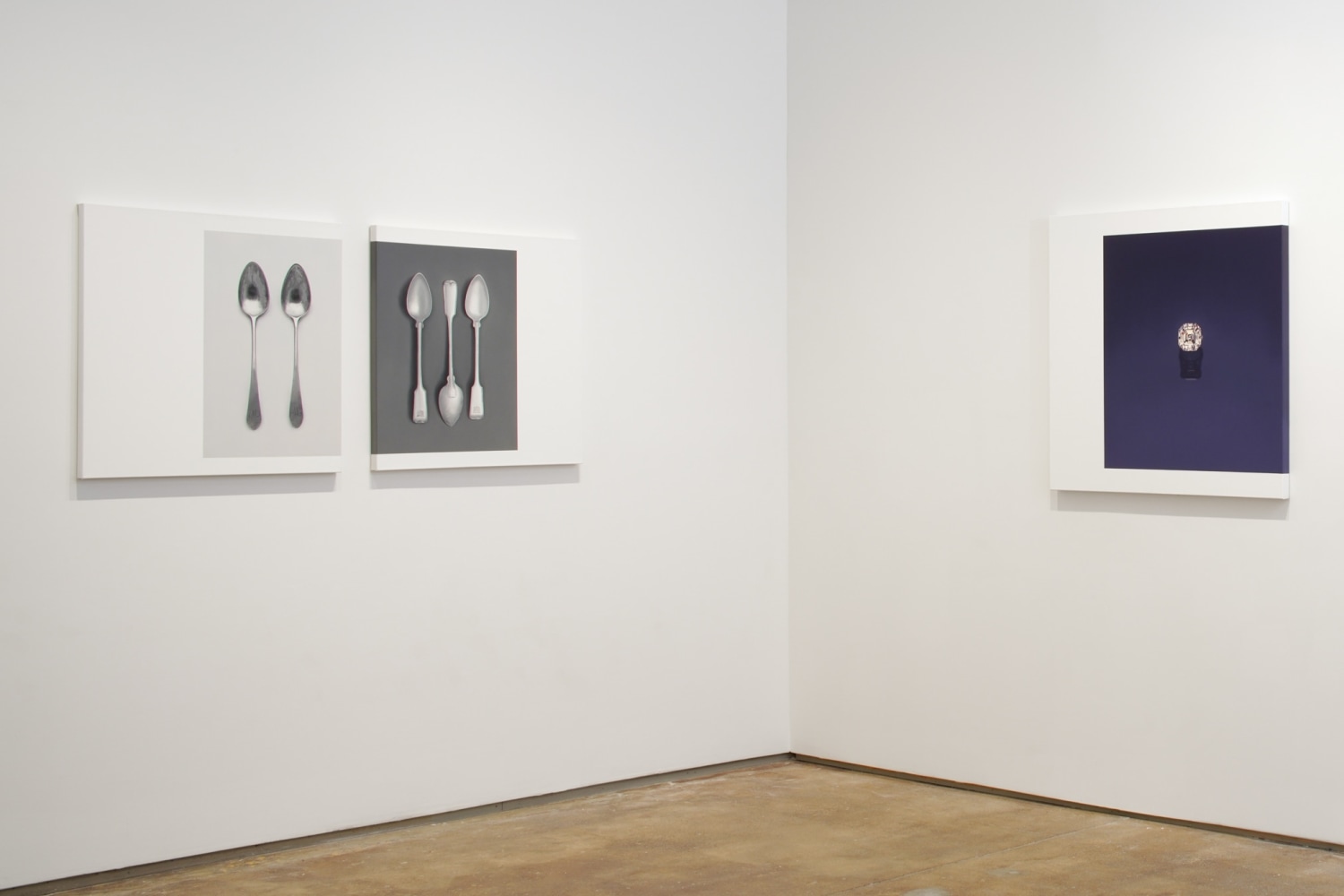 Upon entering the space, a collection of oil paintings unfolds onto the wall and reads as a continuous strip. The paintings are based on print auction catalogs, namely Christie’s and Sotheby’s, of fine antique silver and luxury jewelry. The catalogues span from the early-1970’s to the late-1990’s. They contain all analog photography and period-specific graphic design, typography, and layout. They depict spoons, ladles, diamonds, emeralds and sapphires. Easily mistaken for photographs, the paintings ask the viewer to take a second, longer look, resisting the kind of cursory viewing prevalent today. The titles alone, drawn verbatim from the object and lot descriptions, are often difficult to read, resist easy reproduction, and often cause confusion. They require the viewer to slow down and reconsider what they are looking at. Why this, why now? Painted with high fidelity to realism, they become aesthetic objects of labor themselves, mapping out a paradoxical connection to the functions of authorship. On one hand, they are close reproductions or appropriations of readymade images. On the other hand, they represent the labor, time and material substances that went into them, creating a “third object” after the original one and the photograph, haunting the original, a history with multiple temporalities.