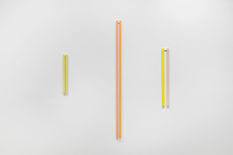 The exhibition features a set of new works from the Ripas series alongside some of Sister’s very first Caixas from 1996 which were the defining formats of his art practice in the last decade. The artists proceeds with his ongoing exploration of color, light, and monochromes, in an interplay between surface and three-dimensionality. In the Caixas series, Sister painted over wooden fruit boxes both appropriating ordinary materials while intuiting spatial reconfigurations. The color bands of the Caixas series interact with light and dark, color and depth while interacting with the three-dimensionality of the objects simple nature; what the artist himself describes as “a coexistence of solidarity, with more differentiation and complexity.”