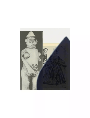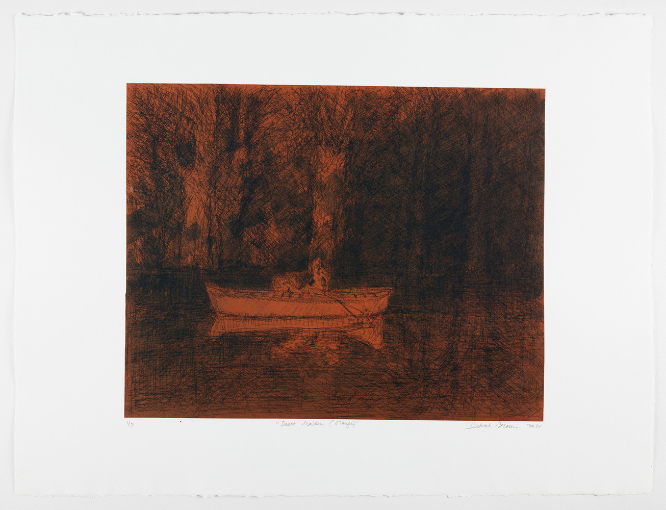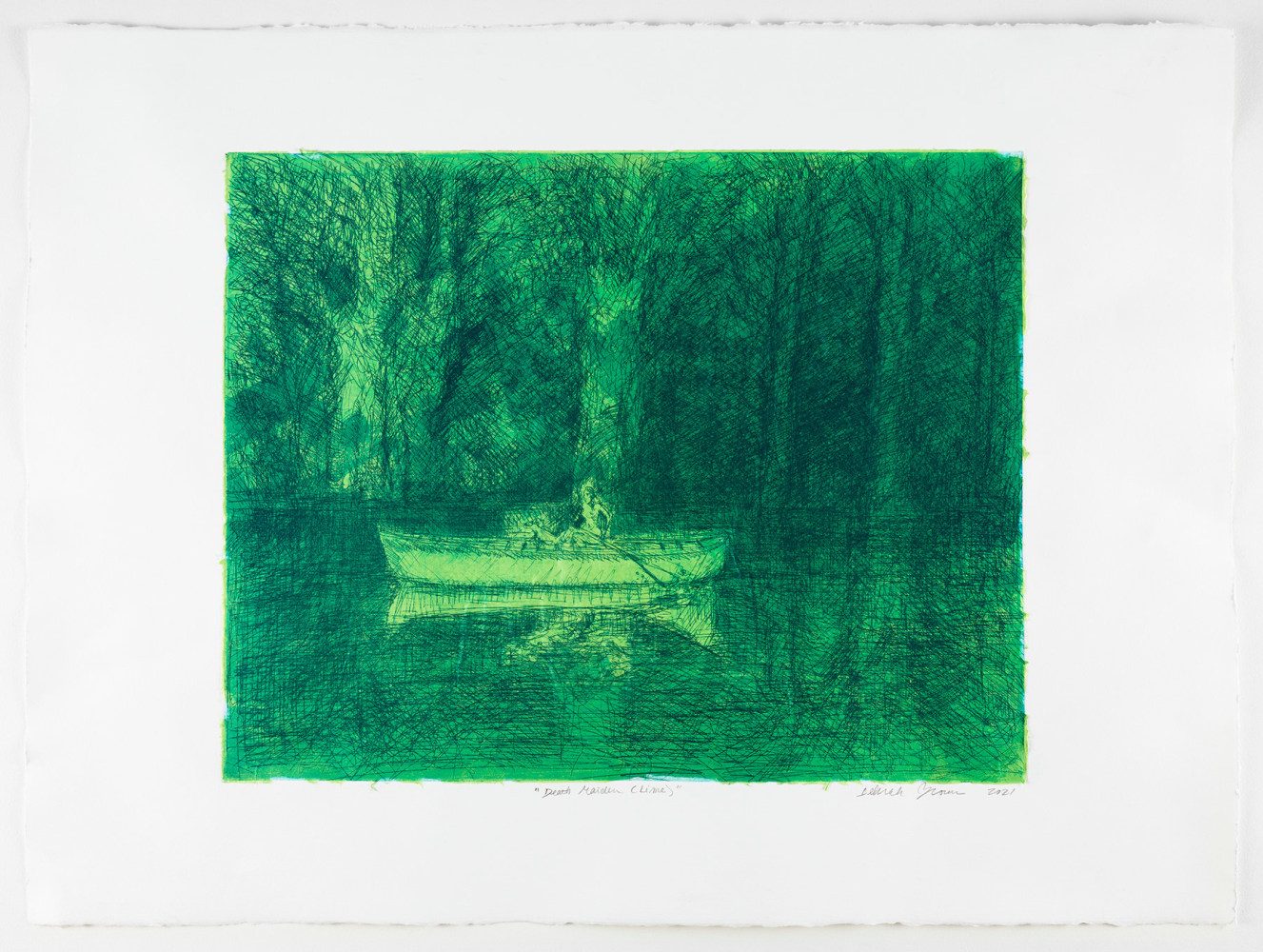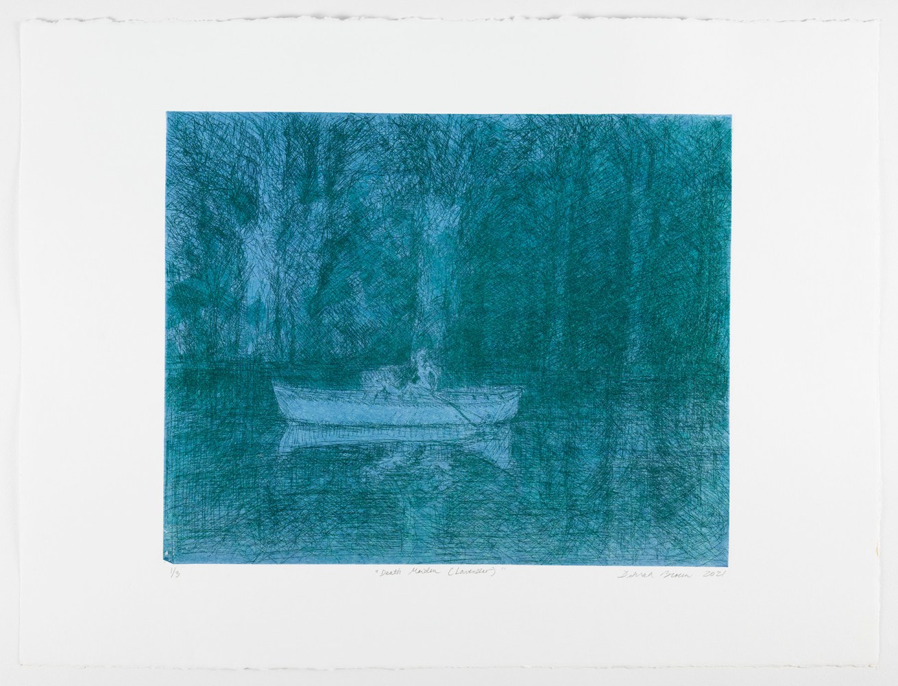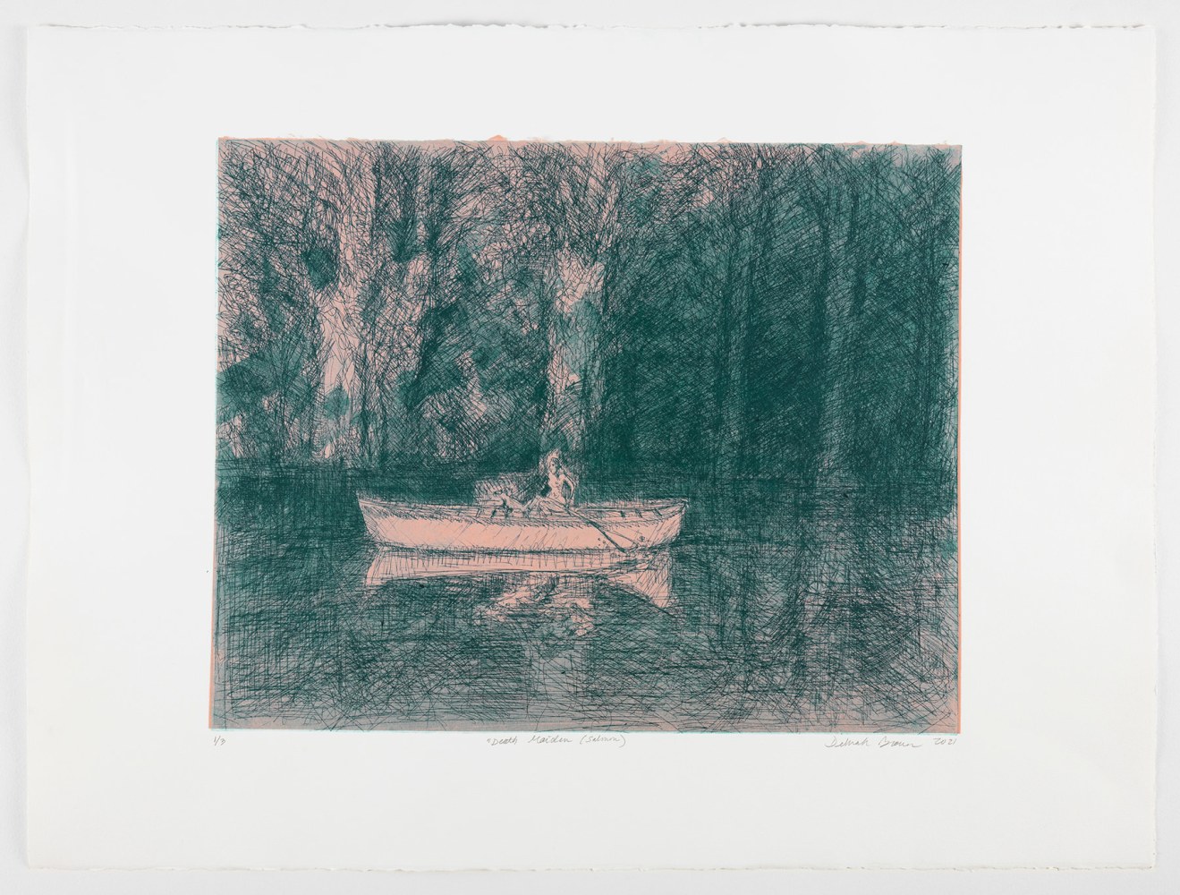 Also included in the exhibition are recent Eminence Grise editions that hint at narratives that are never made fully explicit. Deborah Brown’s Death Maiden, depicting a naked canoeist and her dog paddling on a lake in a forbidding forest, evokes a haunted journey. Editioned in aquatint and chine-collé, each color variant engenders a chromatic series of emotional responses. Using a recently invented digital technology, Daniella Dooling’s assemblages of abandoned surgical masks poses questions about the fate of both the individuals who once wore them and about the anxieties of our pandemic dominated culture. Sara Jimenez’s monumental Radiating from a dark cloud..., is a montage of various photographs from American colonial texts about the Philippines, inspired by staged portraits by American and European photographers of the Filipinx population during the early 1900s.
