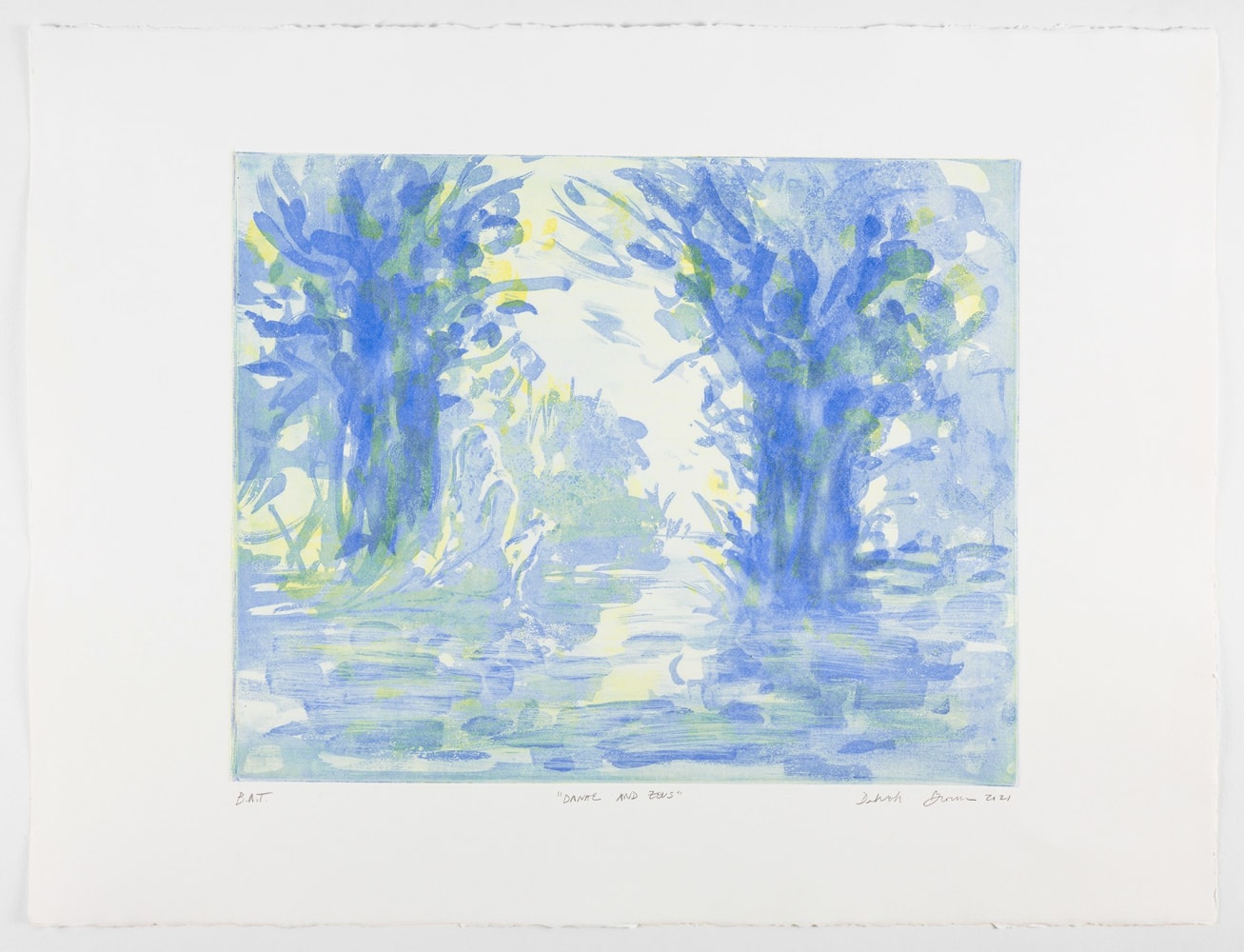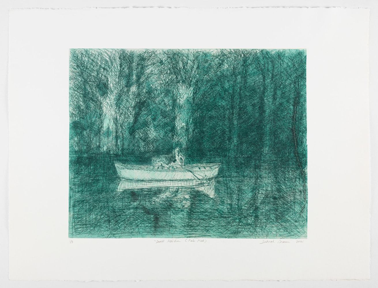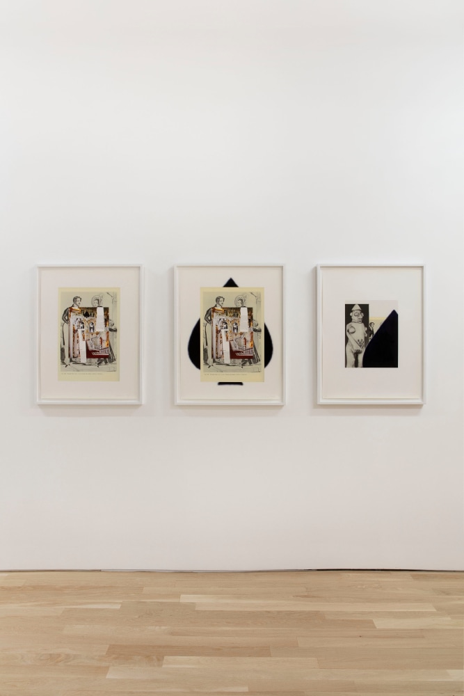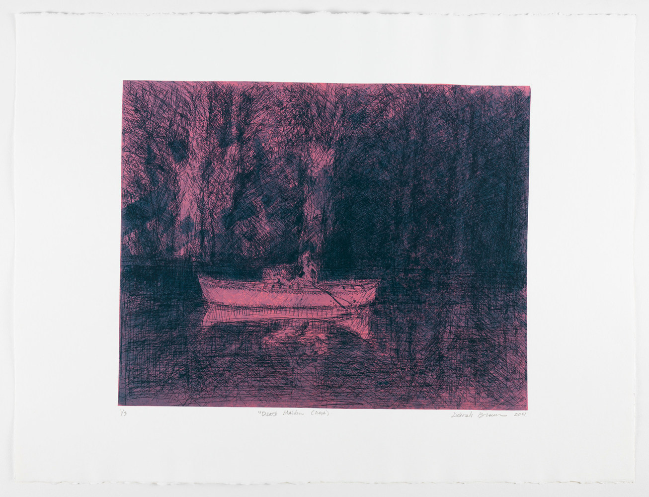 Also included in the exhibition are recent Eminence Grise editions that hint at narratives that are never made fully explicit. Deborah Brown’s Death Maiden, depicting a naked canoeist and her dog paddling on a lake in a forbidding forest, evokes a haunted journey. Editioned in aquatint and chine-collé, each color variant engenders a chromatic series of emotional responses. Using a recently invented digital technology, Daniella Dooling’s assemblages of abandoned surgical masks poses questions about the fate of both the individuals who once wore them and about the anxieties of our pandemic dominated culture. Sara Jimenez’s monumental Radiating from a dark cloud..., is a montage of various photographs from American colonial texts about the Philippines, inspired by staged portraits by American and European photographers of the Filipinx population during the early 1900s.